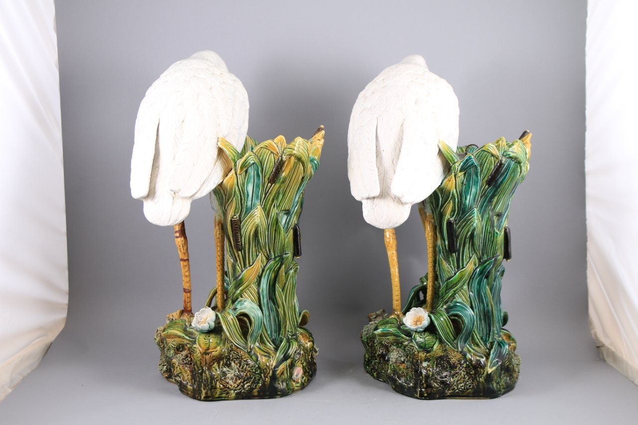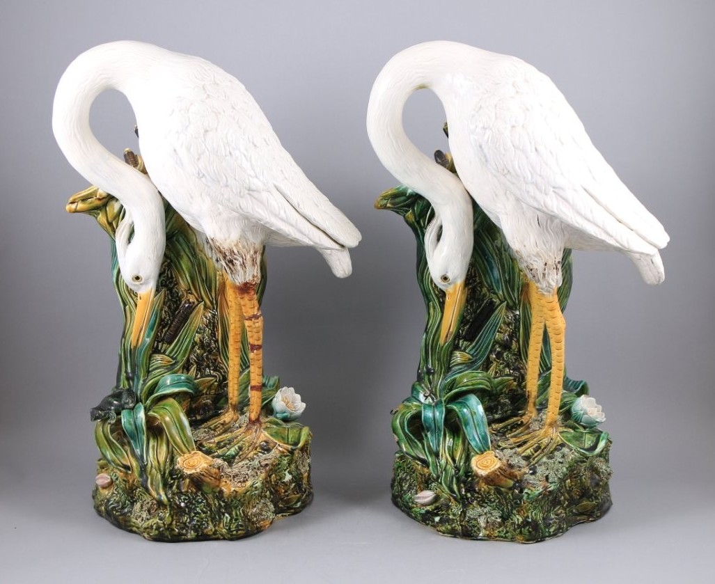 Notre paire de porte-parapluie s'inscrit parmi la production de la seconde moitié du XIXe siècle, parmi lesquelles se retrouvent les réalisations de Delphin Massier à Vallauris ou Paul Colomera à Choisy-le-Roi. L'un comme l'autre proposent des compositions où se mêlent des hérons dans un environnement de végétation aquatique. Ce thème dépasse les frontières pour se retrouver également en Angleterre, à la manufacture de Minton.