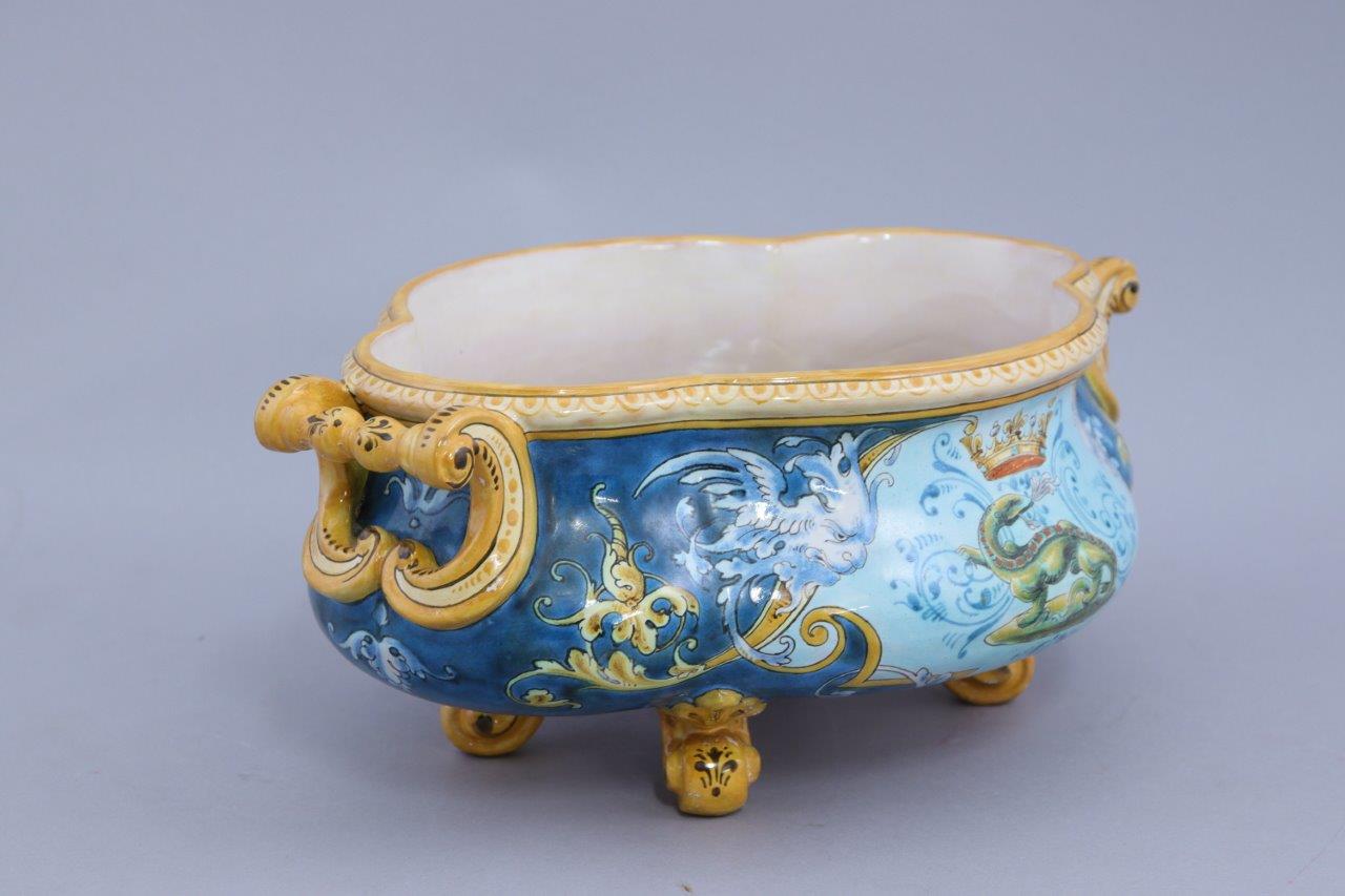 en faïence polychrome de forme quadrilobée à deux anses. La panse à décor sur une face d'un cuir aux armes de France entourée de feuilles de chêne dans un cartouche et sur l'autre d'une salamandre sous une couronne. Elle repose sur quatre pieds en enroulements.