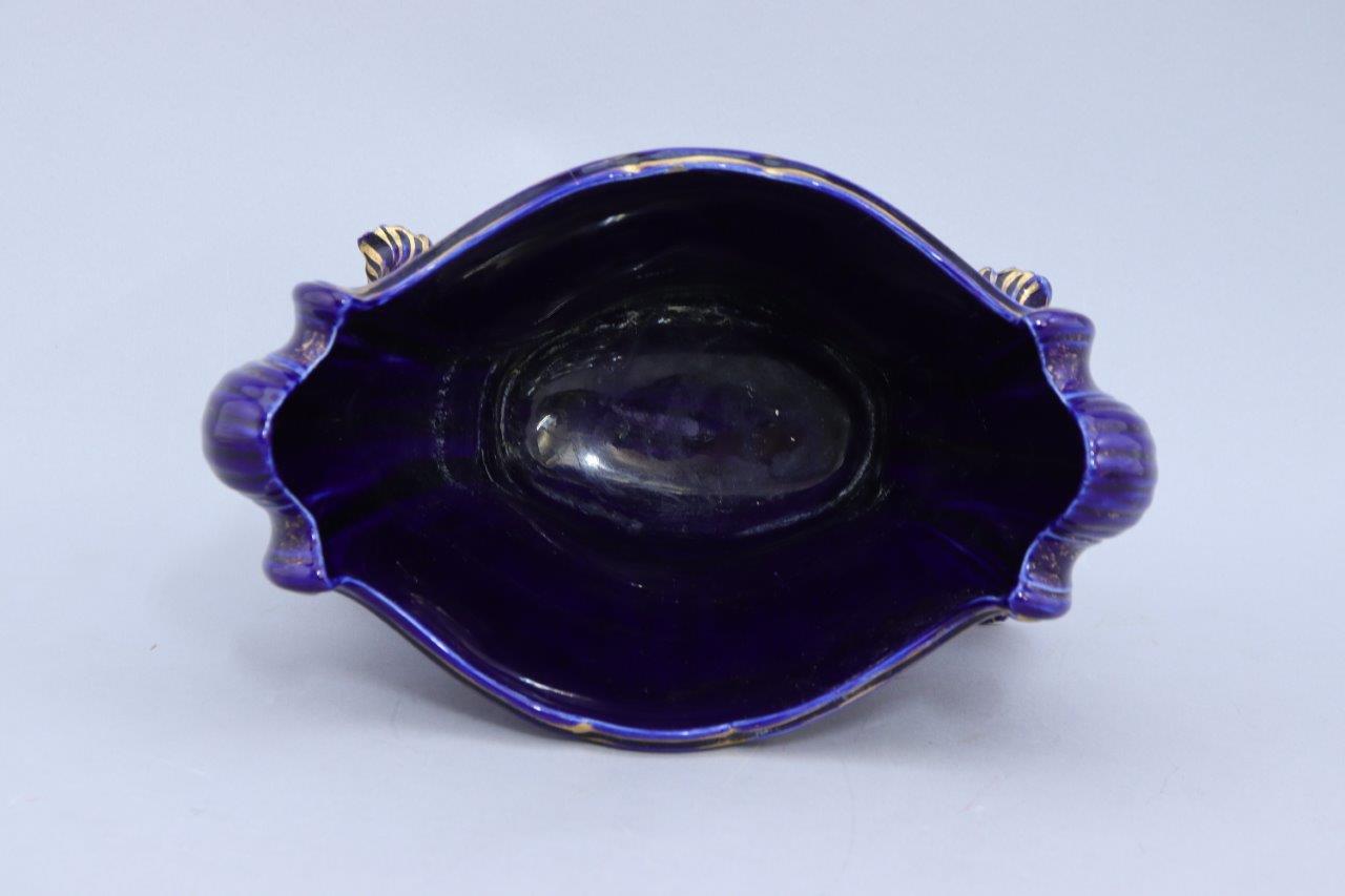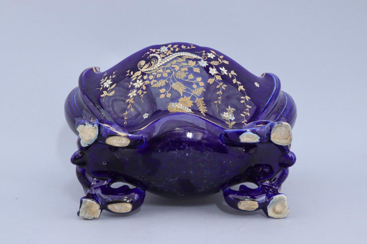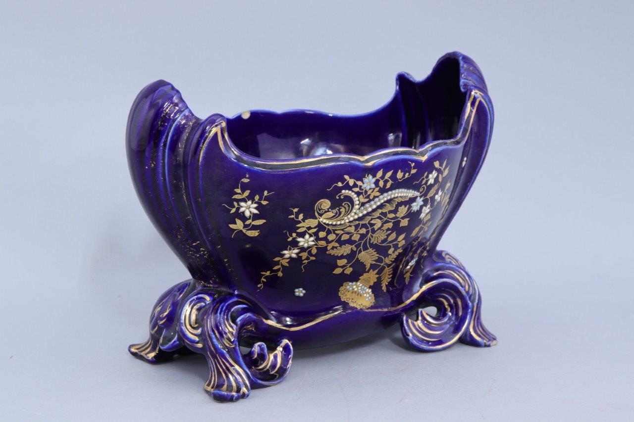 Joint: Jardinière en faience bleue de forme oblogue à la lèvre contournée, la panse décorée d'une branche fleurie réhaussée de pastilles blanches et turquoises. Quatre pieds rocailles. Haut. 20 Long. 29,5 Prof. 18 cm. (égrenures).