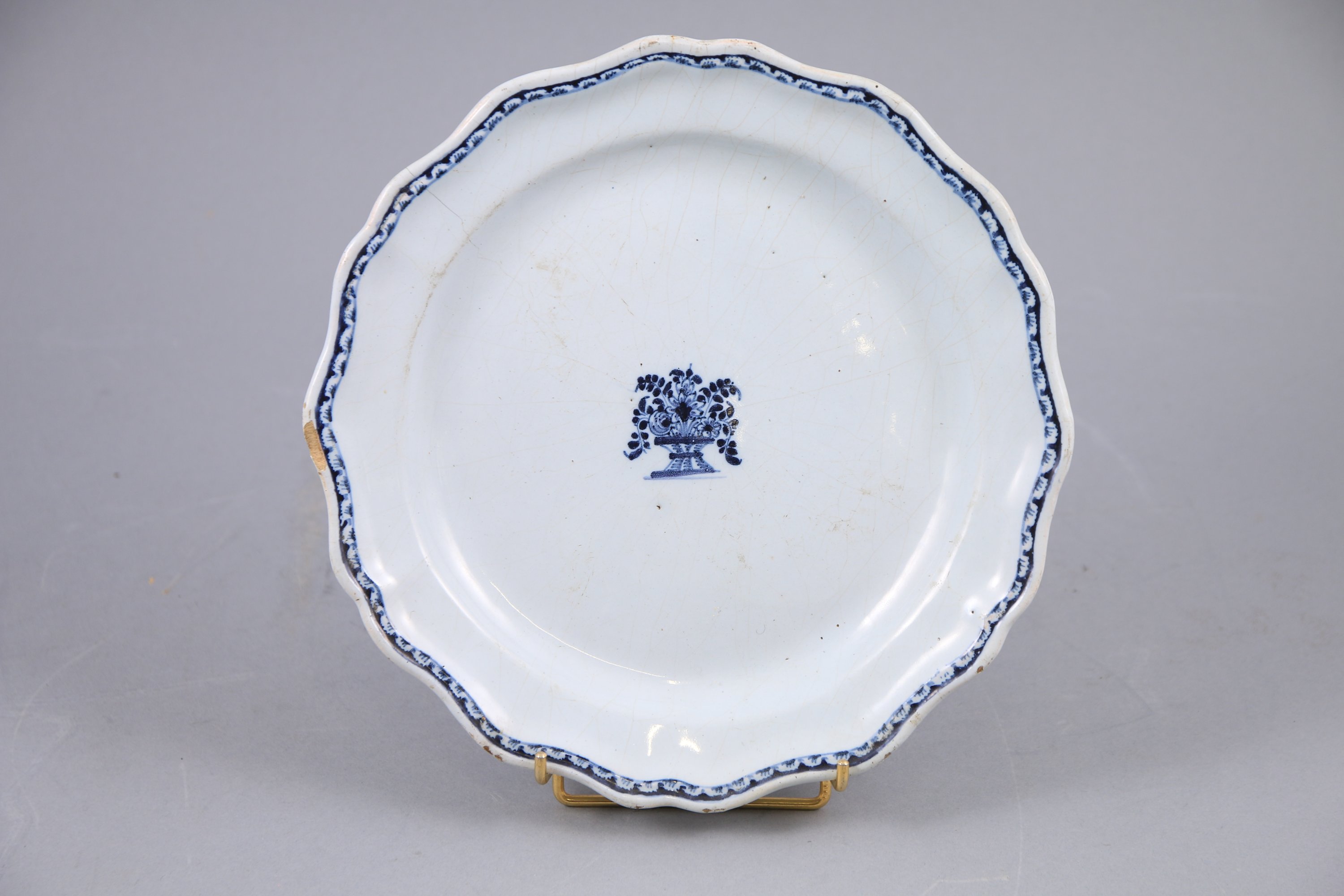 à bord contourné en faïence à motif d'un panier fleuri central et bordure en forme de coquille.