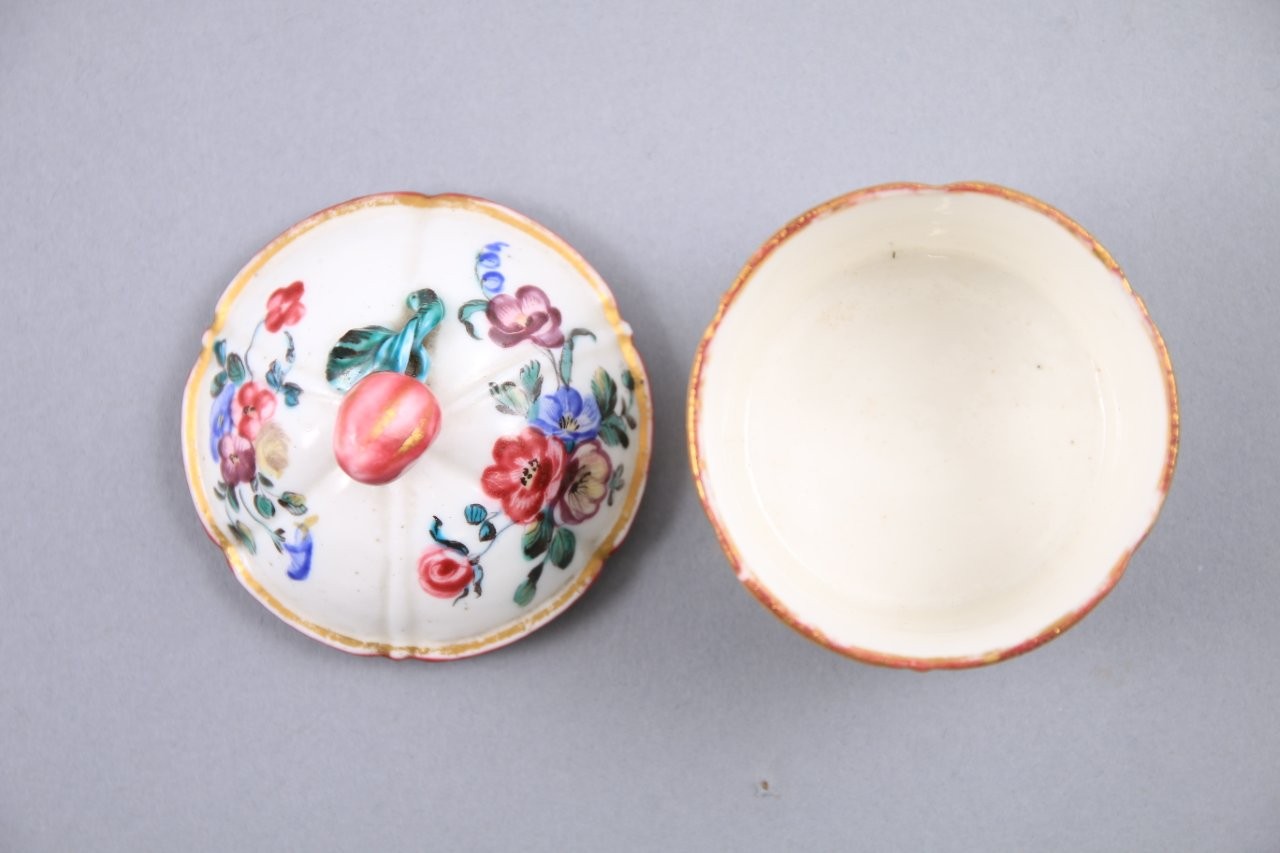 en porcelaine blanche et polychrome de forme polylobée à décor de bouquets de fleurs. Le couvercle au fretel en forme de fruit.