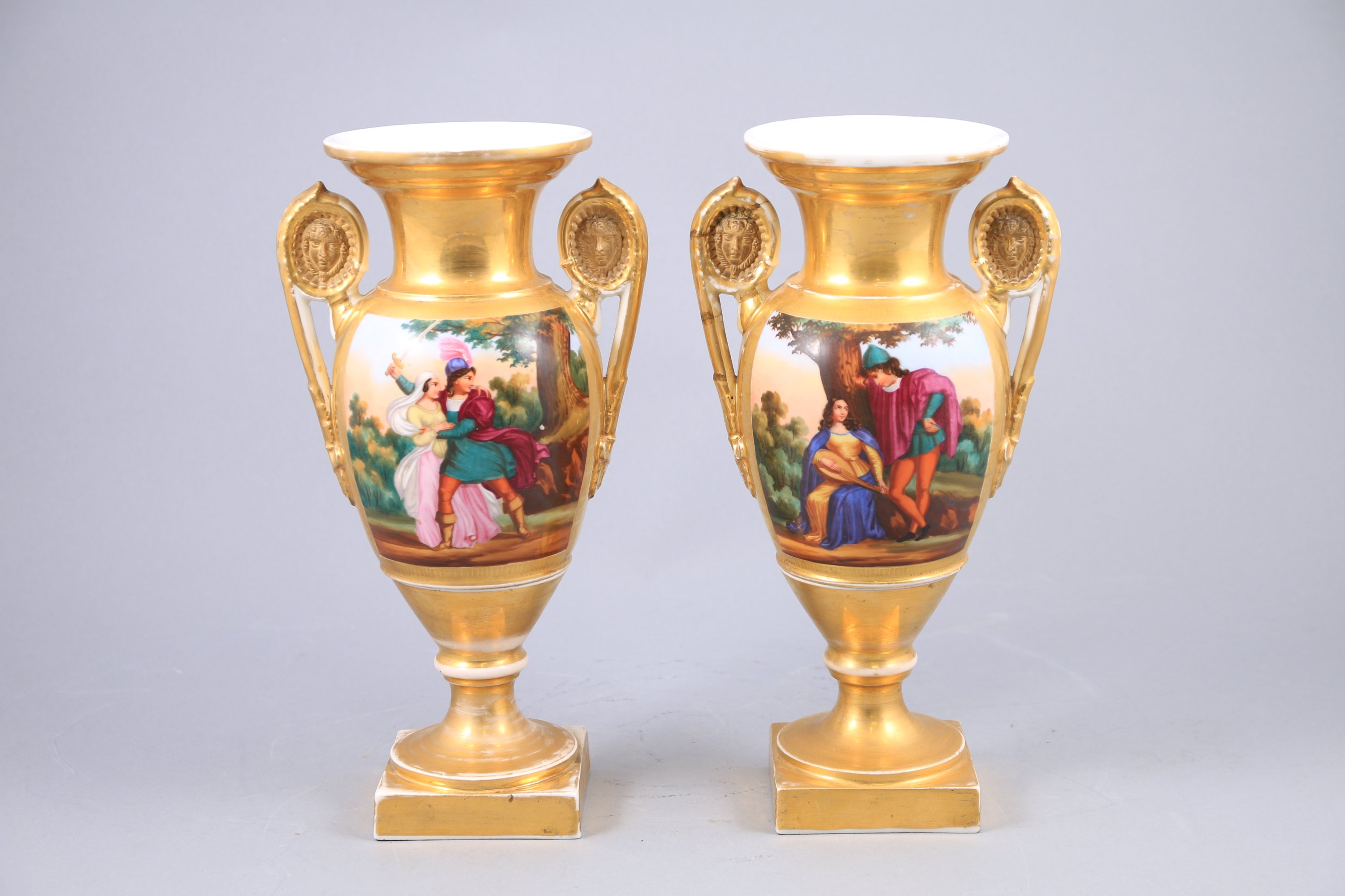 en porcelaine dorée, aux anses à décor de têtes d'homme. Ils sont ornés sur une face de paysages, sur l'autre de scènes romantiques aux troubadours.