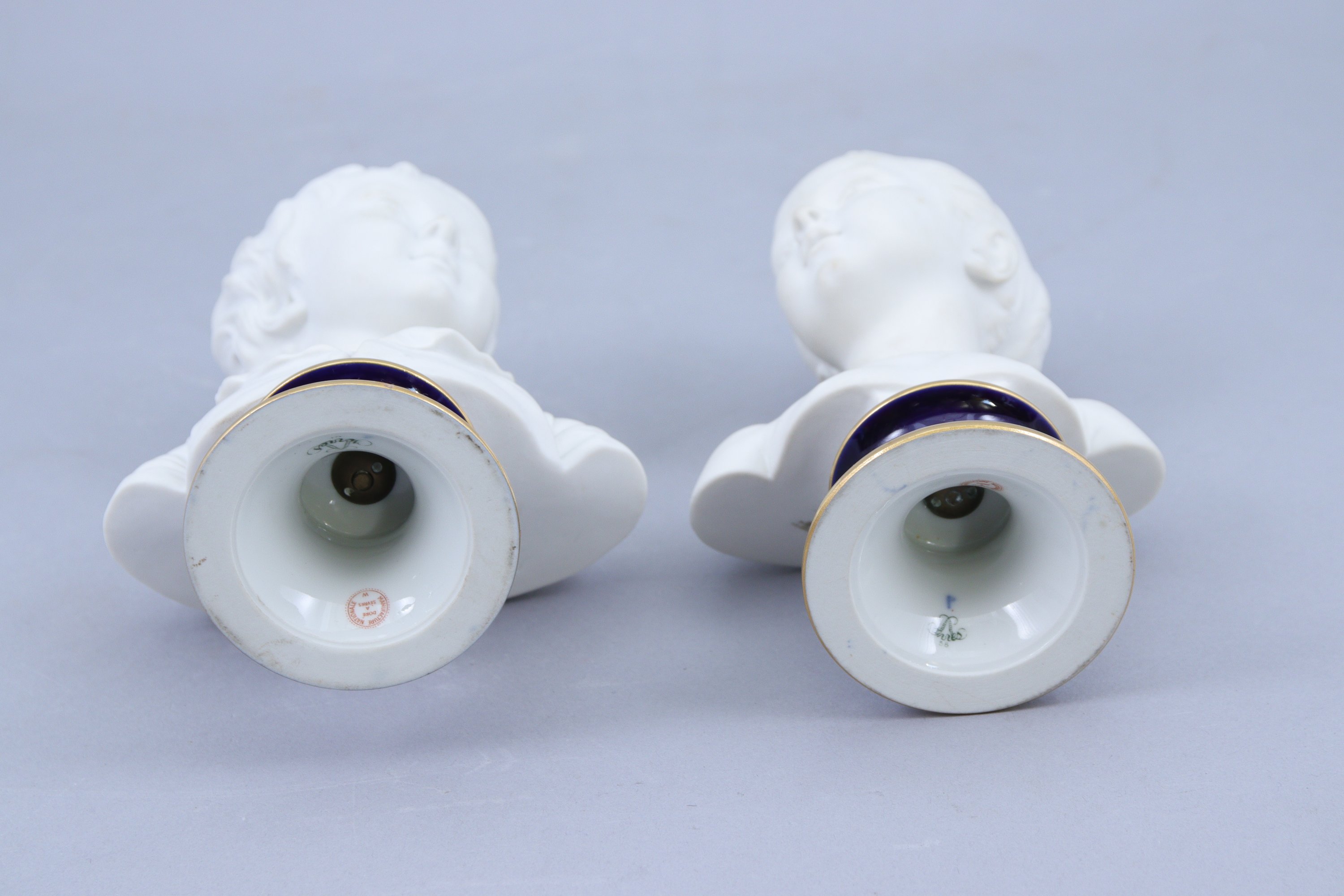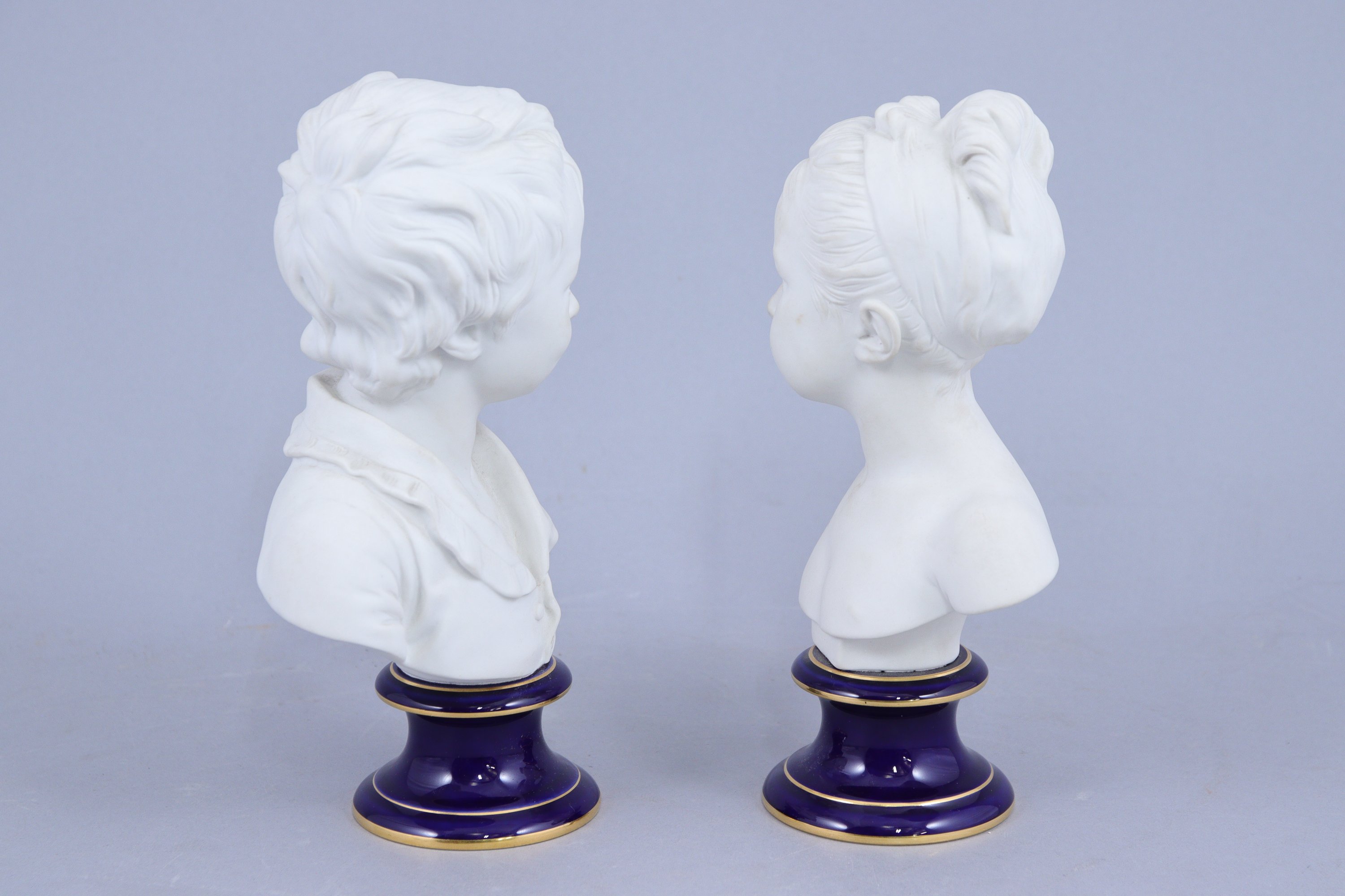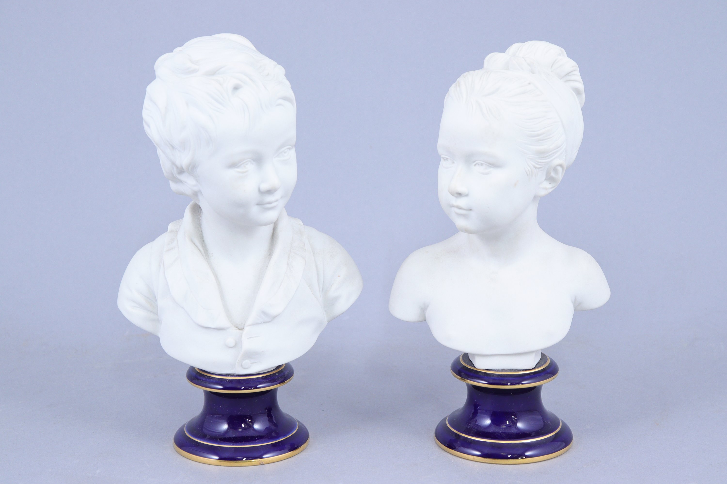 Deux bustes en biscuit reposant sur des piédouches en porcelaine bleue de Sèvres et filets dorés.