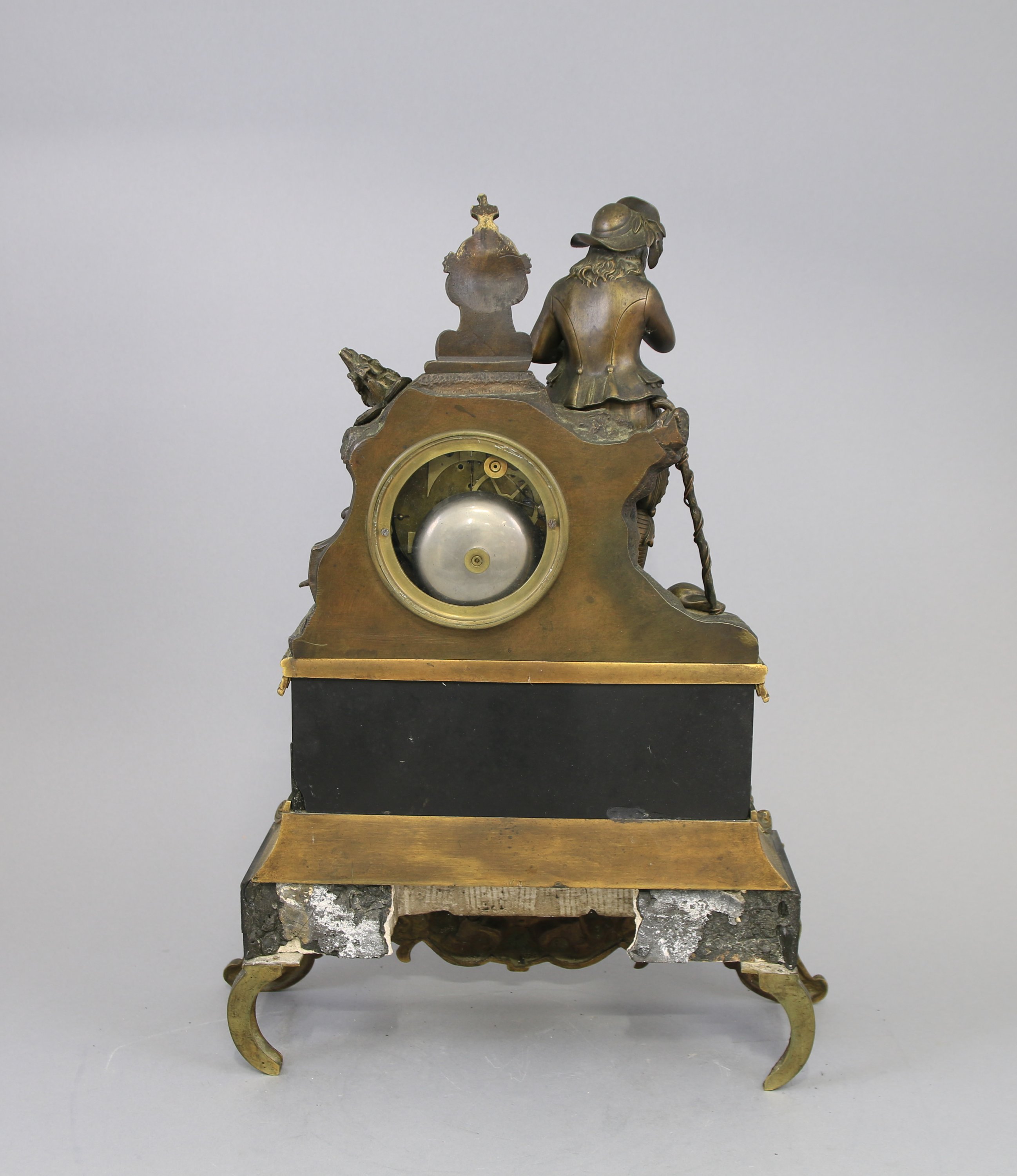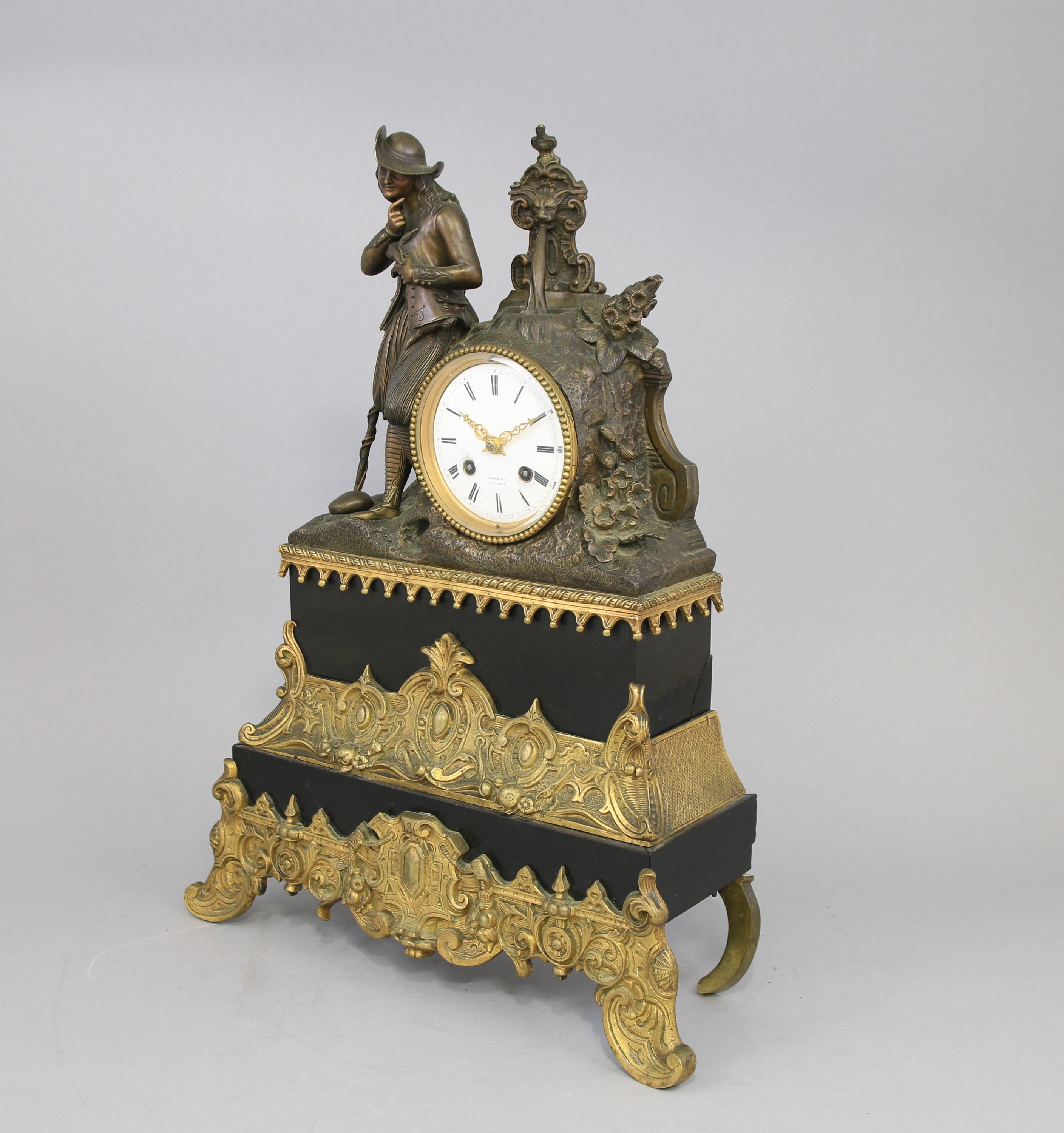 en marbre et bronze. Le cadran émaillé blanc, signé "Picherie à Saumur", indique les heures en chiffres romains, les minutes par un chemin de fer. Il est inscrit dans un rocher et supporté par une base surmontée d'une galerie de pinacles. Le piétement rectangulaire à riche décor d'enroulements et motifs de cuir. Suspension à Brocot.