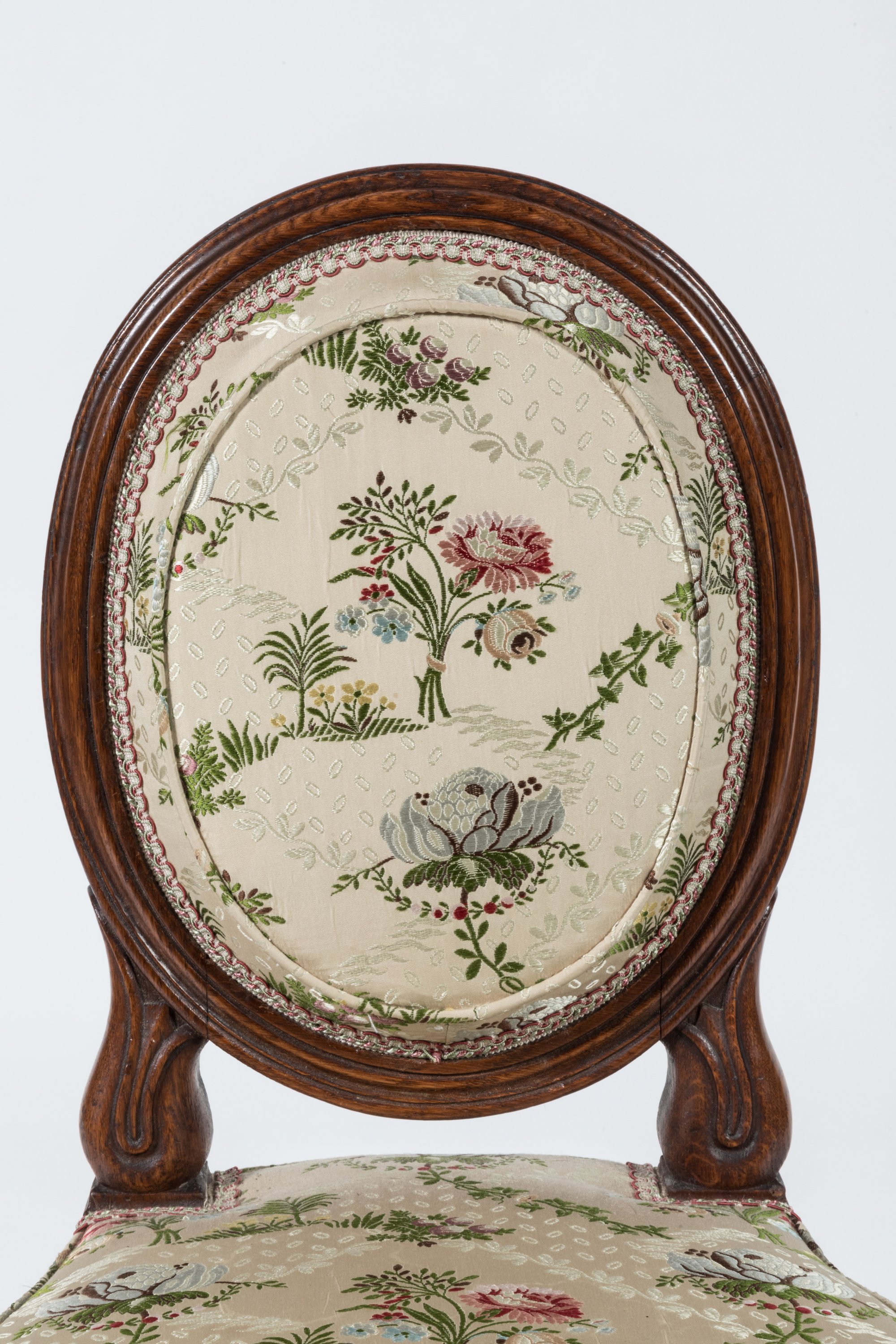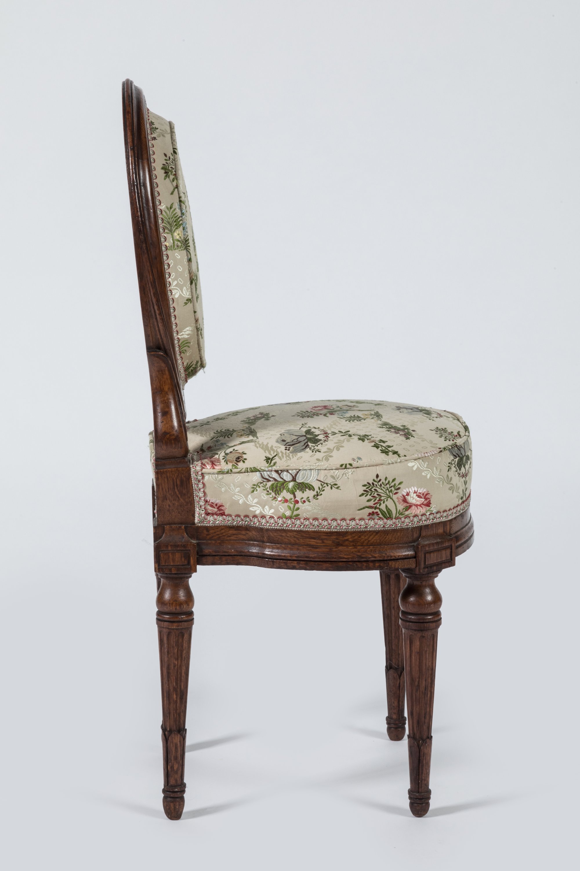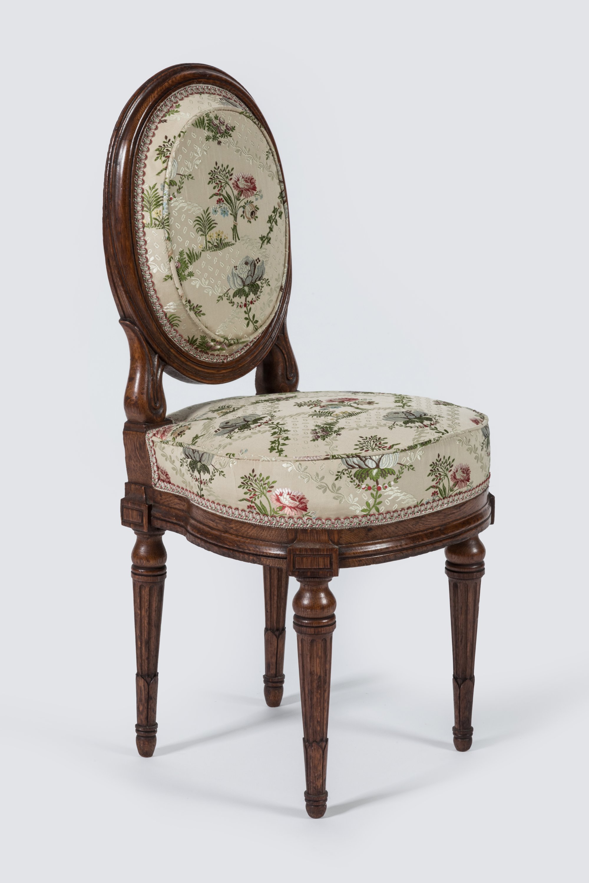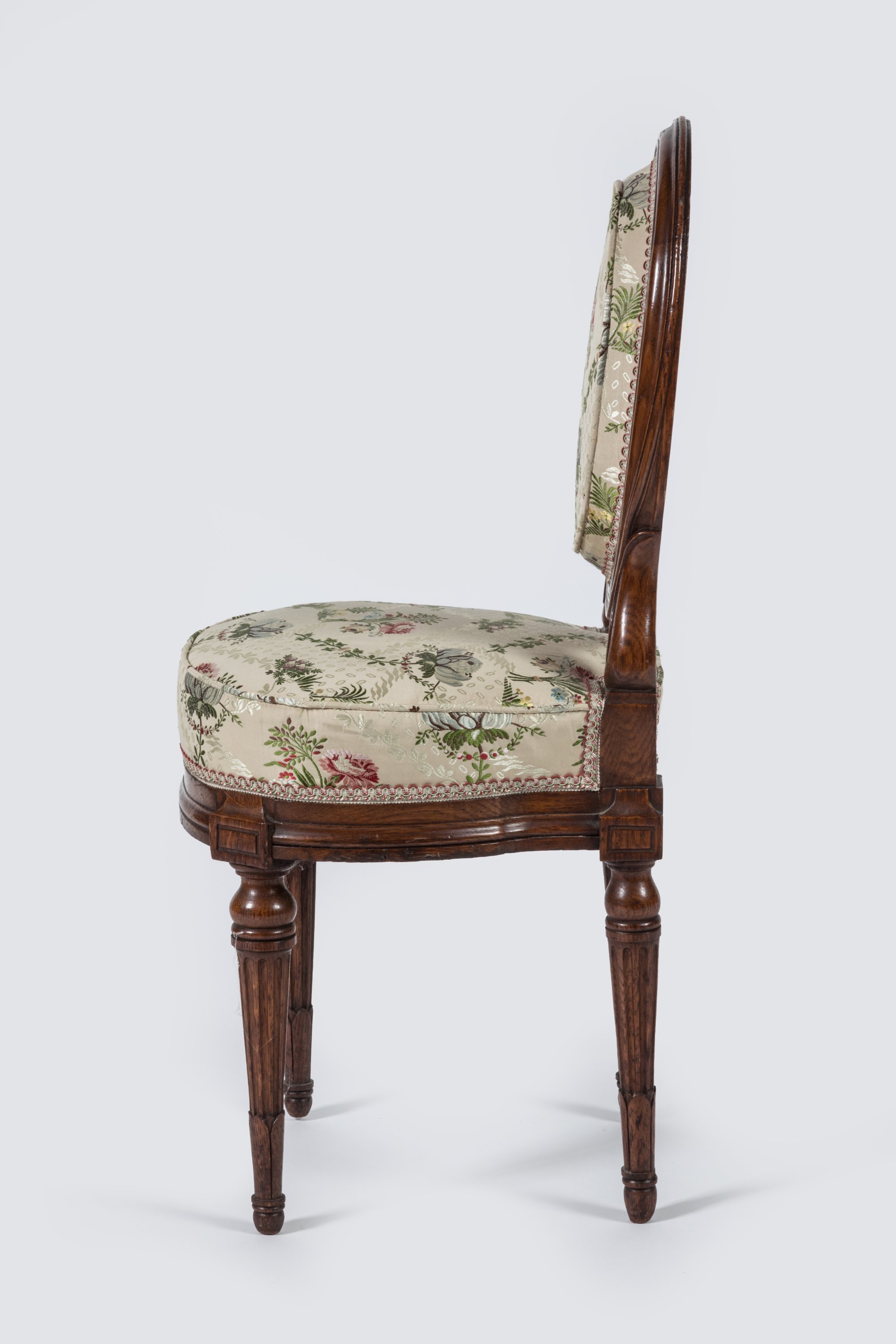en chêne mouluré et sculpté, au dossier en médaillon et assise en fer à cheval. Elle repose sur quatre pieds cannelés et fuselés.