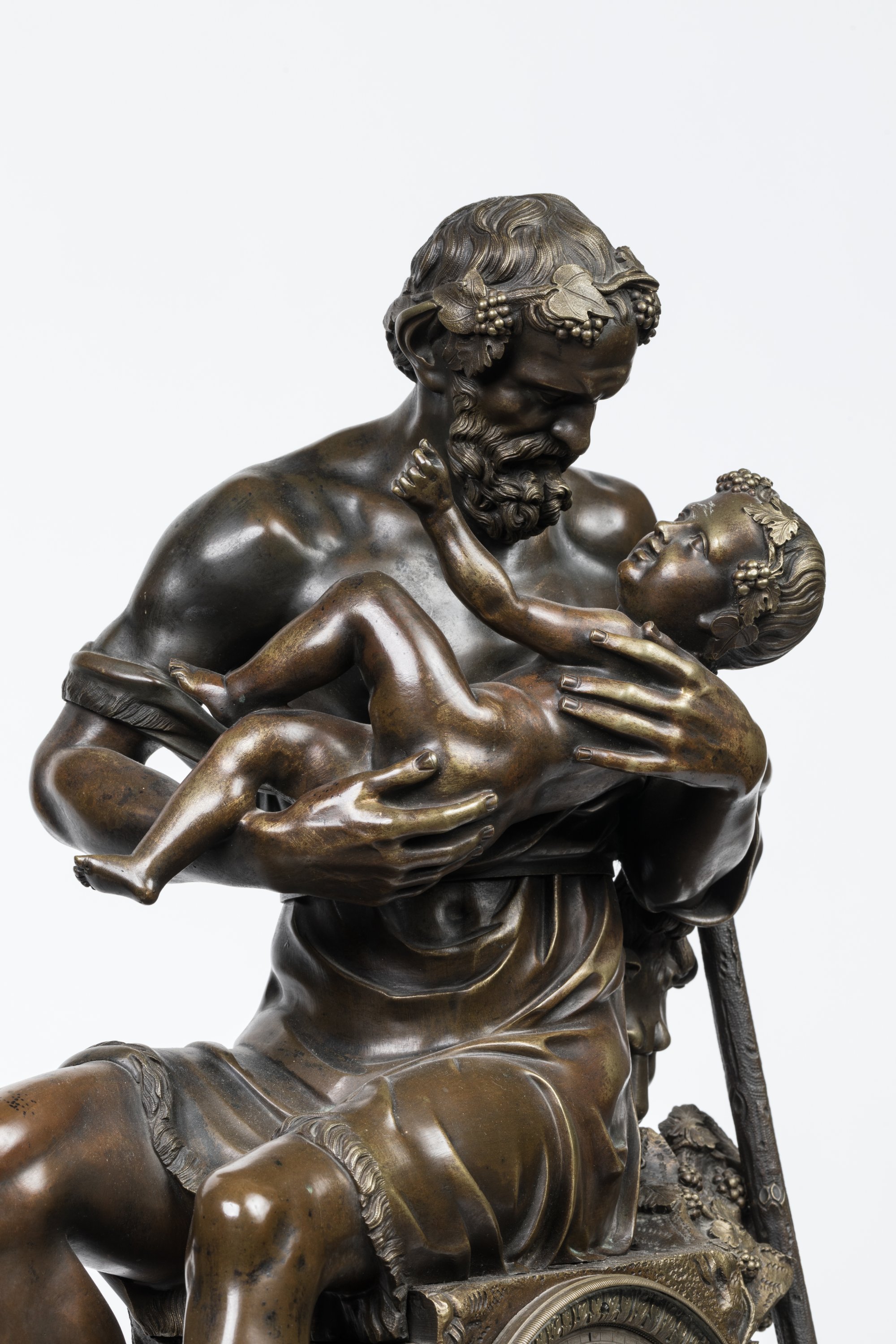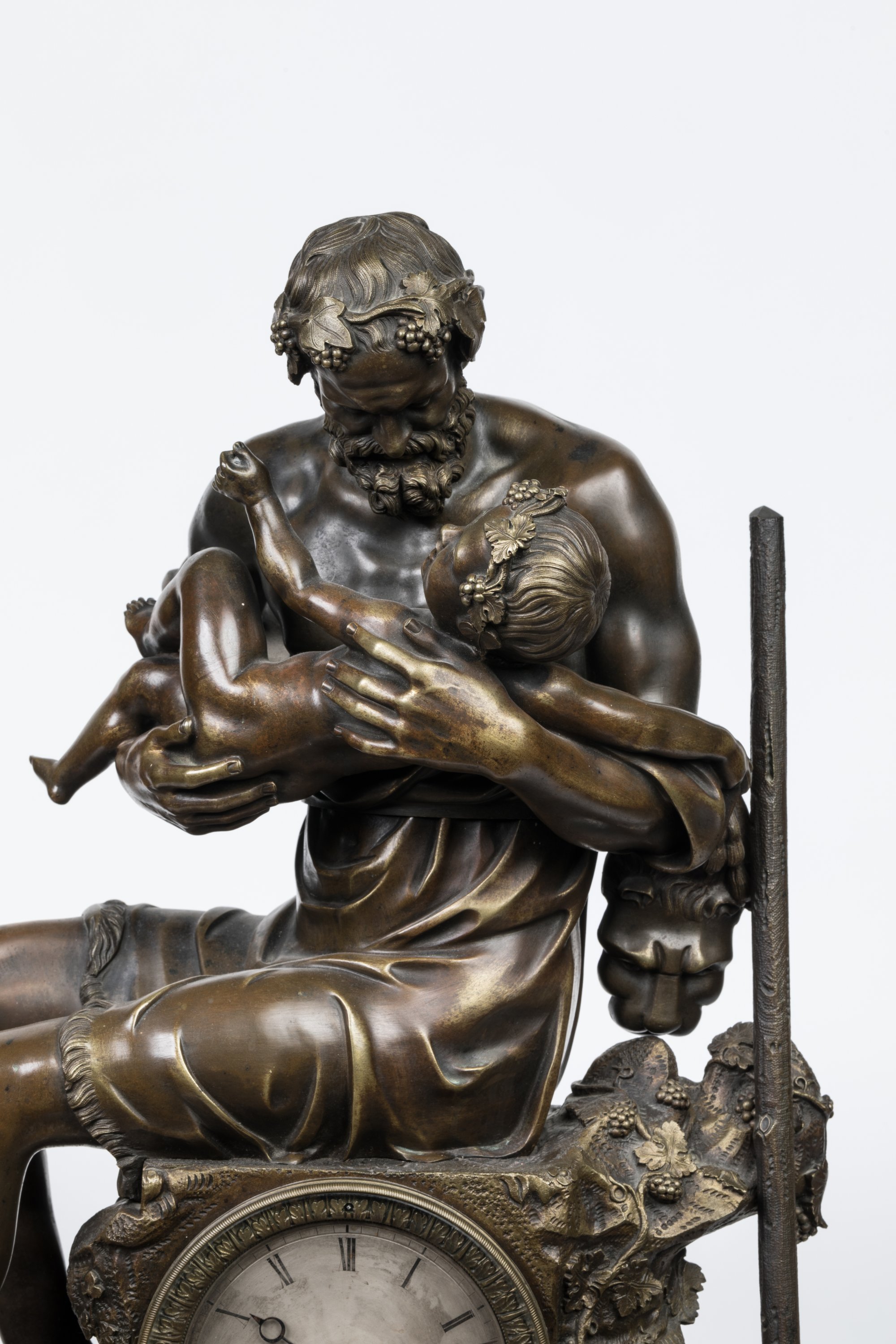 en bronze patiné, figurant Silène s'occupant du jeune Bacchus dans un riche décor naturaliste de végétaux et pampres de vignes. Le cadran, signé "Leroy à Reims", indique les heures en chiffres romains et les minutes en chemin de fer, clé de remontage et de sonnerie à quatre et huit heures. Mouvement numéroté portant un cachet " Pons Médaille d'Or Paris 1827".