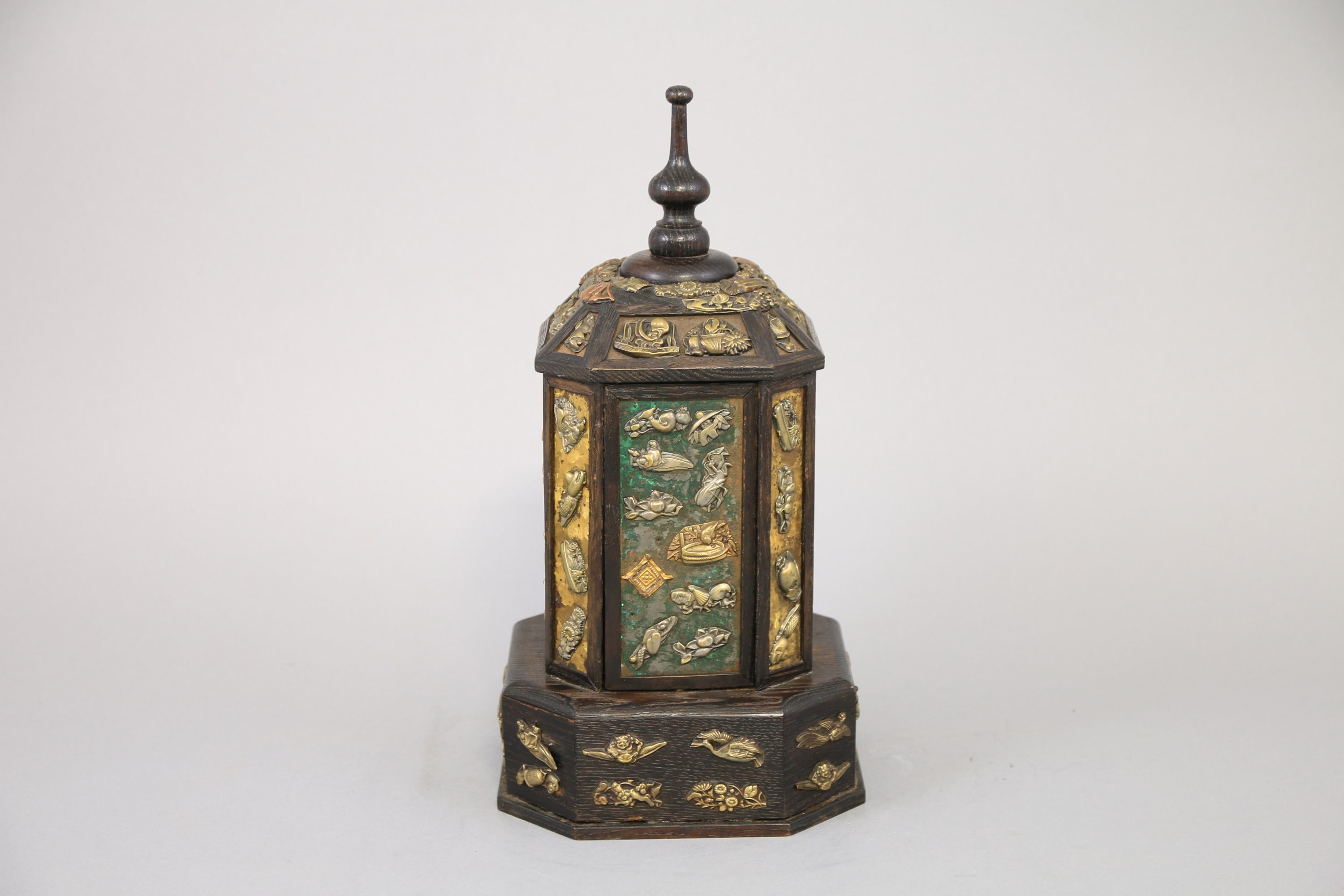 octogonale en bois laqué noire, sommée d'une poignée tournante en forme de toupie actionnant mécaniquement l'ouverture des quatre vantaux composés d'anneaux et tablettes. L'ensemble est décoré d'une centaine de menuki japonais en métal repoussé et autres boutons sur fond de cuivre. La base octogonale à pans coupés ouivre par un petit tiroir.