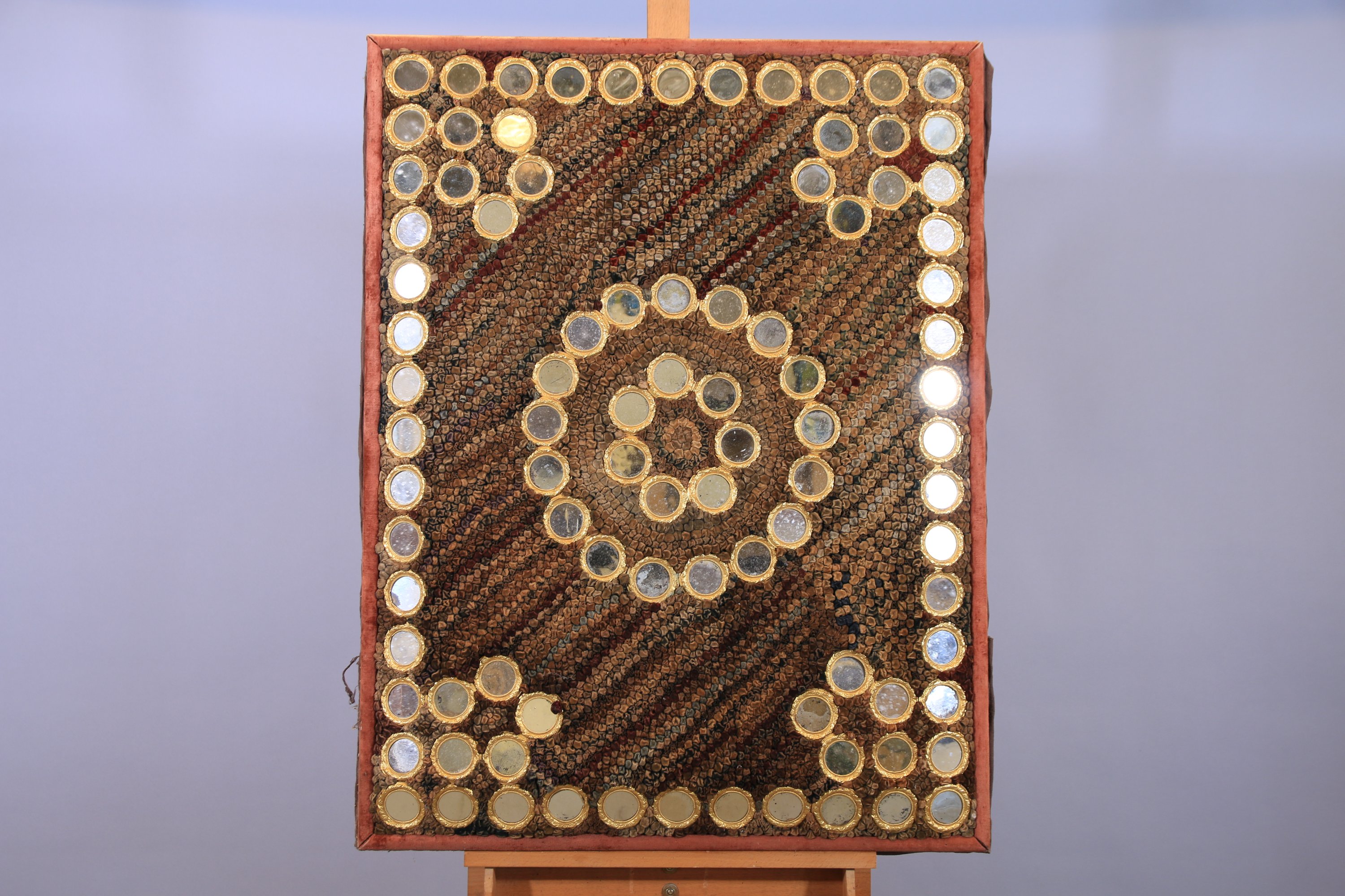 en tissu garni de miroirs circulaires formant une composition concentrique.