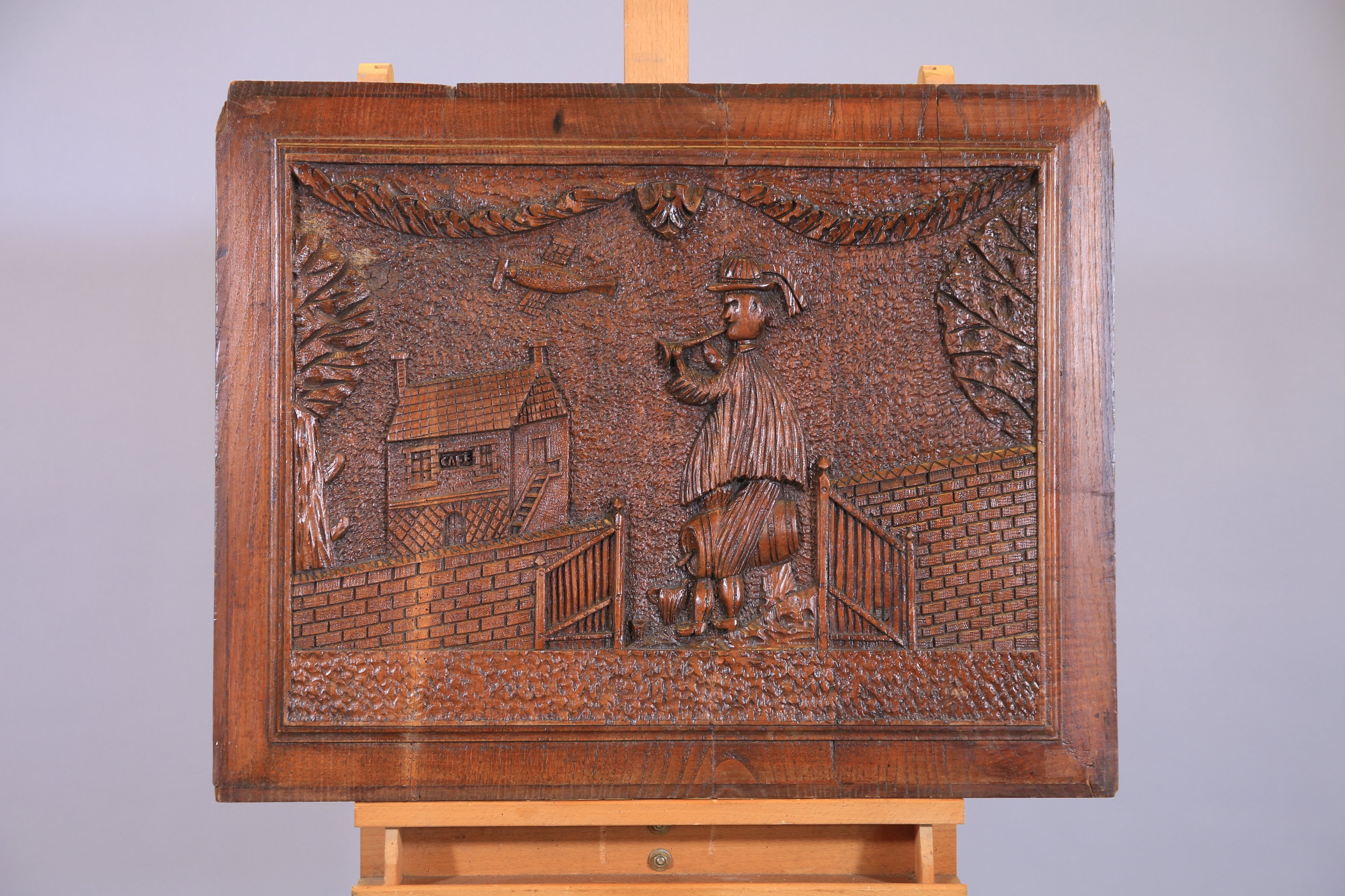 en chêne sculpté représentant un joueur de flute dans un fond architecturé.