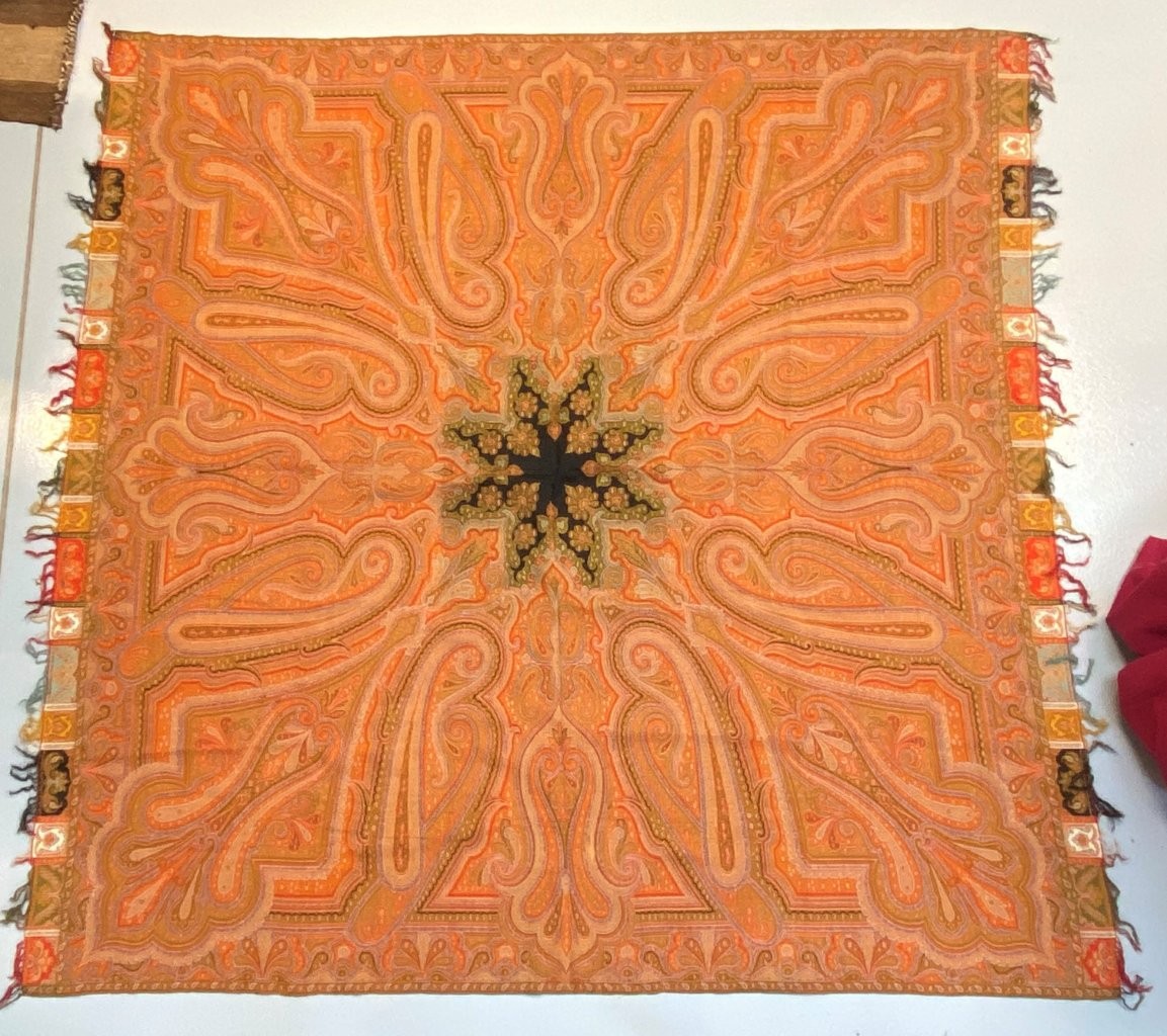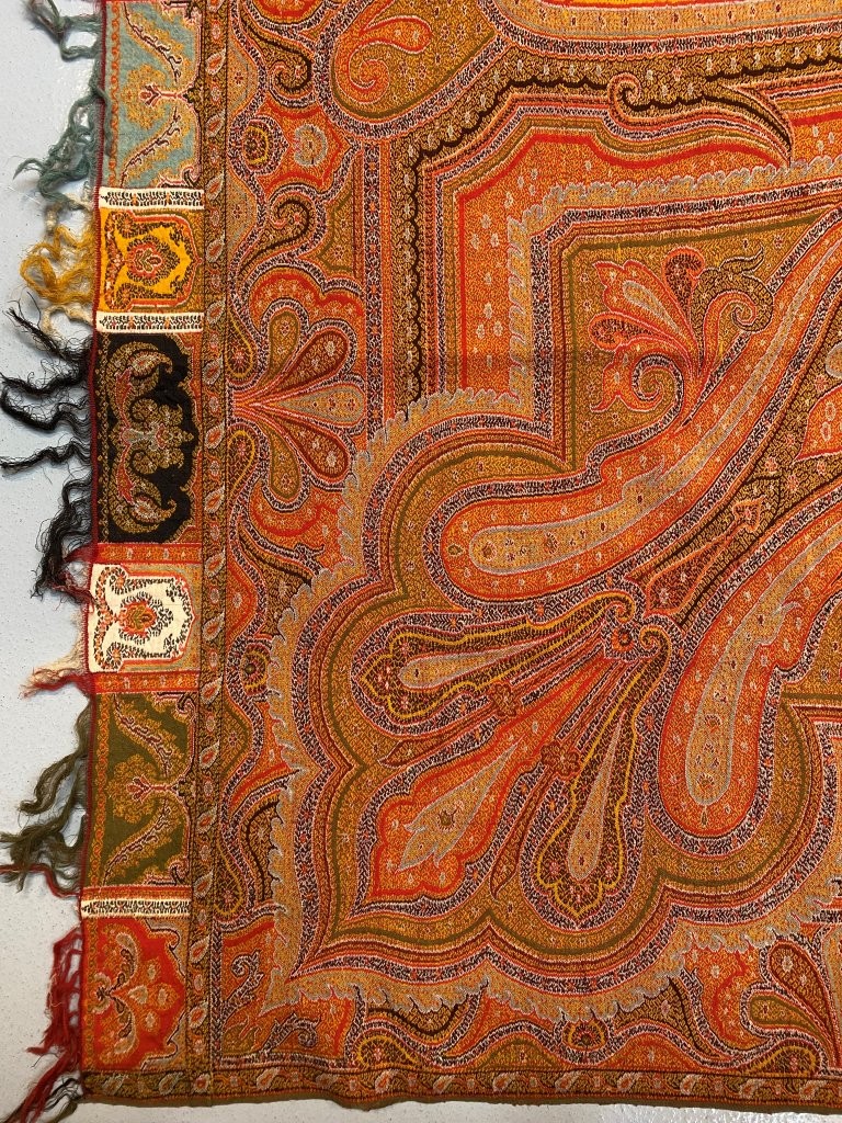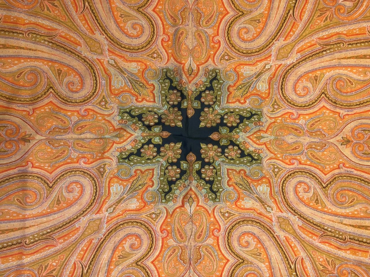 fond rouge, décor cachemire à cinq couleurs de palmes enroulées de part et d’autre d’une réserve étoilée noire.