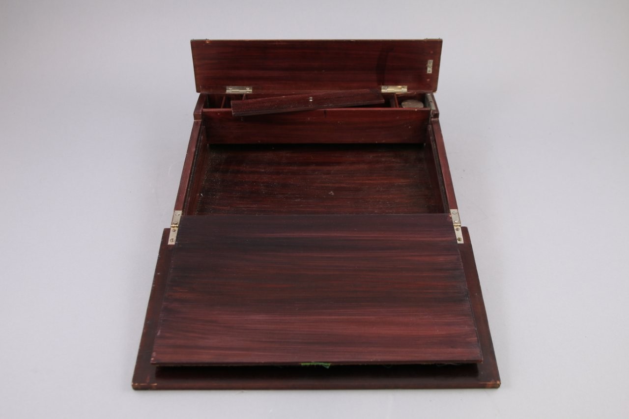 en acajou et bordures en étain en forme de rinceaux, le centre à décor d'un cartouche en laiton monogrammé "MF". Il dévoile un plateau de velours vert en partie basse et un rabat avec plumier, encrier et deux niches.