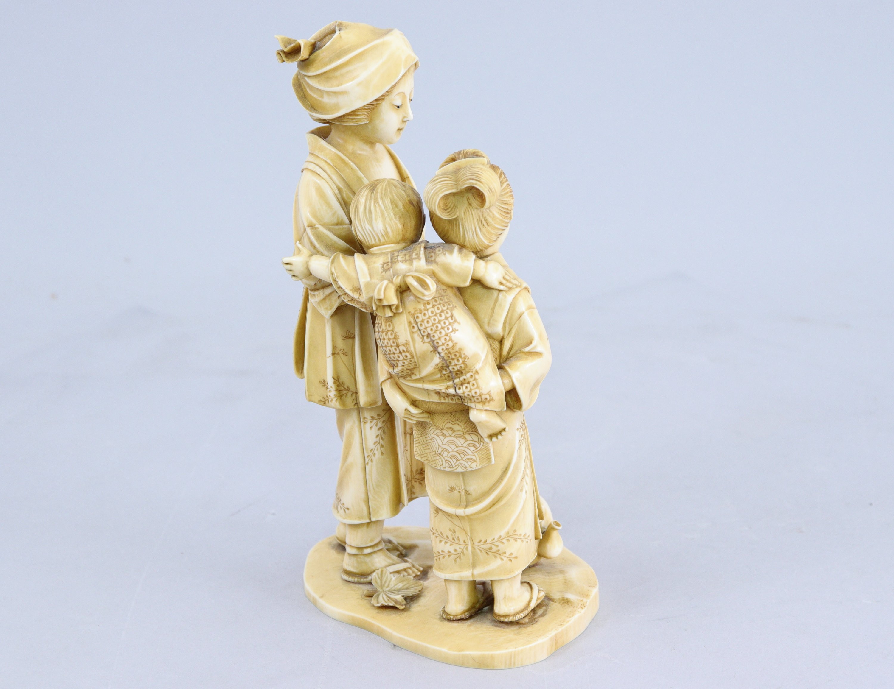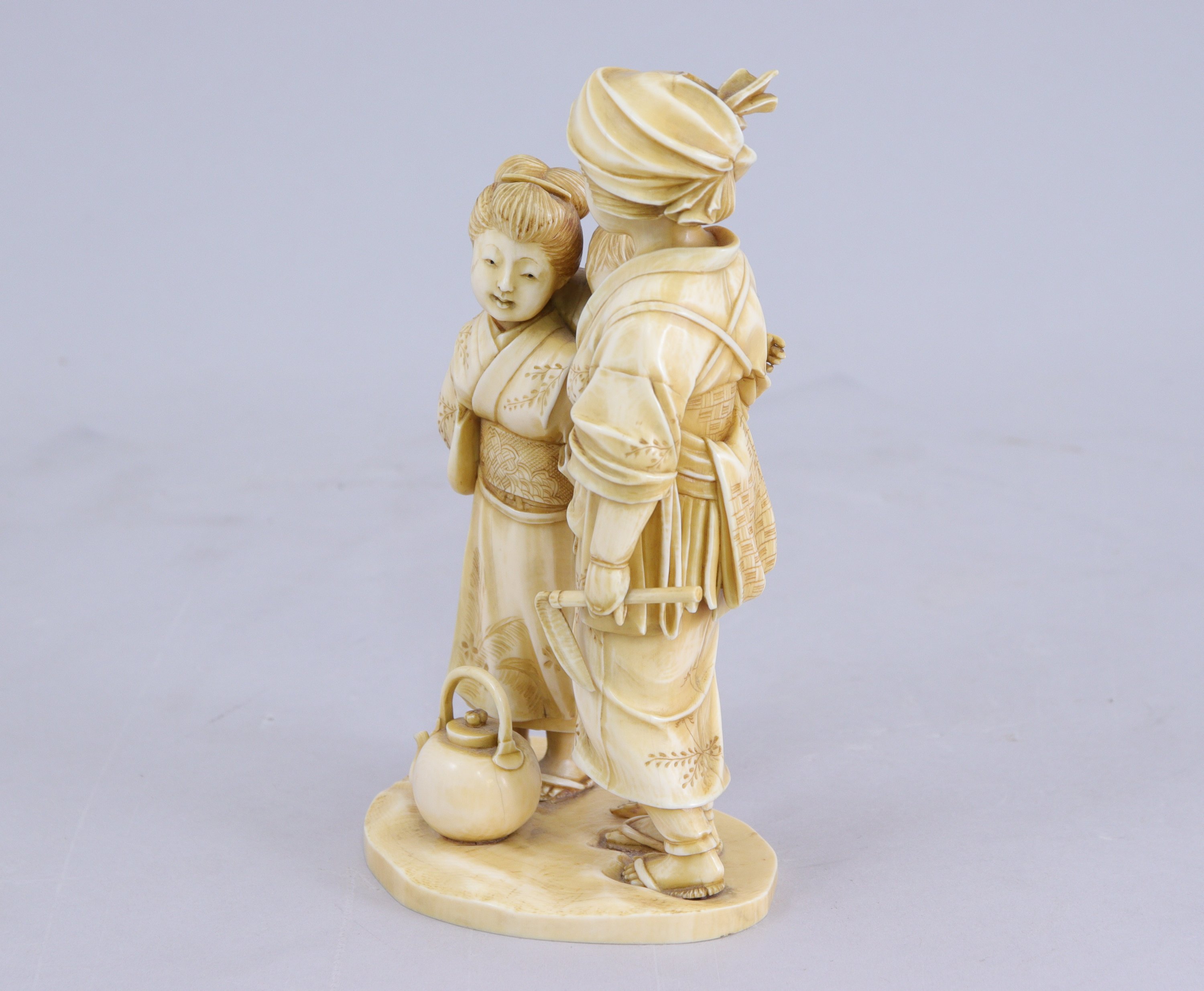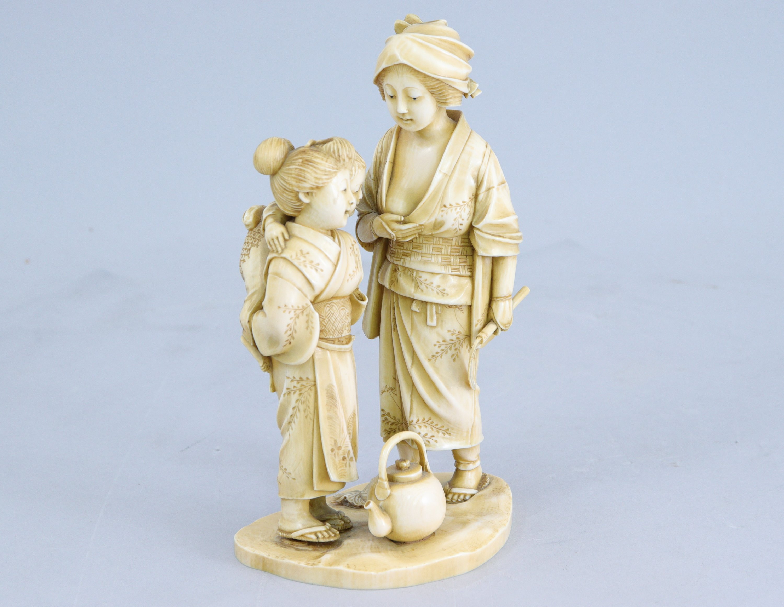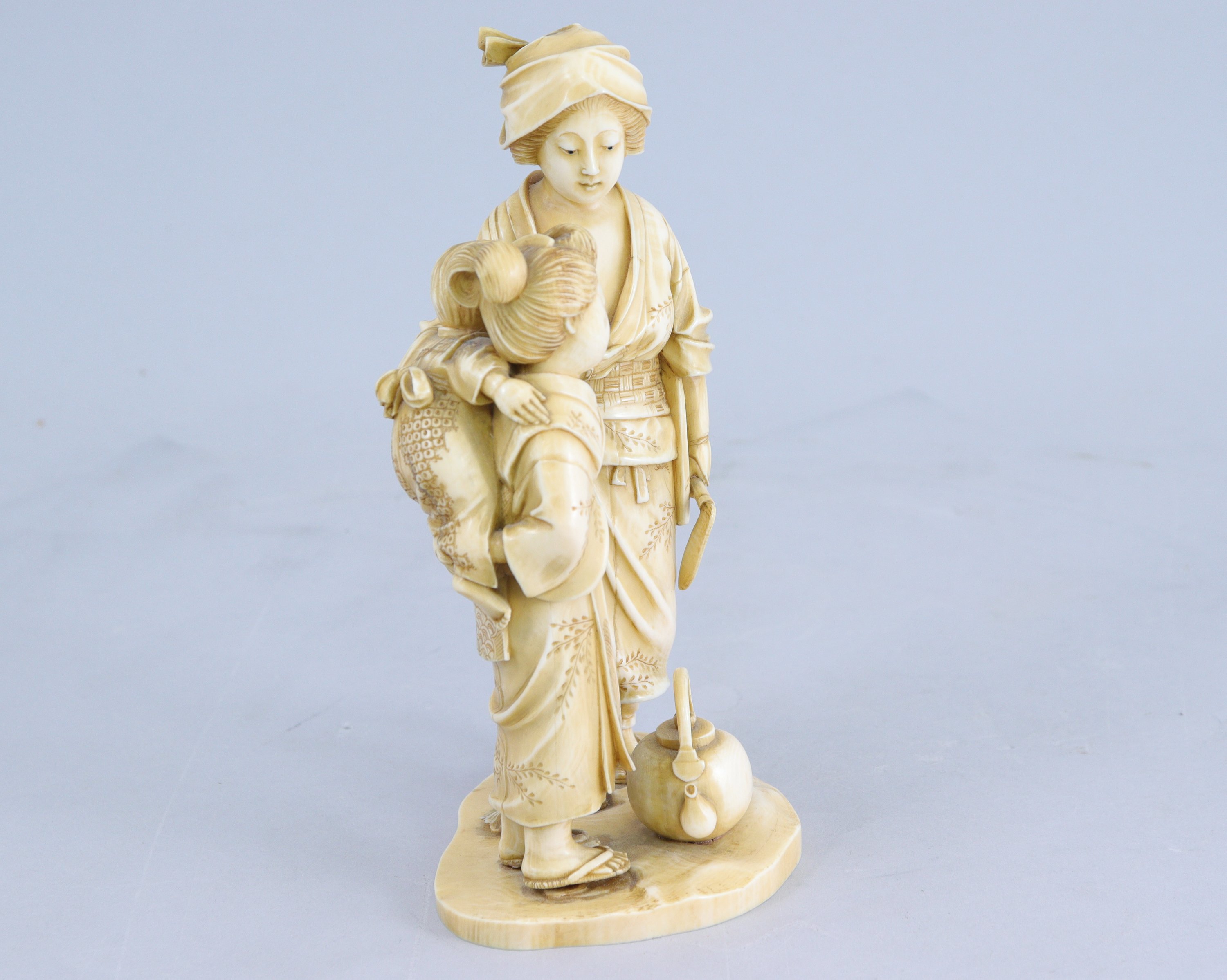 Okimono en ivoire: elle tient dans sa main gauche une serpe, une théière posée à ses pieds.