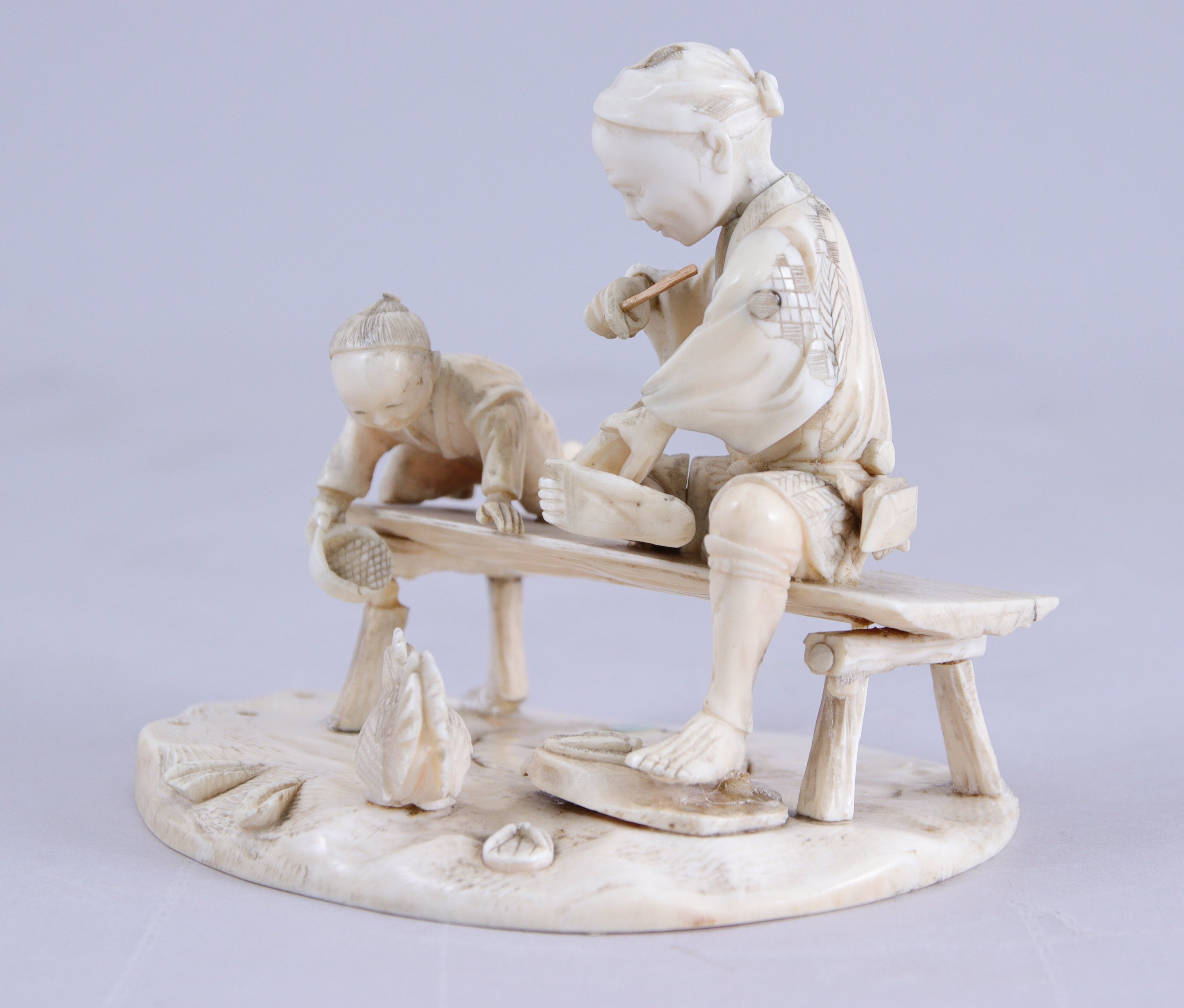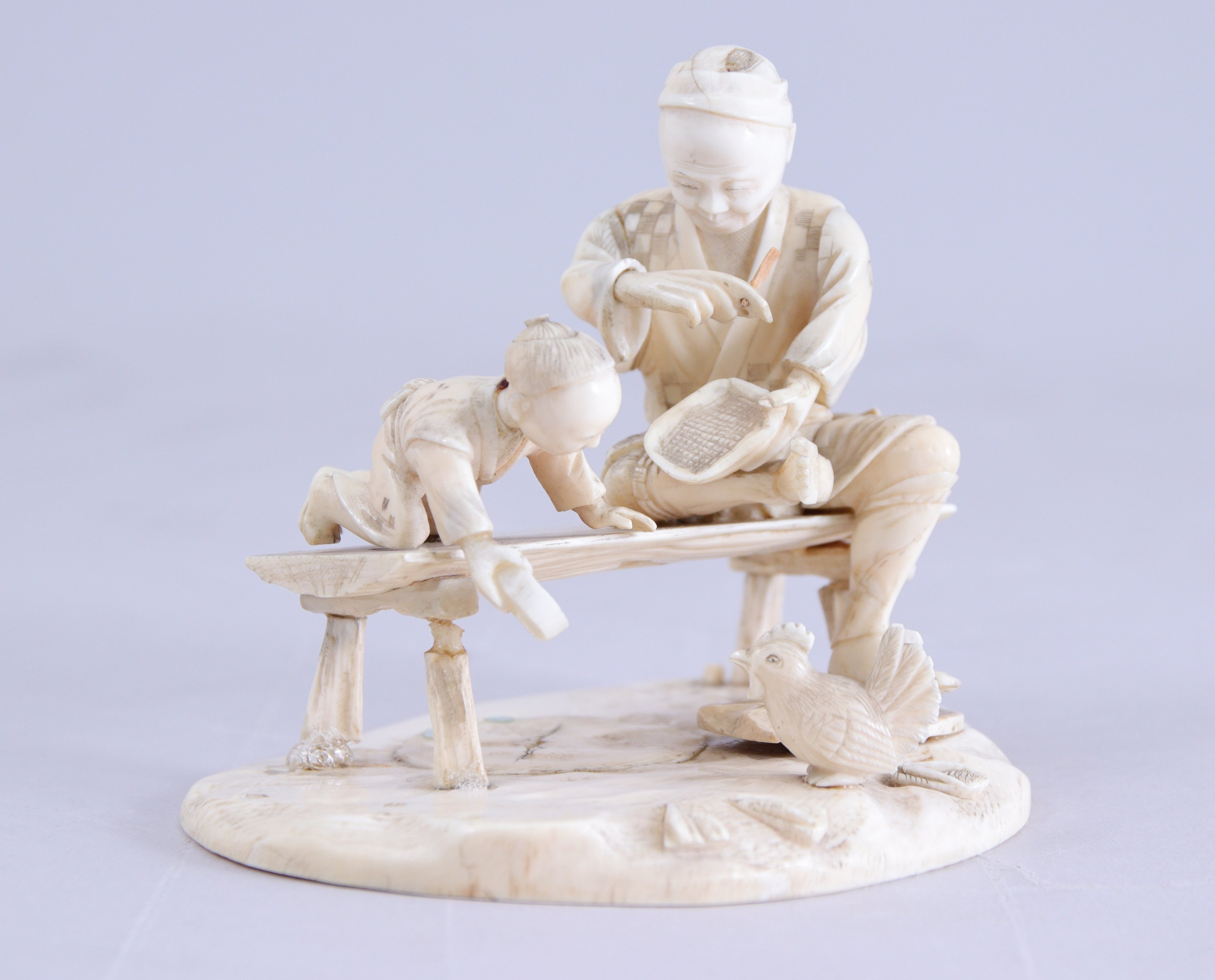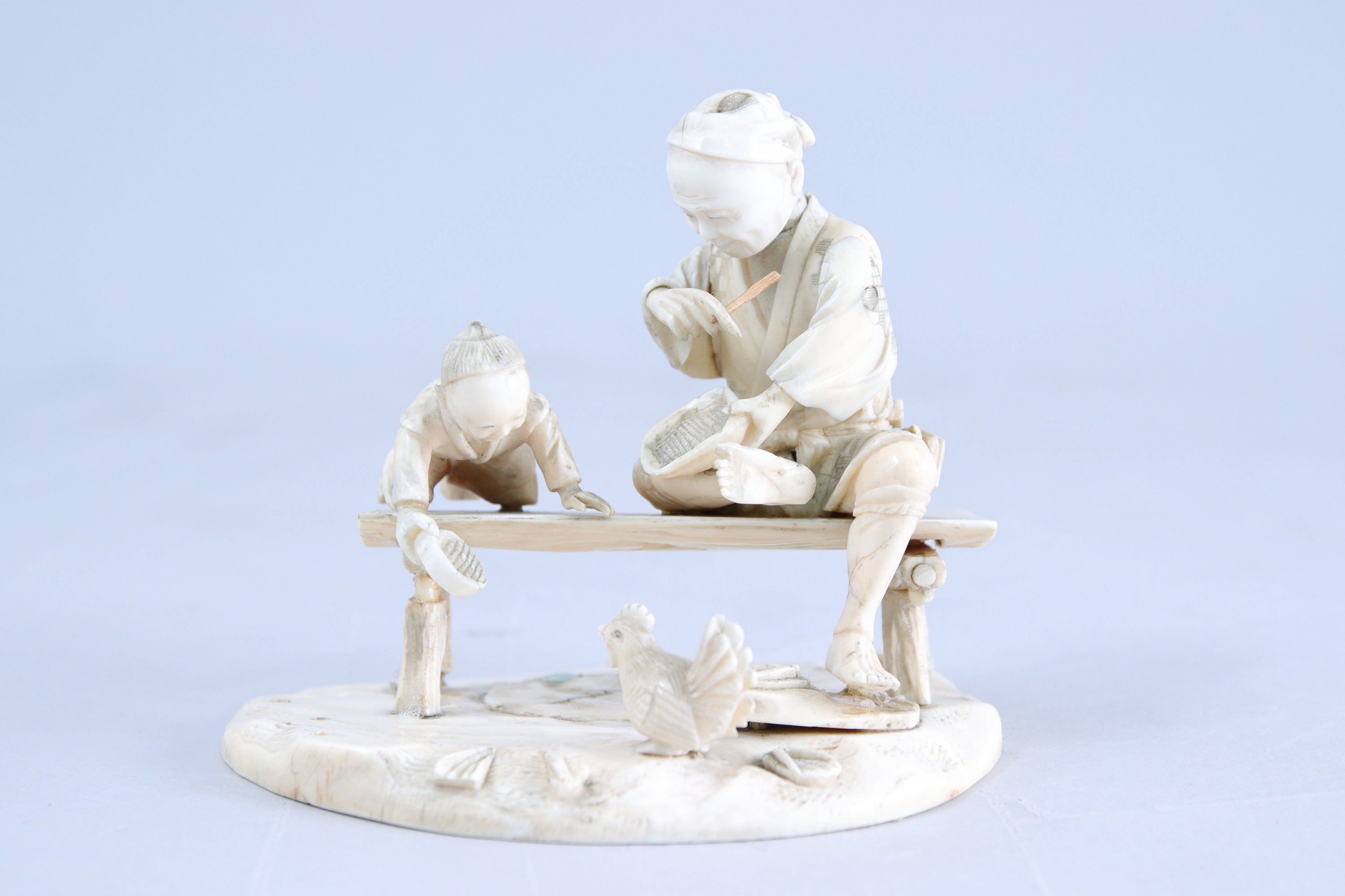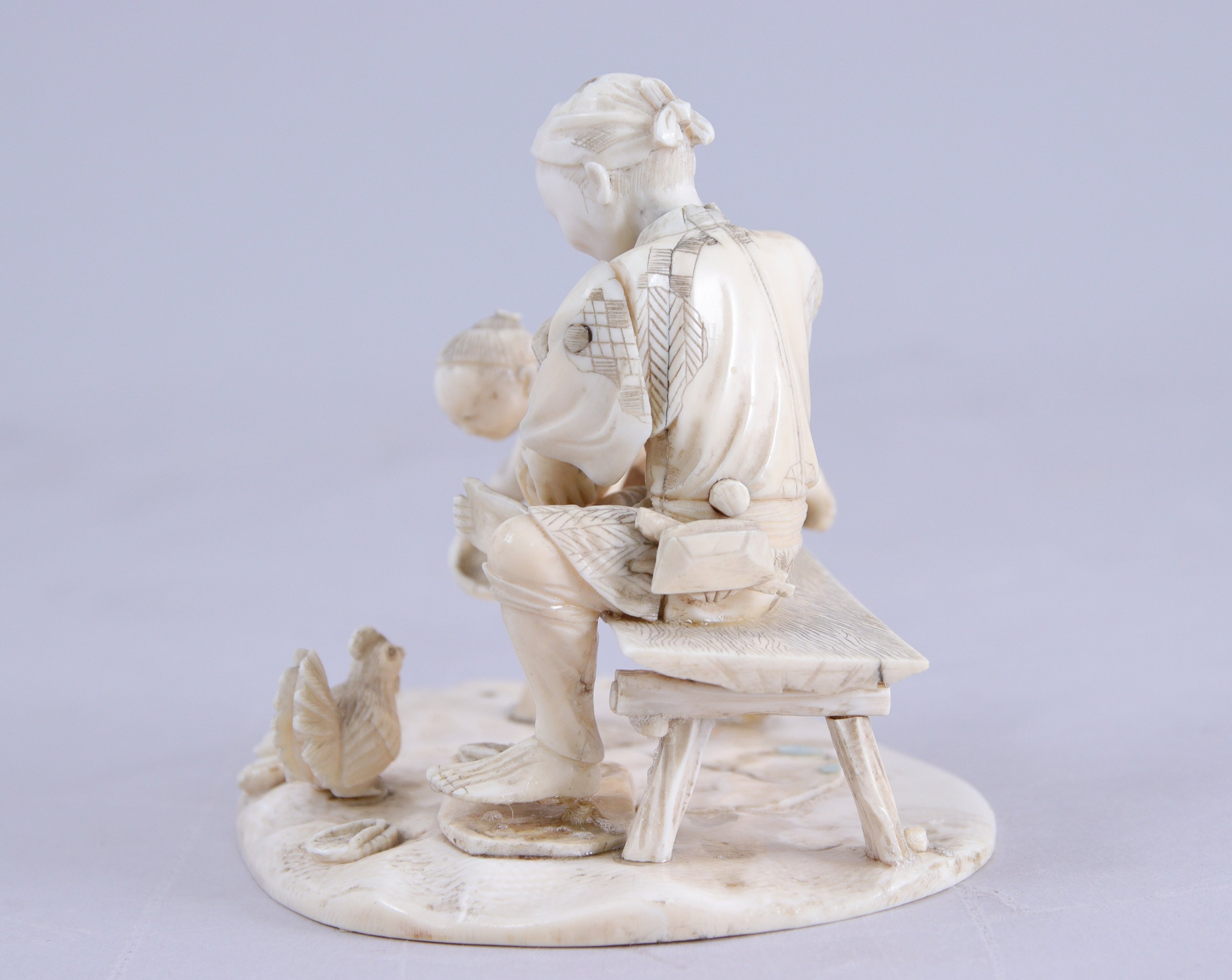 Okimono en ivoire, paysan et enfant sur un banc, l'enfant s'apprêtant à donner à manger à une poule