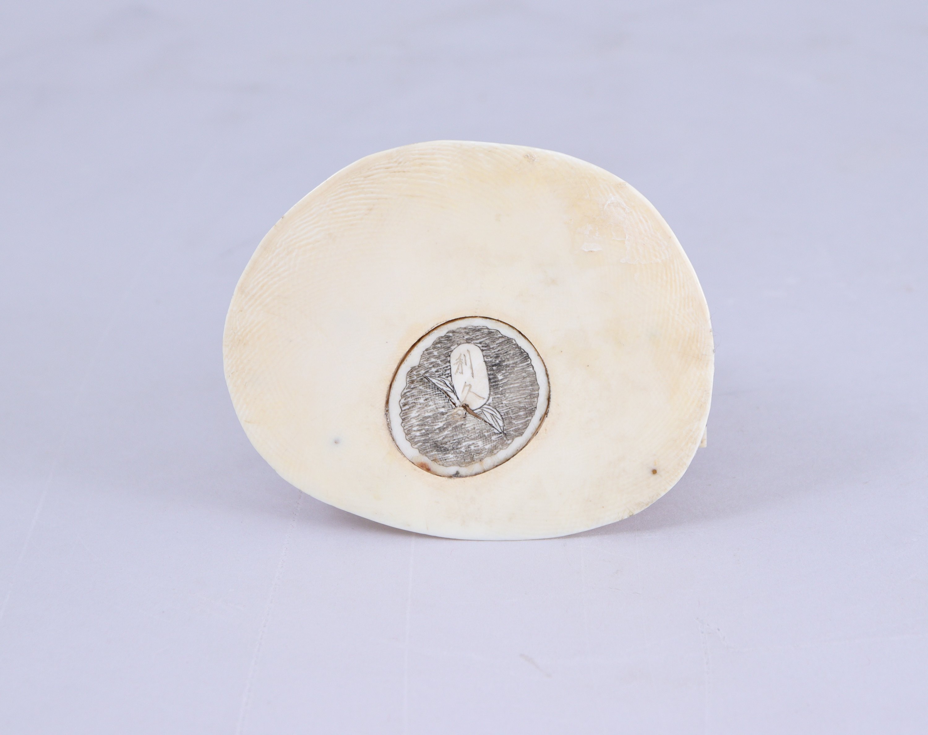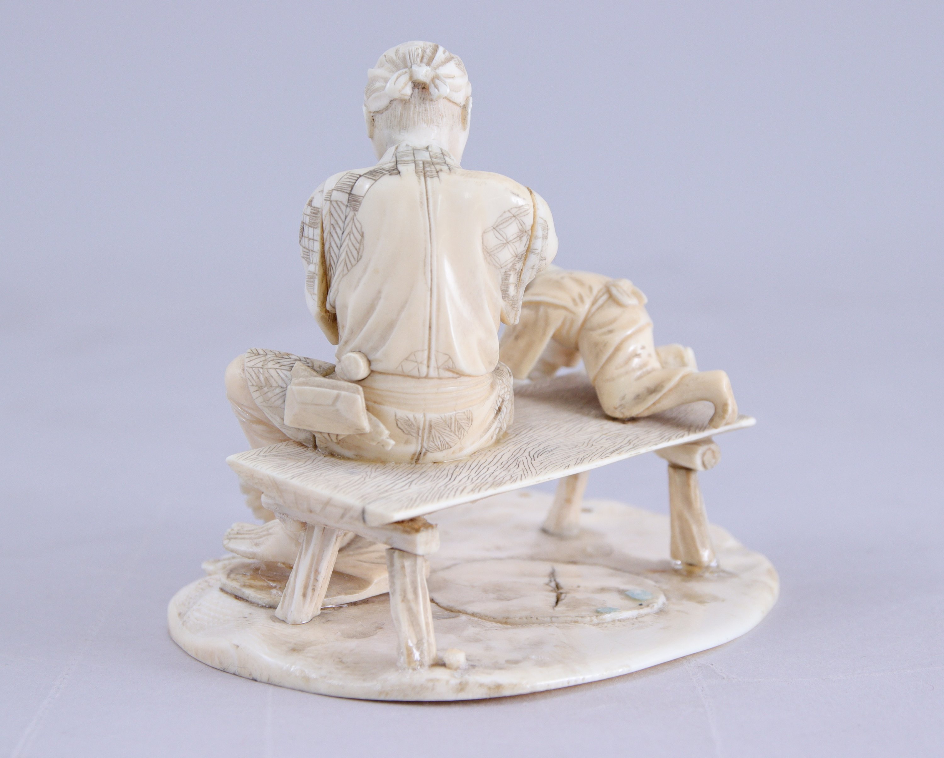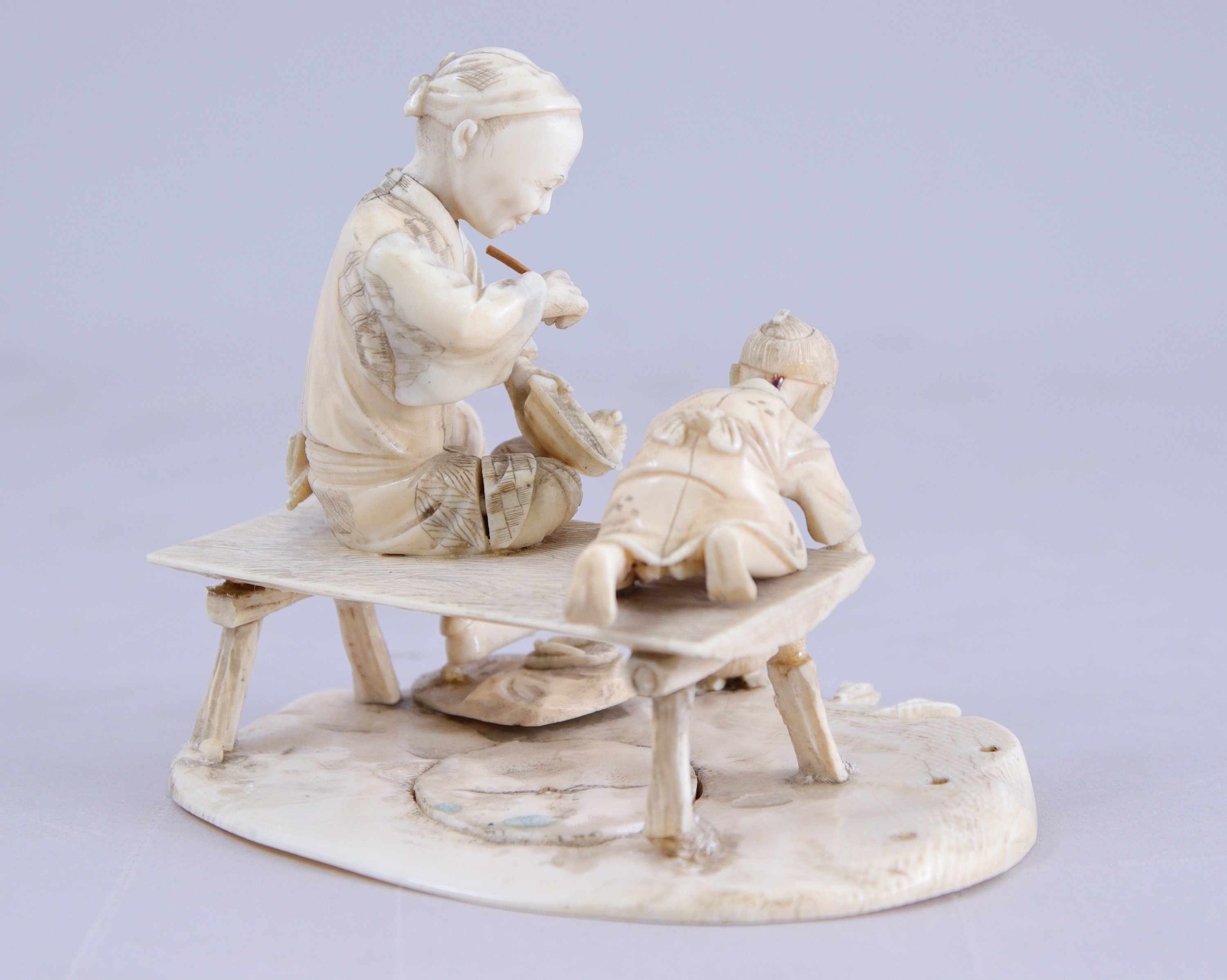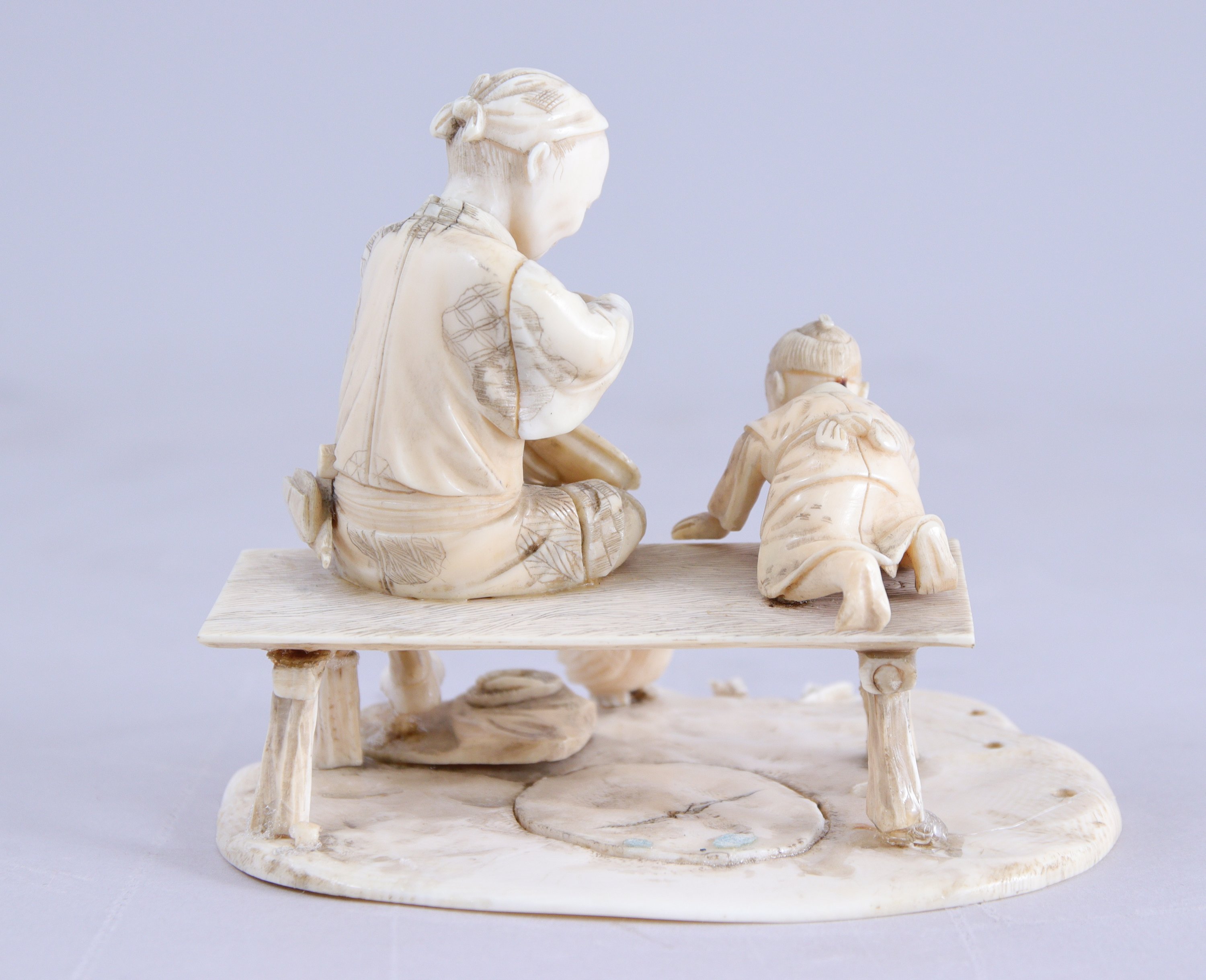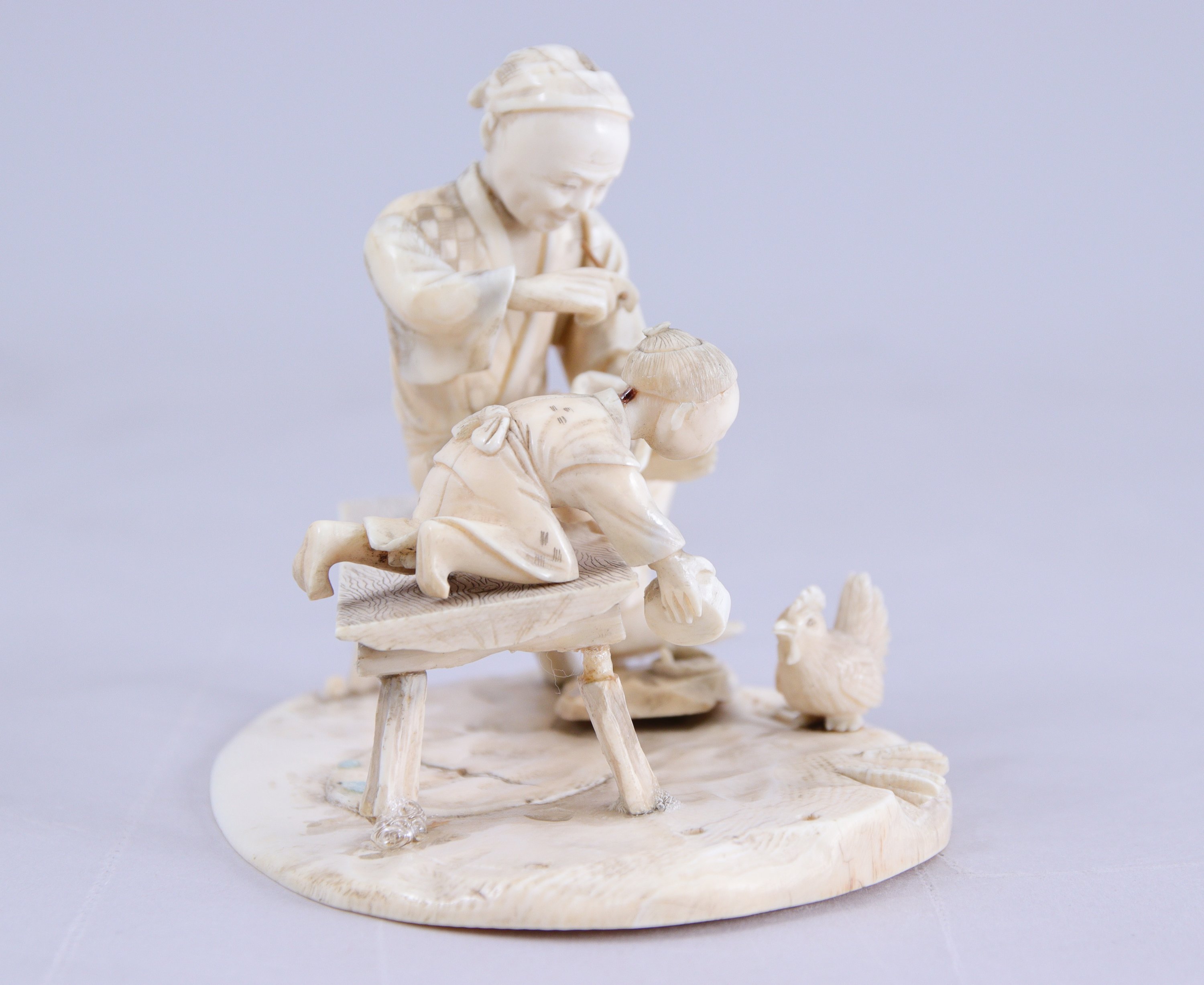 Okimono en ivoire, paysan et enfant sur un banc, l'enfant s'apprêtant à donner à manger à une poule