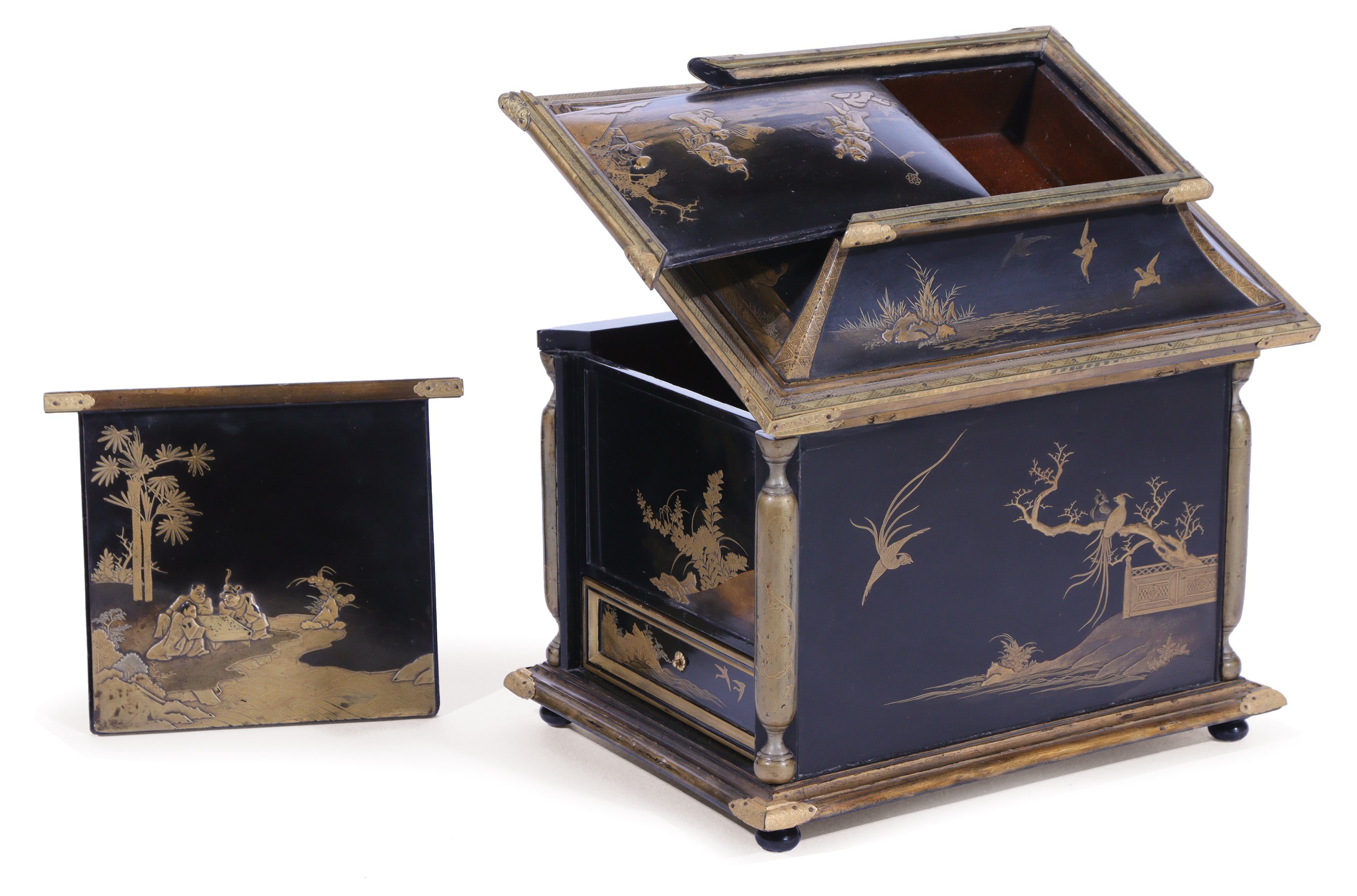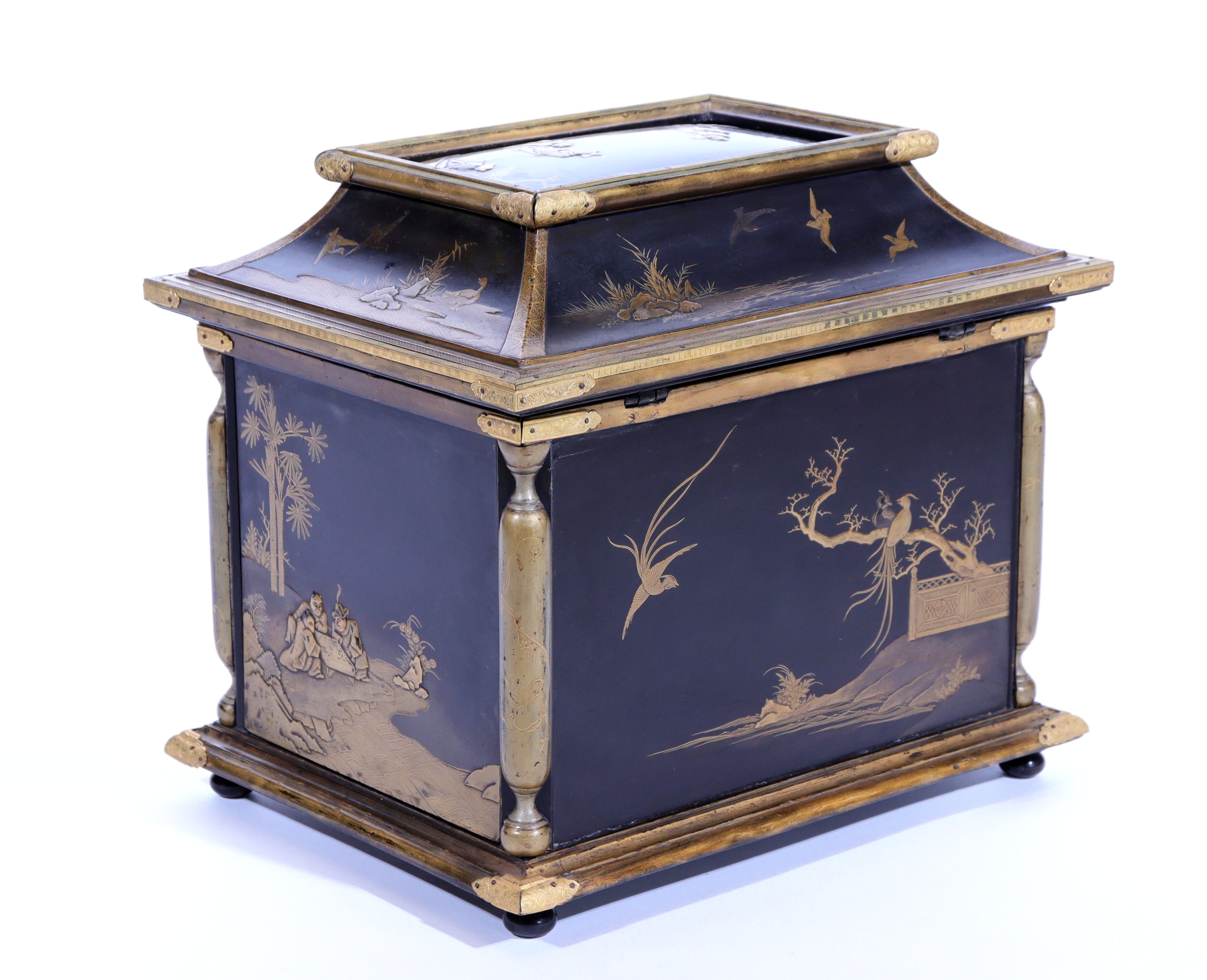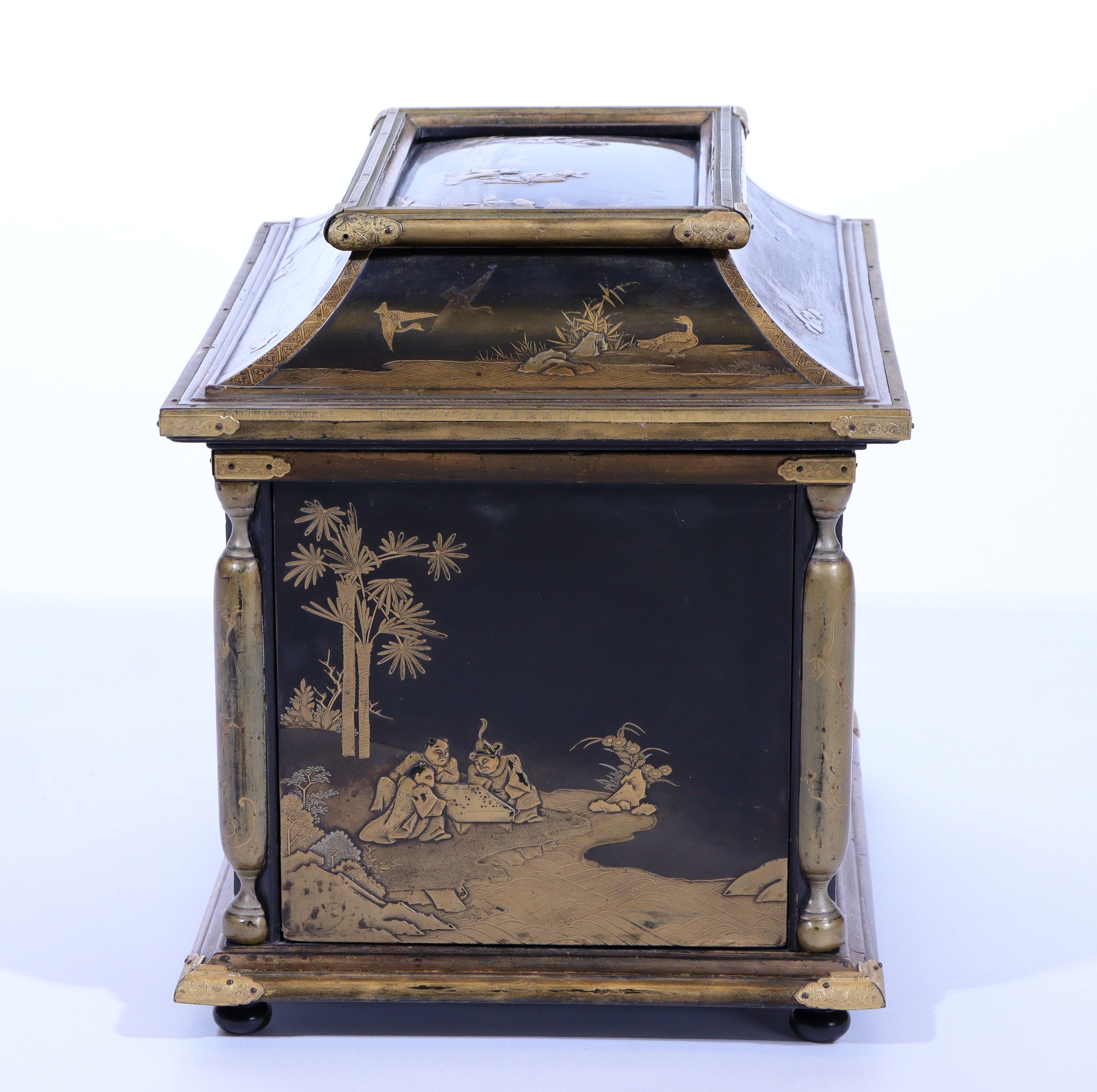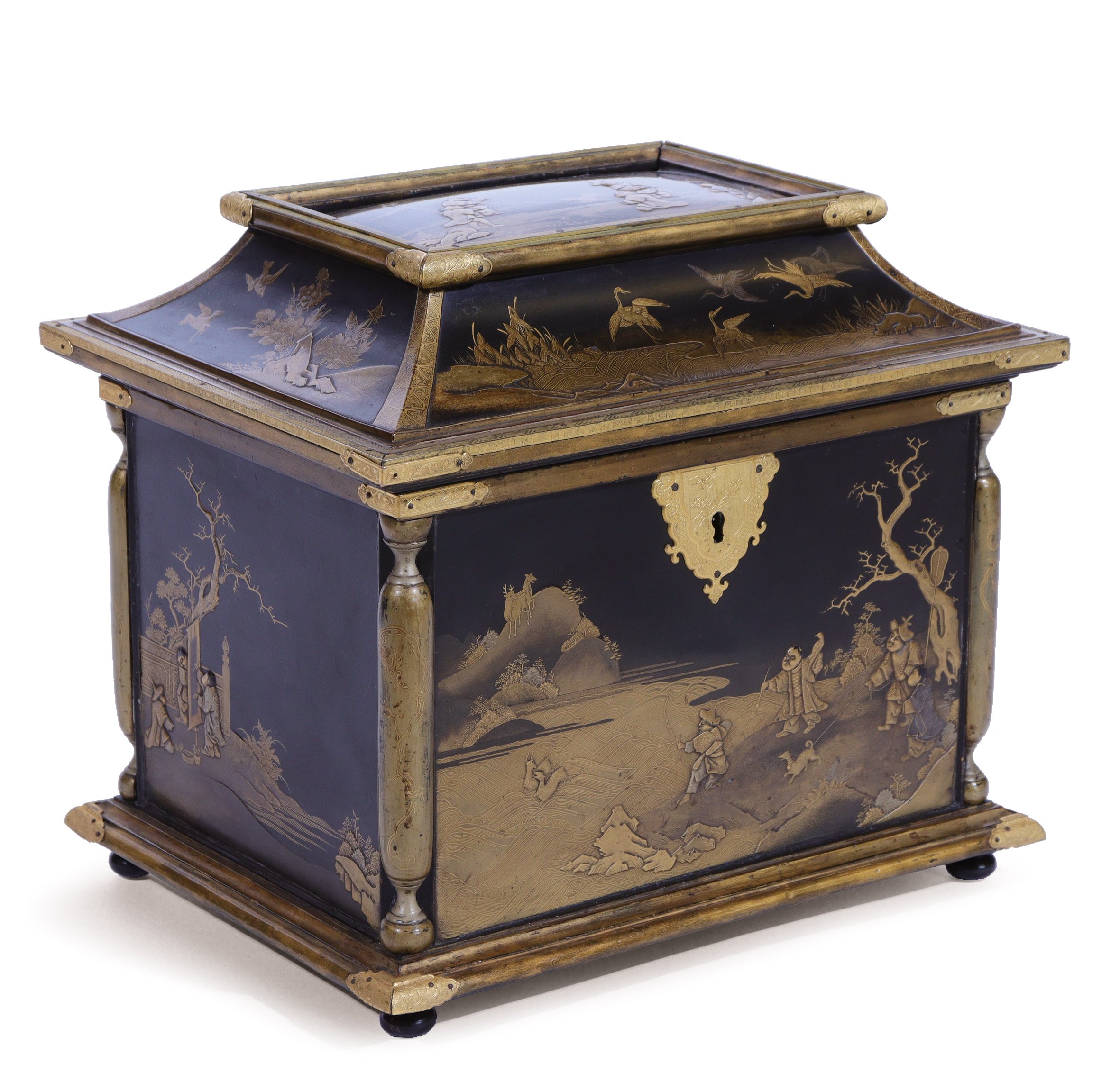 Le goût pour ces coffrets en laque de petite taille et de grande qualité est essentiellement féminin sous l'Ancien Régime. On trouve ainsi au château de Versailles la collection de boîtes en laque du Japon de la Reine Marie-Antoinette, dont aucune n'est toutefois aussi luxueuse que cet exemplaire. Réalisé au Japon dans les années 1640-1650, dans le nouveau style dit Pictorialiste mis en place pour la Compagnie des Indes Orientales Néerlandaise, ce coffret en pagode a probablement été agrémenté en Europe au XVIIIe siècle d'accessoires en cristal, argent ou or pour en faire un nécessaire à écrire, de toilette ou un coffre à bijoux. Le marchand mercier Gersaint en fait la publicité suivante en 1747: " boëte de forme presque quarré est d'un fond d'ancienne aventurine orné de branchages de relief surdorés. Elle est propre à faire une magnifique cave ou un nécessaire". Madame de Pompadour avait elle-même choisi un "coffre en laque fermant à clé et à trois tiroirs pour serrer ses diamants", acheté 400 livres, chez Lazarre Duvaux en 1754. La marquise possédait au moins trois autres boîtes en laque noir et or semblable à celle-ci pour conserver ses pièces d'or, ou transformées en encrier, comme celle dans la vente de la duchesse de Mazarin en 1781 (Castellucio, 2019, p.123).Avec leurs luxueux décors en relief et leurs précieux piliers dans les angles, ces boîtes sont les plus riches exemplaires qui nous soient parvenus. Elles figurent dans les plus grandes collections, en Europe comme au Japon. Le Cardinal Mazarin conserve une seule paire de ces petits coffres "de verny de la Chine aussy en forme de tombeau l'un dont les collonnes aux encoigneures sont unies dorées et celles de l'autre a balustres doré et noir" (n°837). Si Impey et Jorg ont identifié 11 coffrets en pagode à travers le monde, dérivant de l'exceptionnel "Chiddingston casket" conservé à l'Amolean Museum d'Oxford, ce coffret est le seul dont les paysages soient agrémentés de personnages. Comme sur les quatre grands "coffres de Mazarin", à Londres, Amsterdam, Berlin et Moscou, de truculentes scènes de la vie du Japon ornent les panneaux de cette boîte: des joueurs de Go sont installés dans un jardin sur l’un des côtés pendant qu'un artiste peint de l'autre, des chasseurs à l'arc tirent à l'occasion d'un bat-l'eau sur des daims en façade, des oiseaux volent sur la face arrière et sur les côtés du couvercle tandis que des enfants facétieux montrent du doigt le reflet de sa propriétaire dans le miroir intérieur.