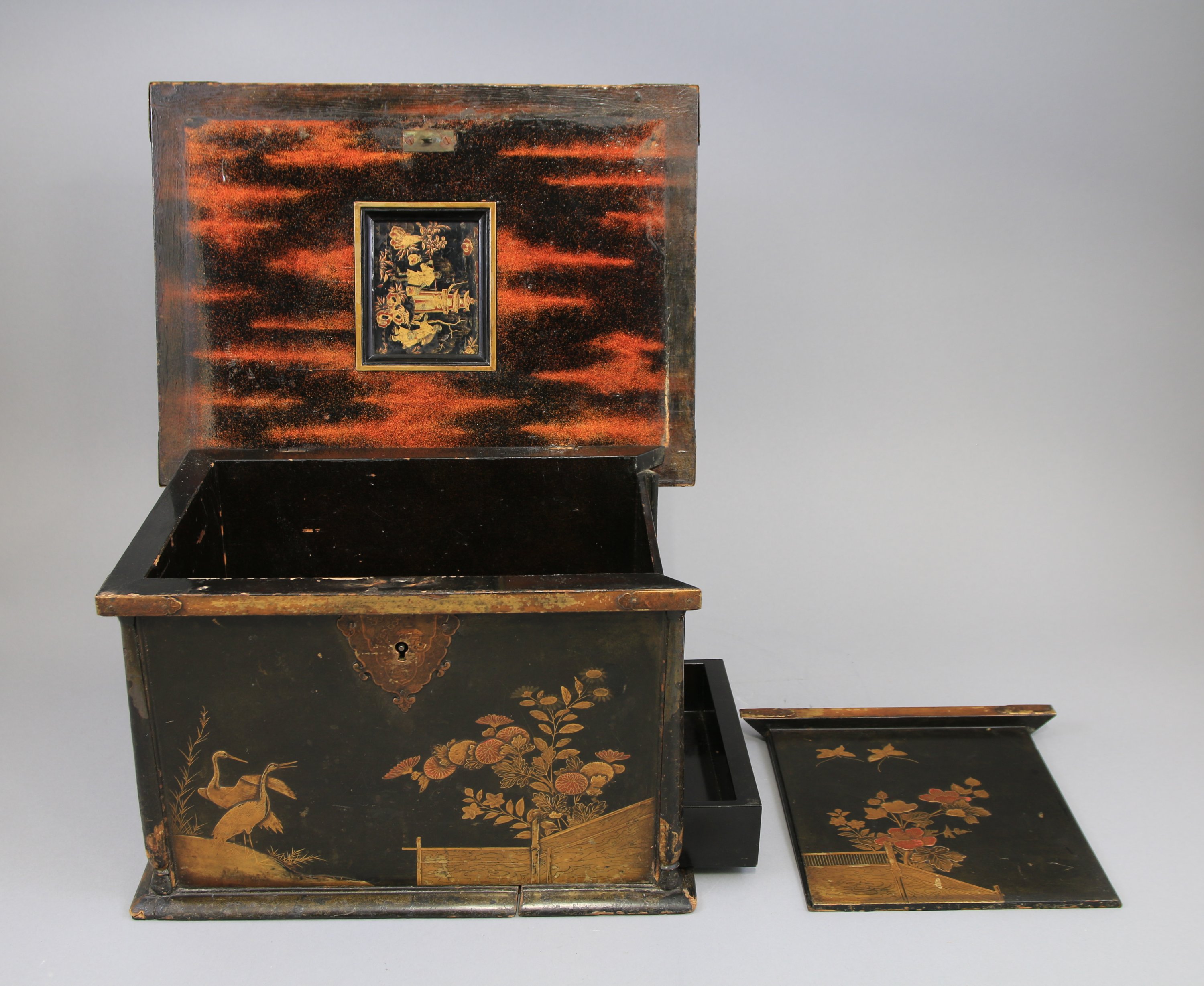 en forme de pavillon, en laque brune à décor de laque rouge et or de grues, papillons et chrysanthèmes, oiseaux et pivoines.