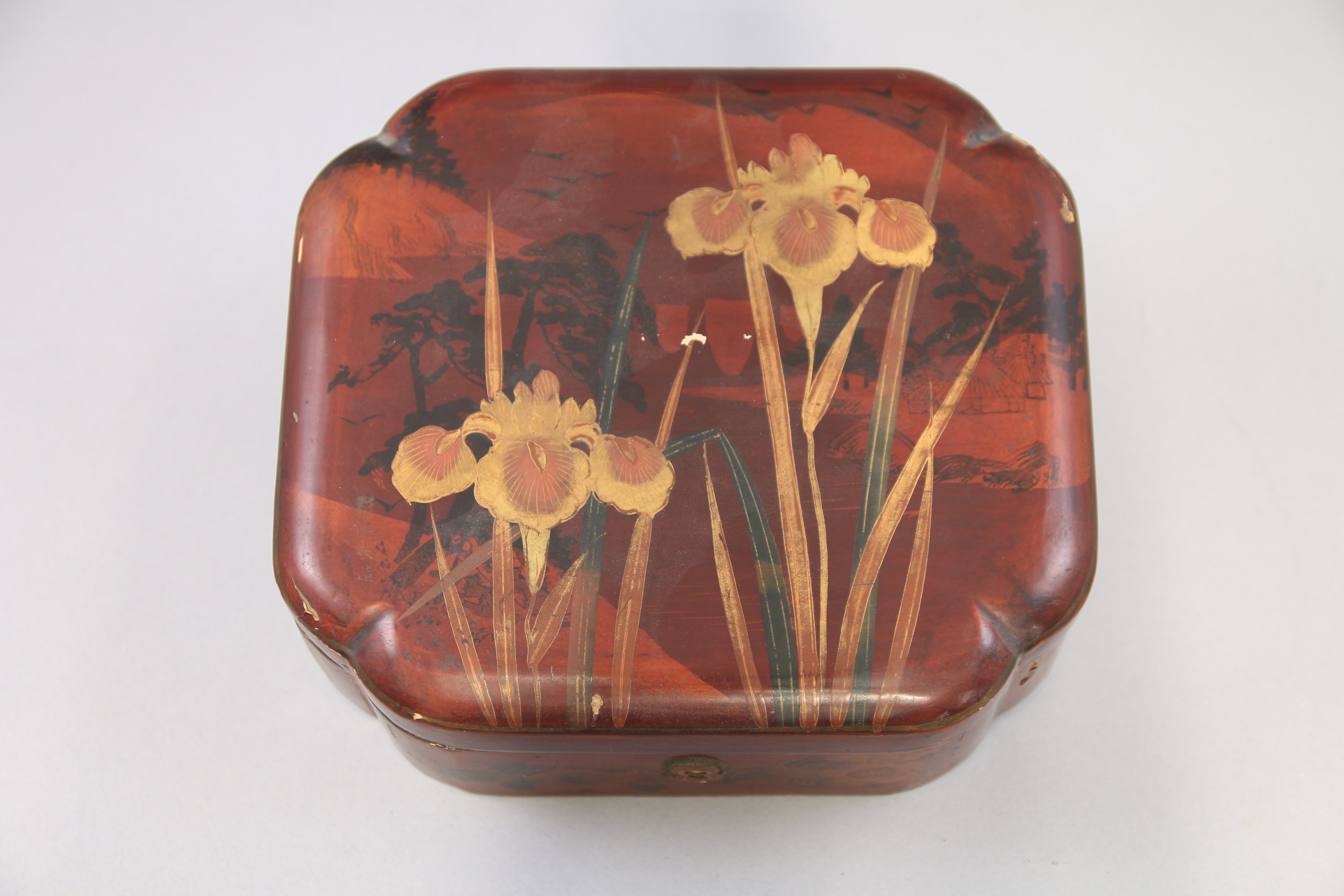 de forme carrée aux angles rentrés, à décor de deux iris sur fond de paysage. Les côtés sont décorés de bouquets de fleurs. La façade présente une entrée de serrure.