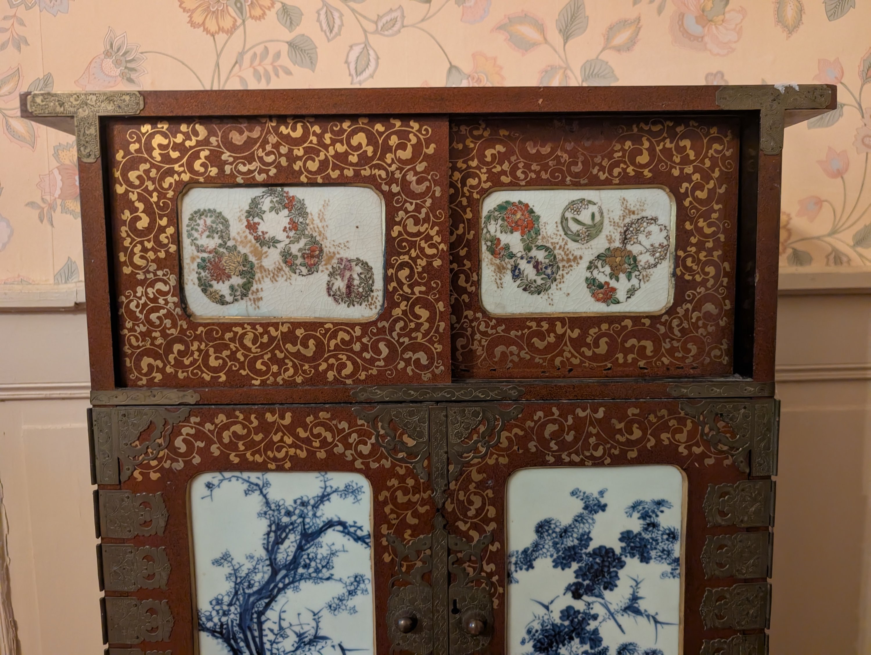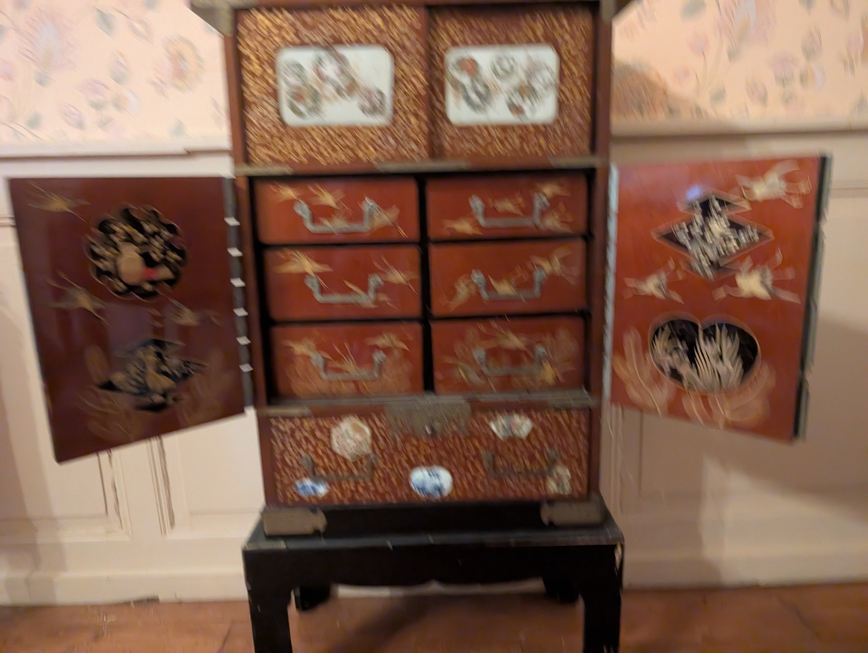 Il ouvre à deux vantaux découvrant six tiroirs et un grand tiroir en partie basse.