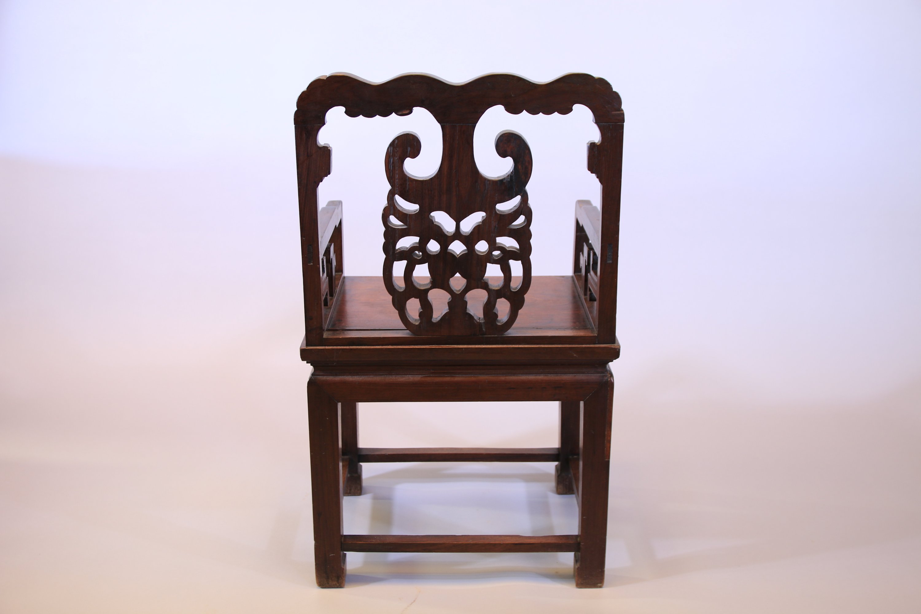 à dossier ajouré à décor d'une chauve-souris et de deux pêches de longévité évoluant dans des nuages. La ceinture est ornée de rinceaux. Il repose sur quatre pieds reliés par une entrejambe.