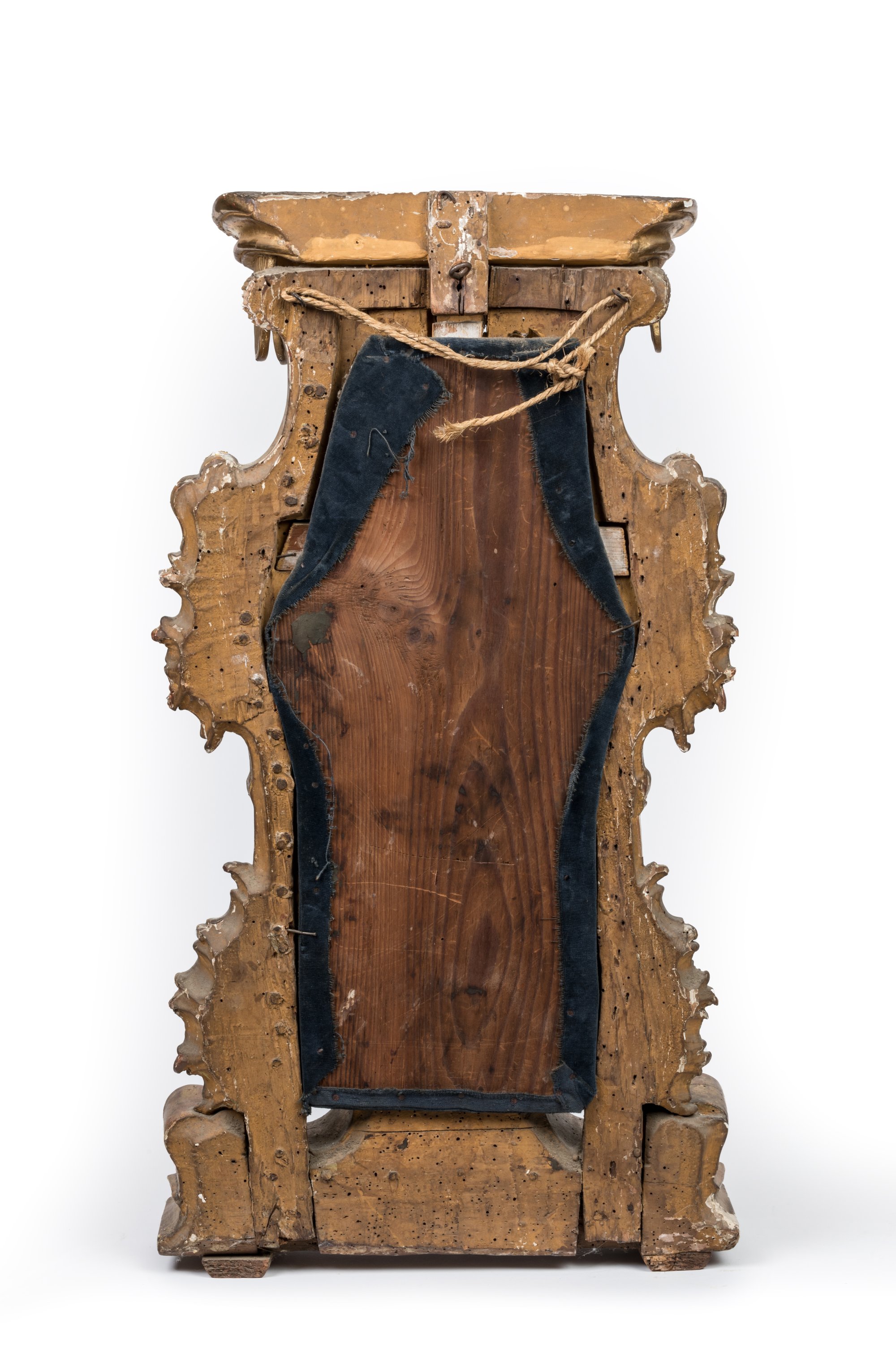 Sur un crucifix en bois doré dans un panneau reliquaire à la bordure ornée de volutes et surplombé d’un dais en bois doré.