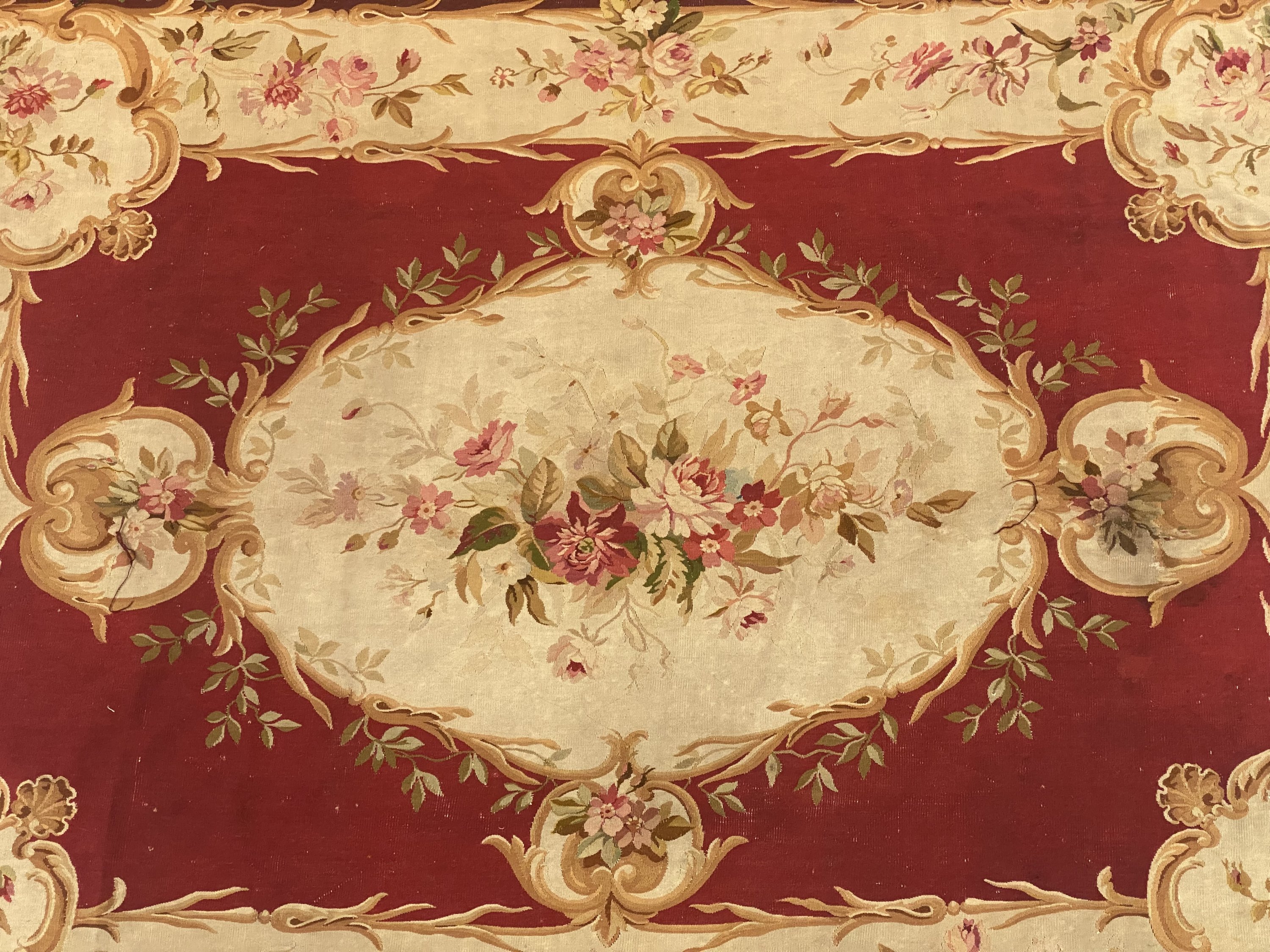au point ras, fond crème à décor d’une gerbe de fleurs dans des branches feuillagées, sur contrefond rouge, bordure et écoinçons crème de gerbes de fleurs dans des rinceaux et palmes, galon rouge brique.