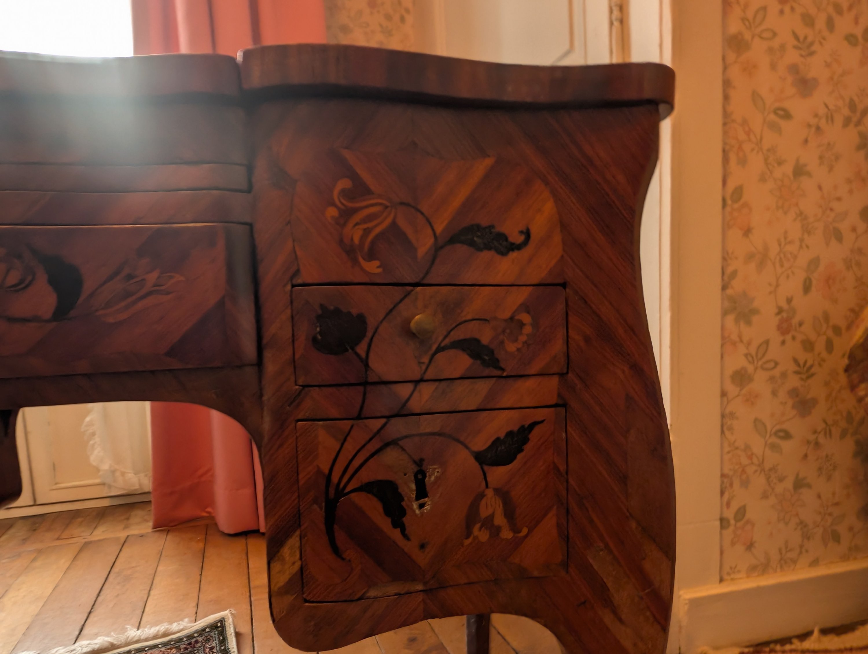 Décor marqueté de bouquets de fleurs sur fond de satiné dans des encadrements de bois de violette.