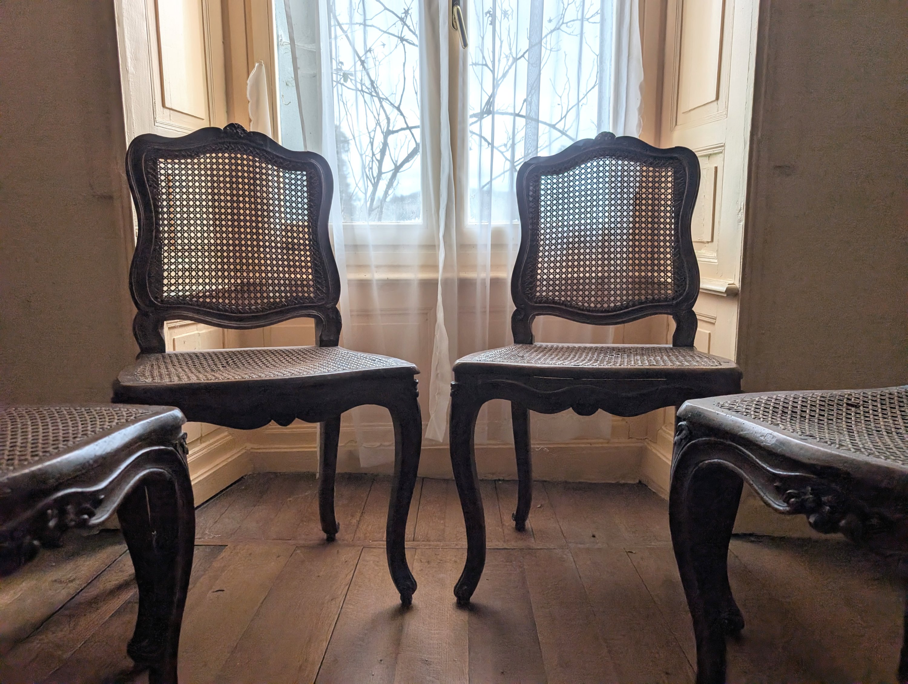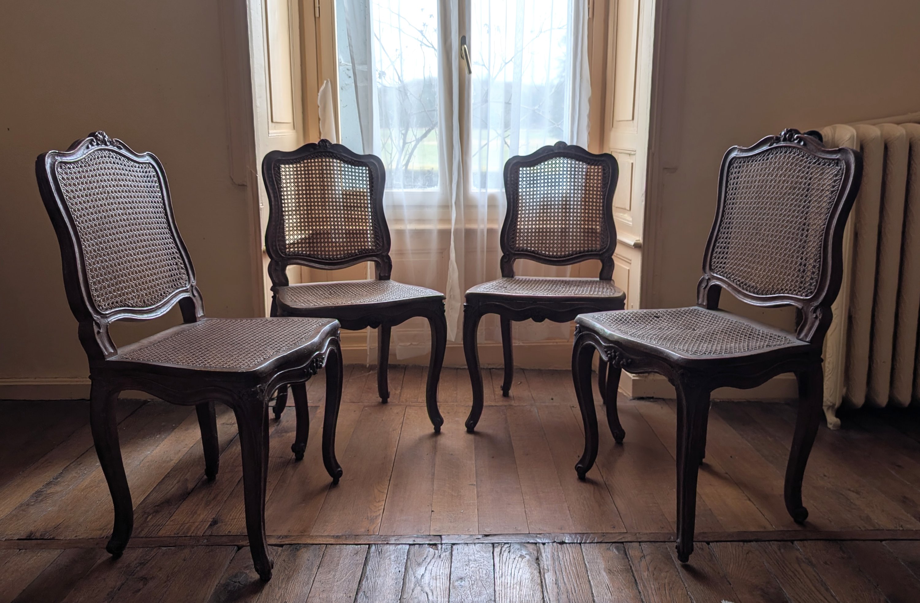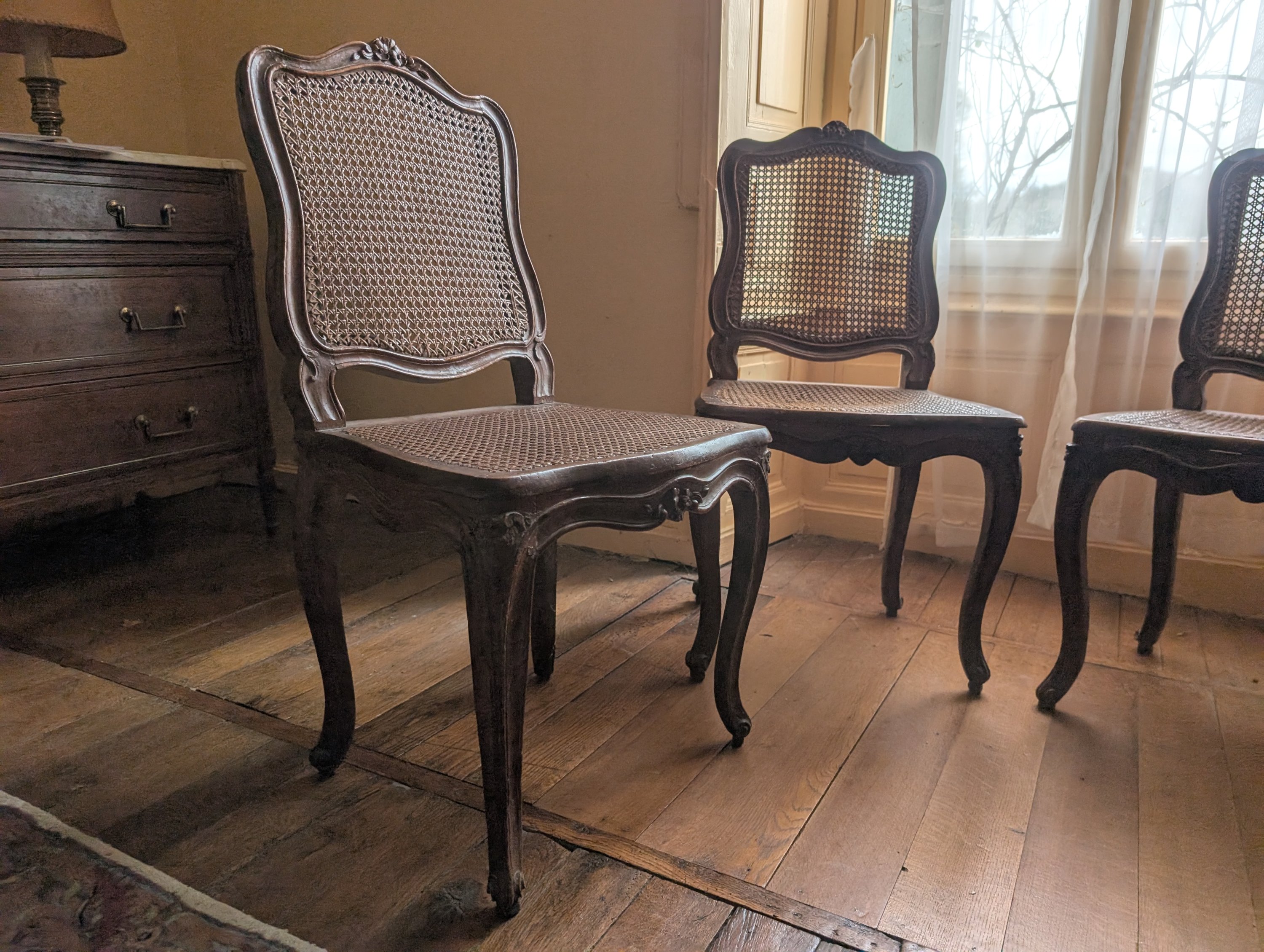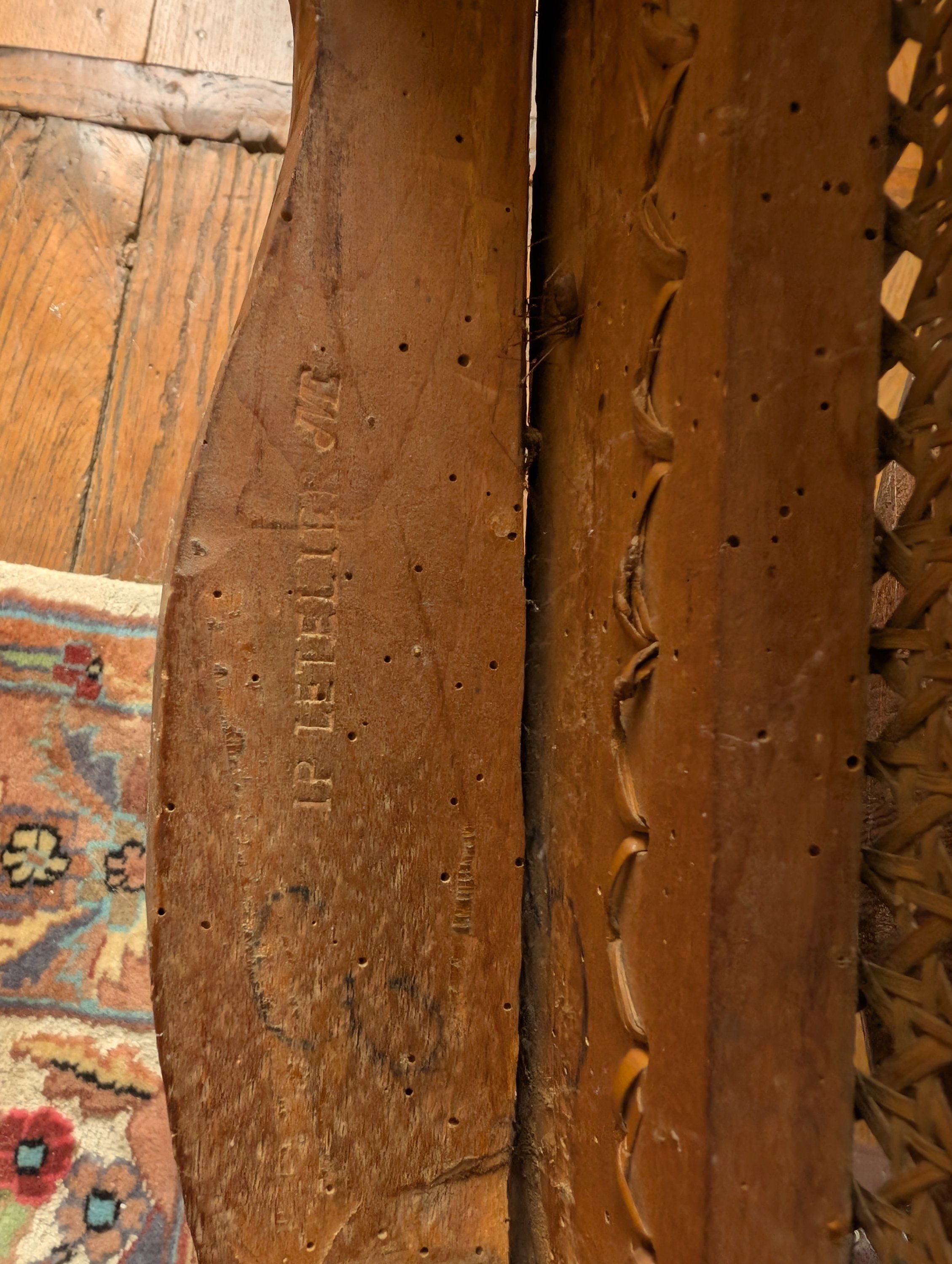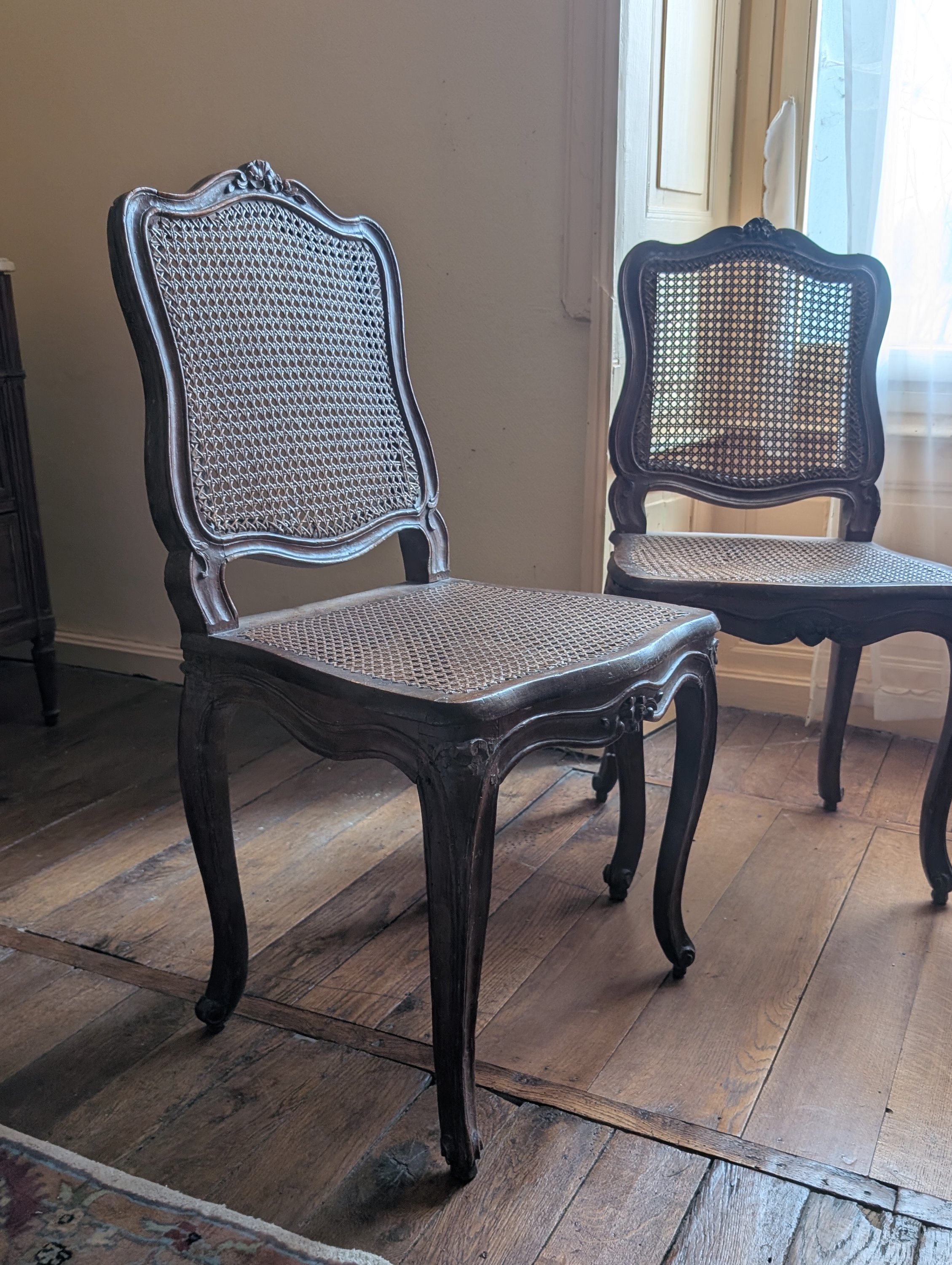 en hêtre mouluré et sculpté, à dossier violonné surmonté d'un bouquet de fleurs. Les assises chantournées reposent sur des pieds cambrés.