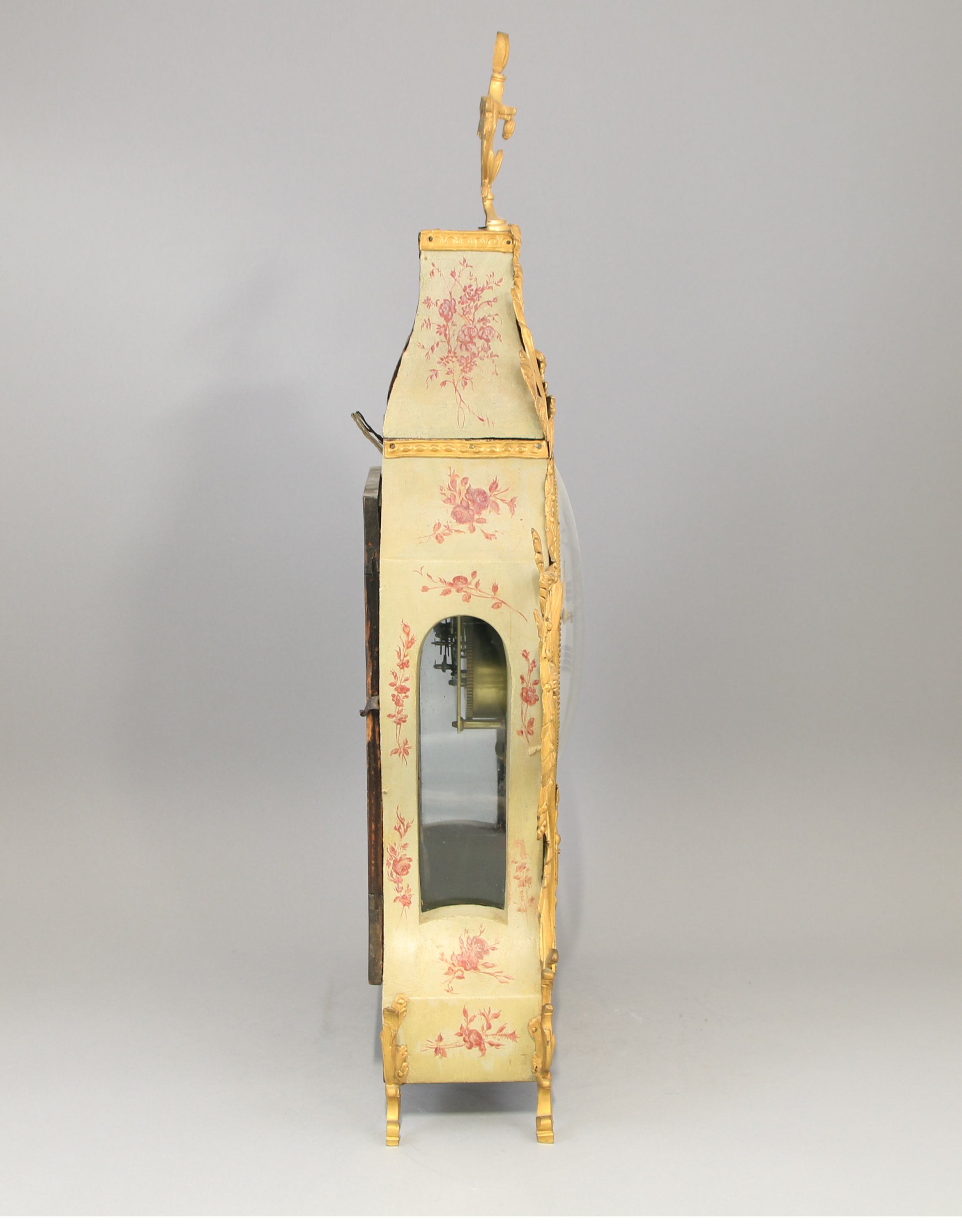 en vernis Martin coiffé en partie supérieure d'un vase. Le cadran émaillé blanc indiquant les heures en chiffres romains, les minutes par un chemin de fer.