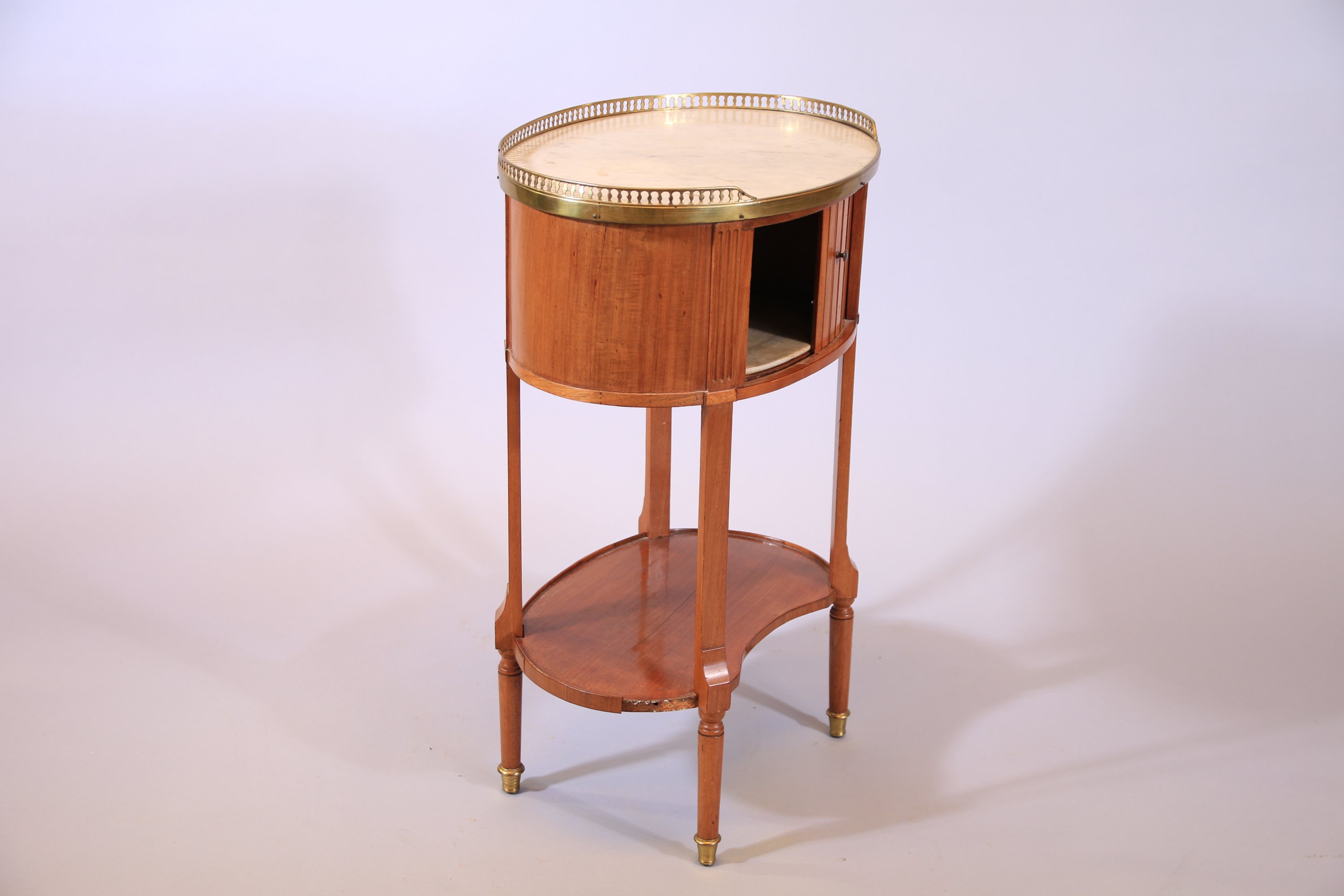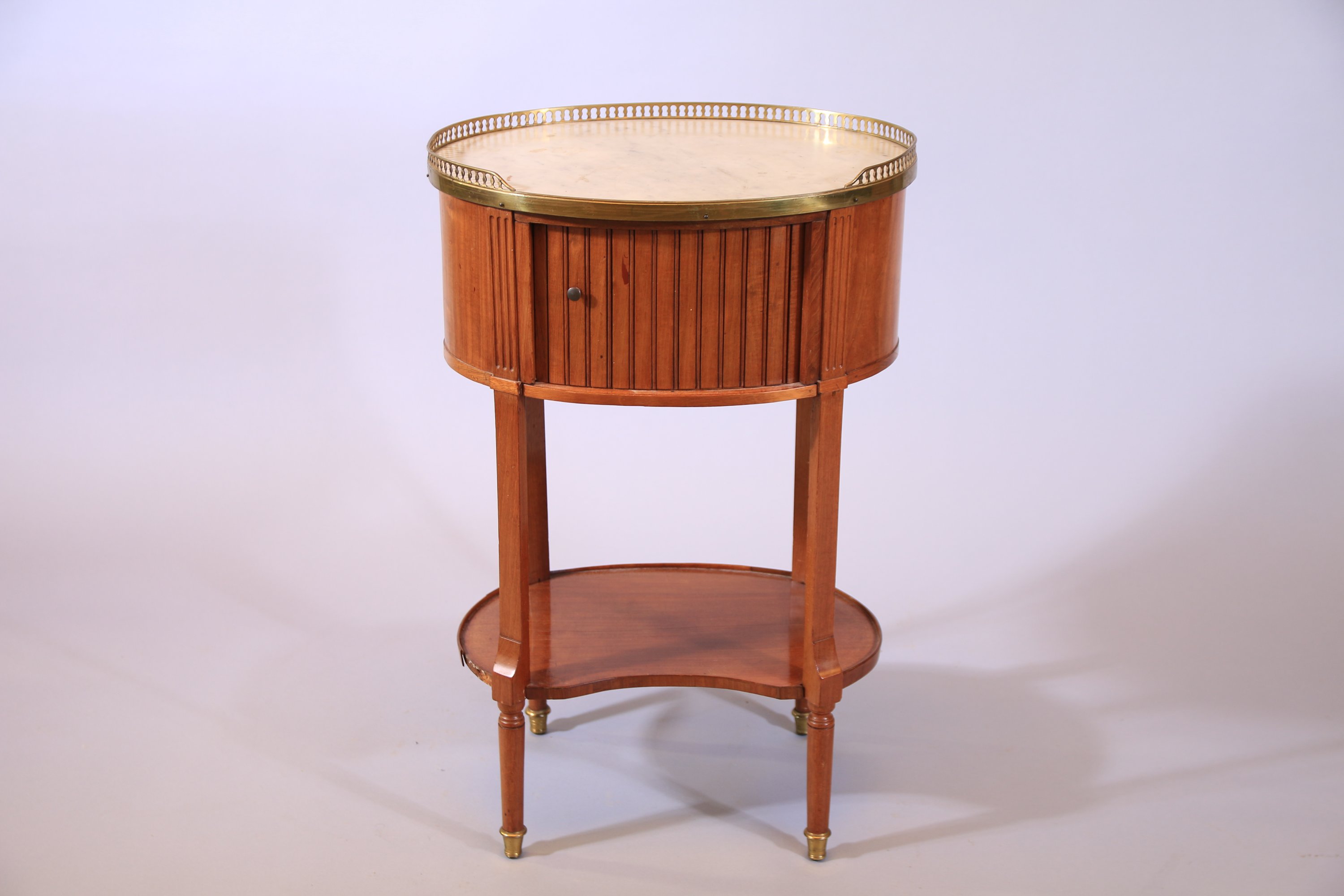 en acajou et placage d'acajou, surmontée d'un plateau de marbre blanc cerclé d'une galerie de laiton ajouré, elle ouvre par un rideau en façade dévoilant un second plateau de marbre blanc. Elle repose sur quatre pieds droits terminés en gaine et sabotés de laiton, réunis par une tablette d'entretoise.