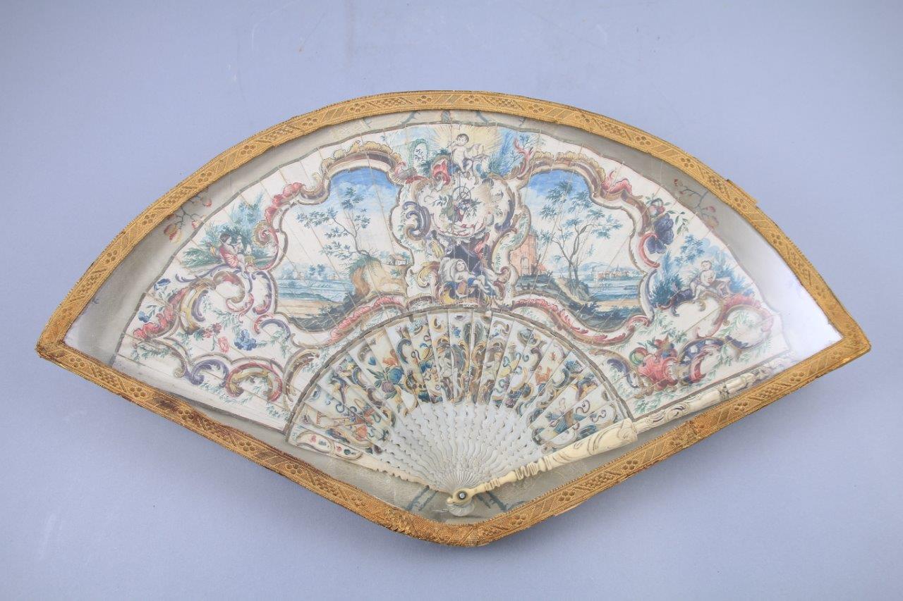 à brins en os. La feuille à décor de deux cartouches entourant un enfant rêvant.