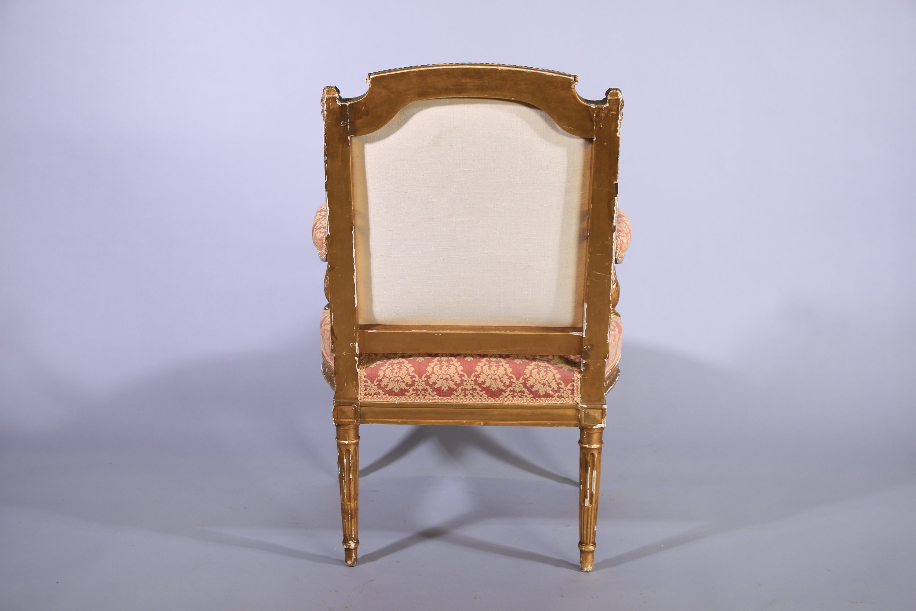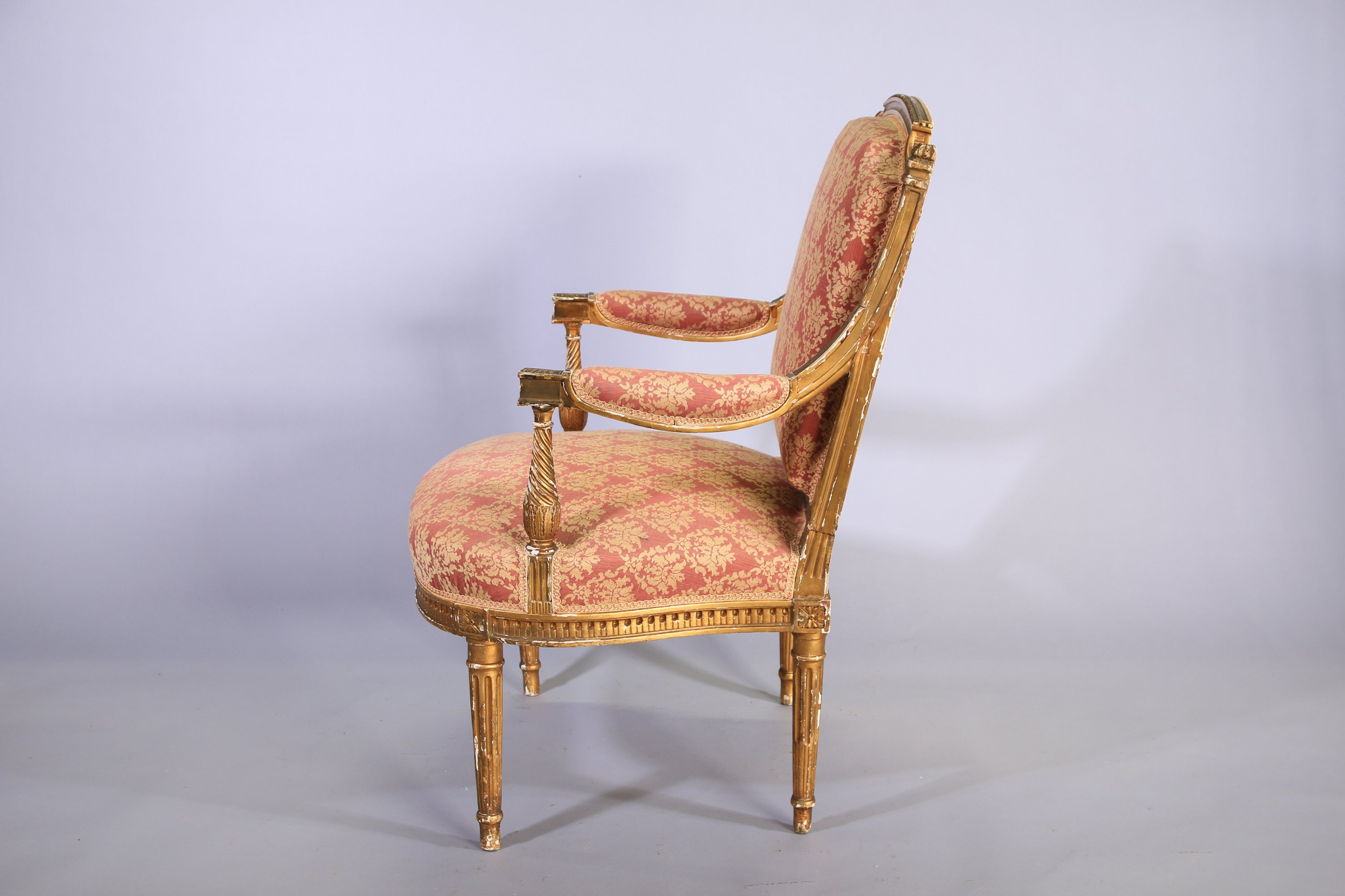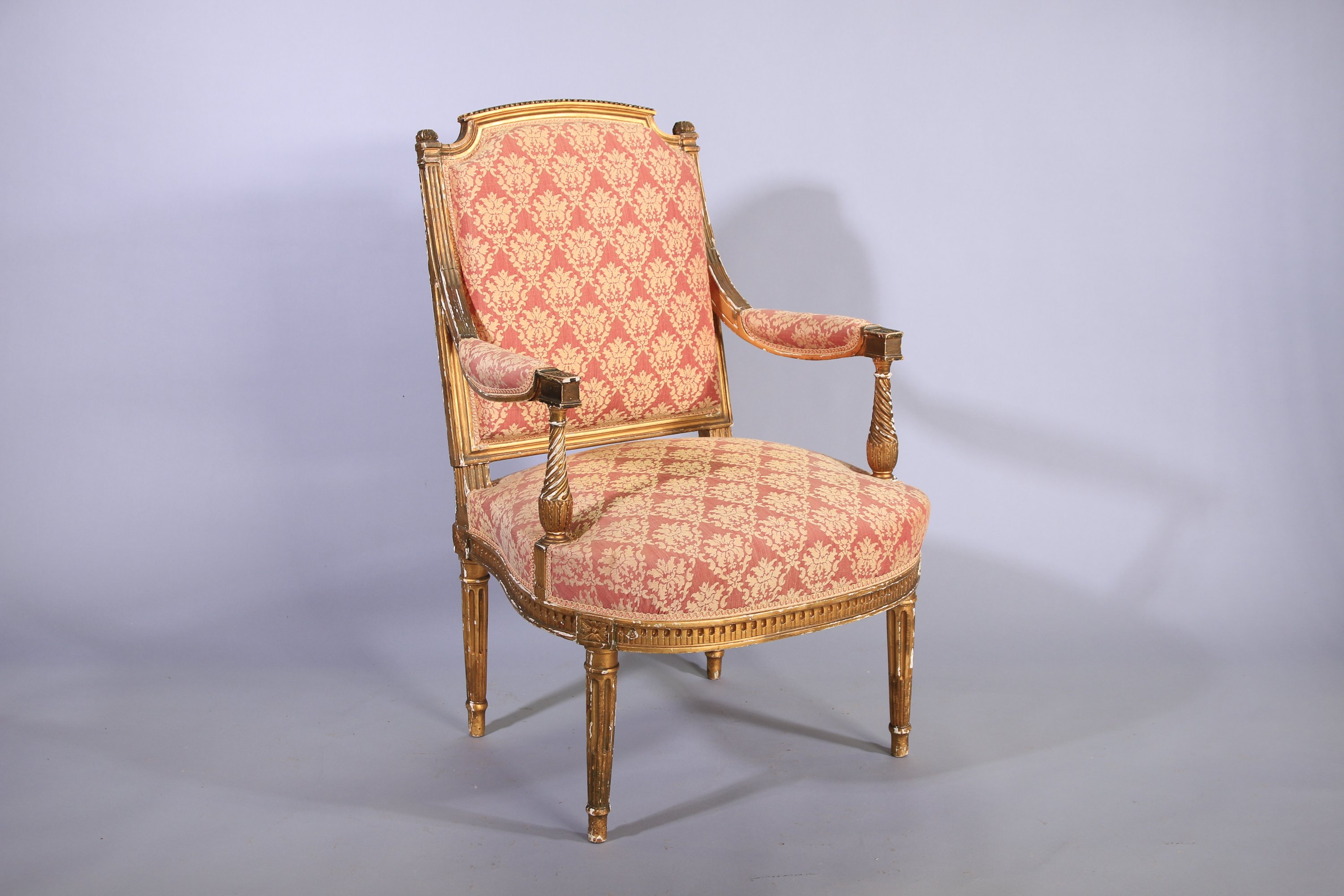 en bois mouluré, sculpté et doré à dossier en chapeau de gendarme, les accotoirs à manchettes reposant sur des supports en colonne torsadée. L'assise en fer à cheval soutenue par quatre pieds cannelés et rudentés.
