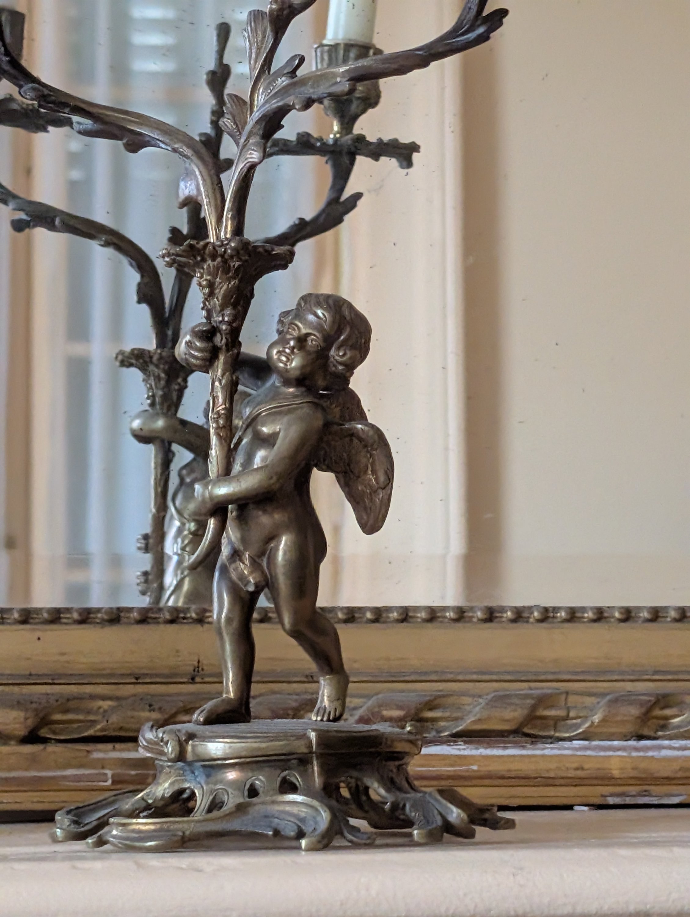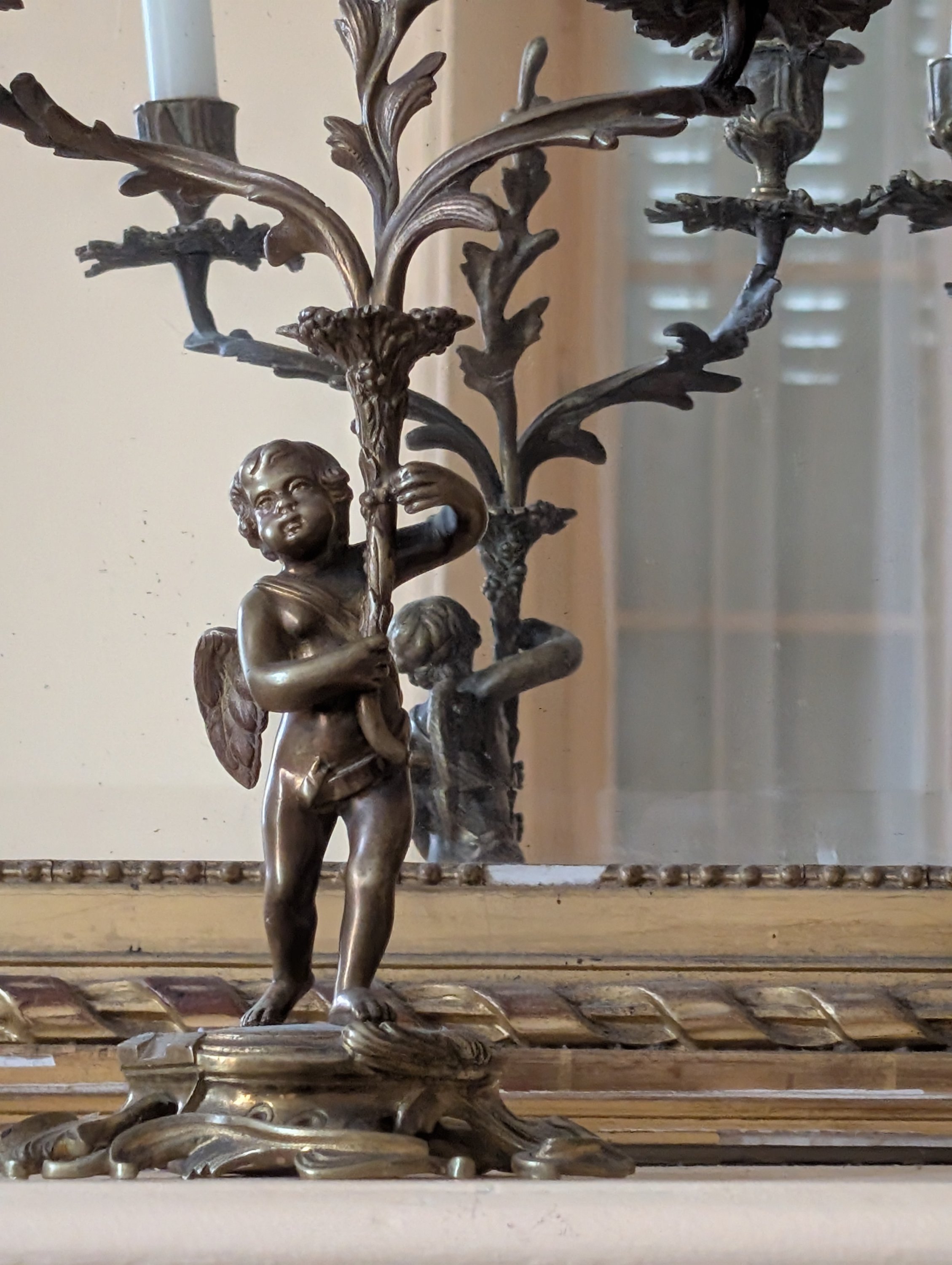 en bronze, avec des putti soutenant une gerbe à deux bras de lumière reposant sur des bases de rinceaux et de rocailles.