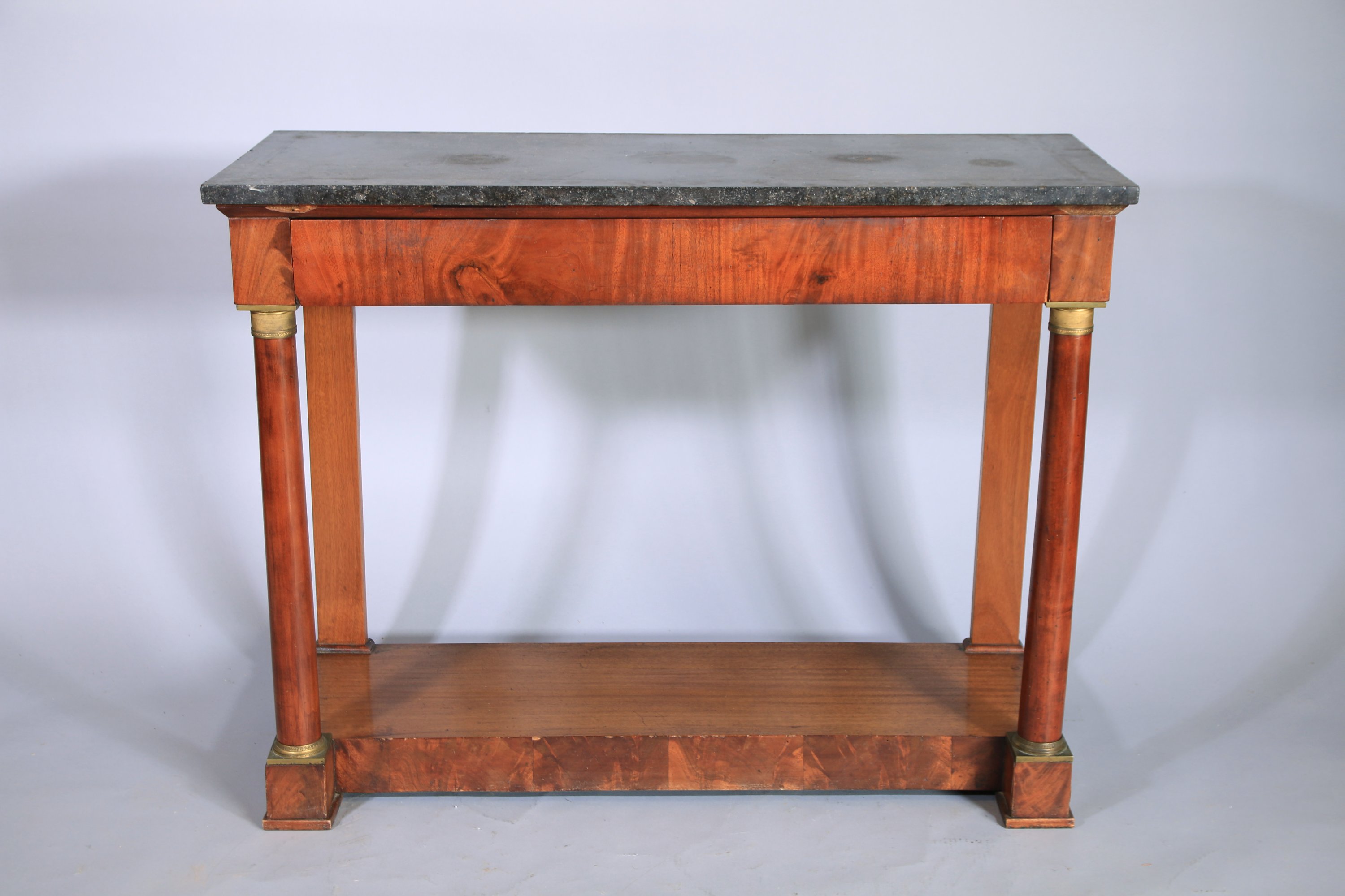 en acajou et placage d'acajou. Elle ouvre par un tiroir en ceinture et repose sur quatre montants, les deux antérieurs imitant des colonnes aux chapiteaux et bases en bronze doré, réunis par une tablette d'entrejambe.