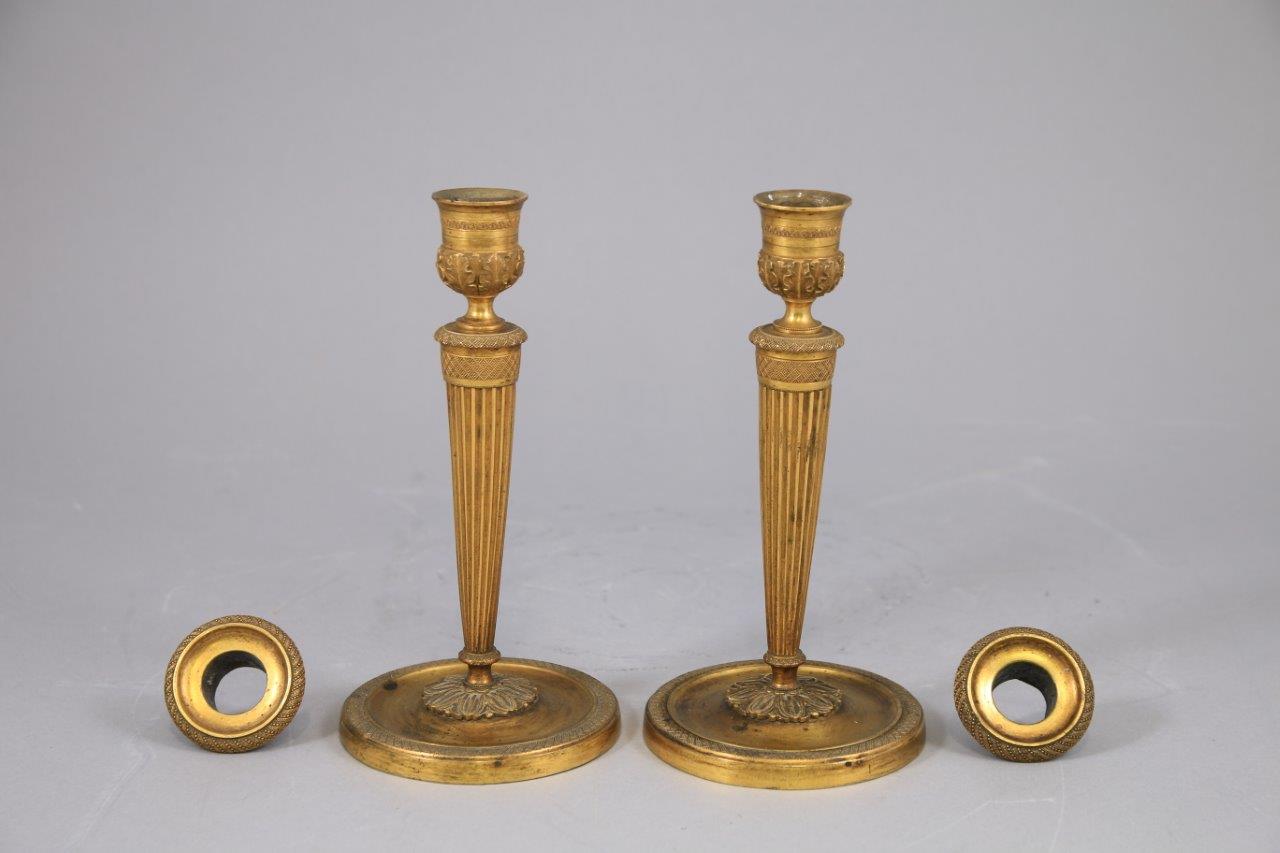 en bronze ciselé et doré. Les bobèches sont à décor de rangs de perles torsadés, les binets ornés de feuilles d'acanthe reposant sur des fûts cannelés et fuselés. La base circulaire soulignée d'une terrasse à motif floral.