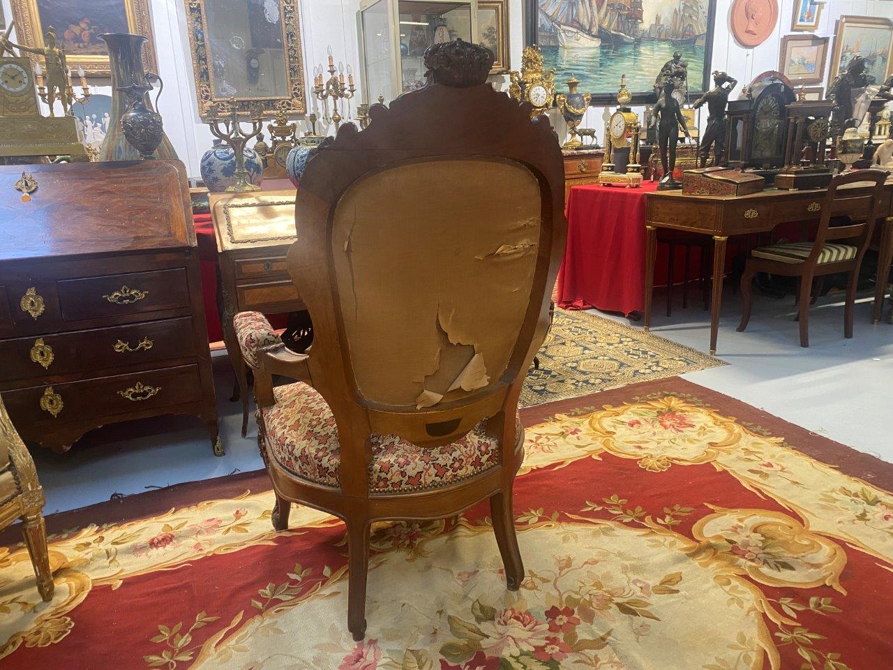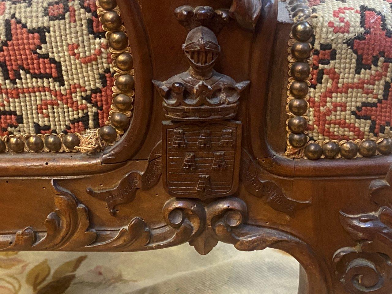 en bois sculpté. Le dossier en cabriolet, accotoirs à manchettes, aux chiffres de Marie Thérèse de France d'une part et du Marquis de Vilette d'autre part.