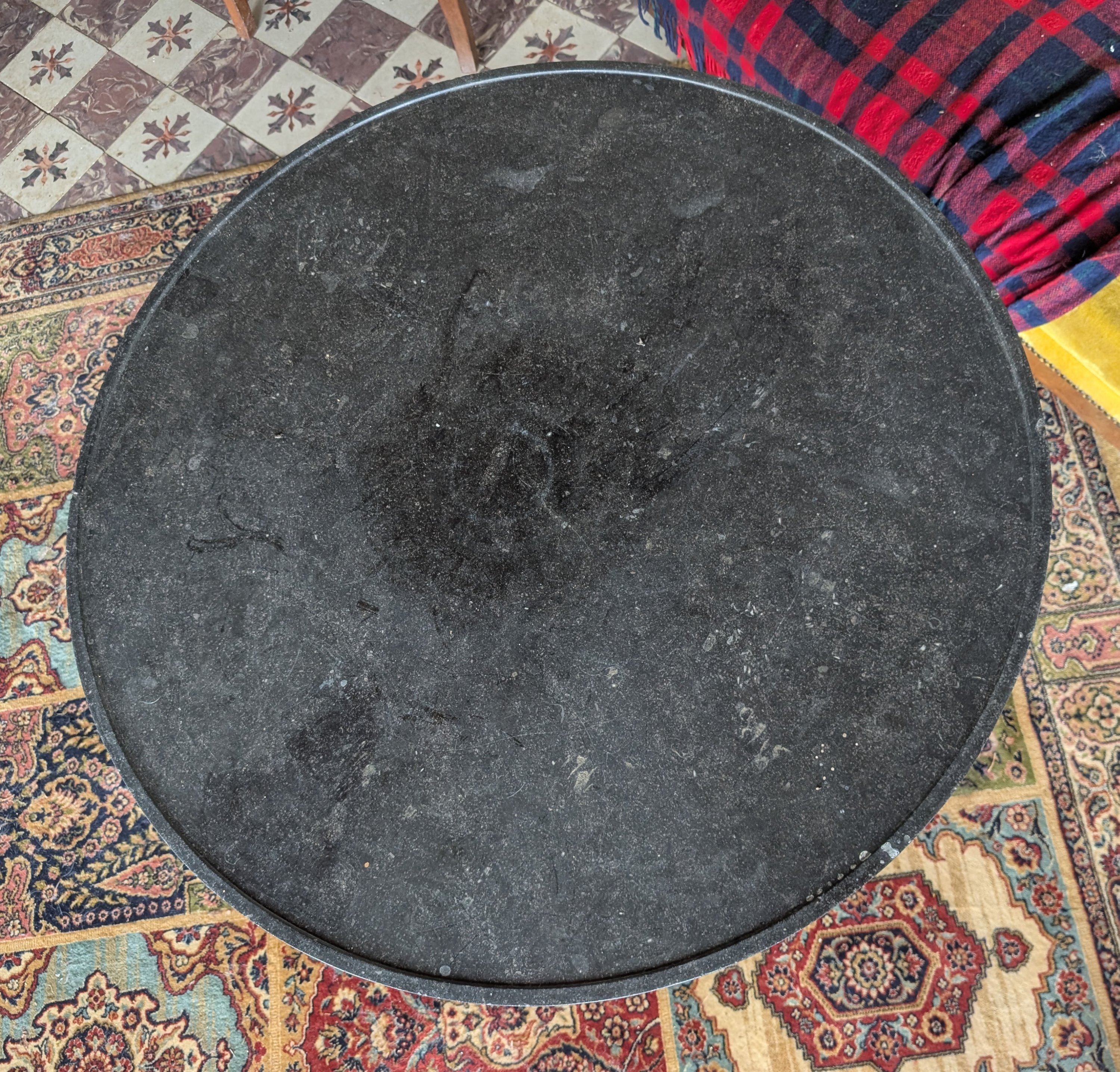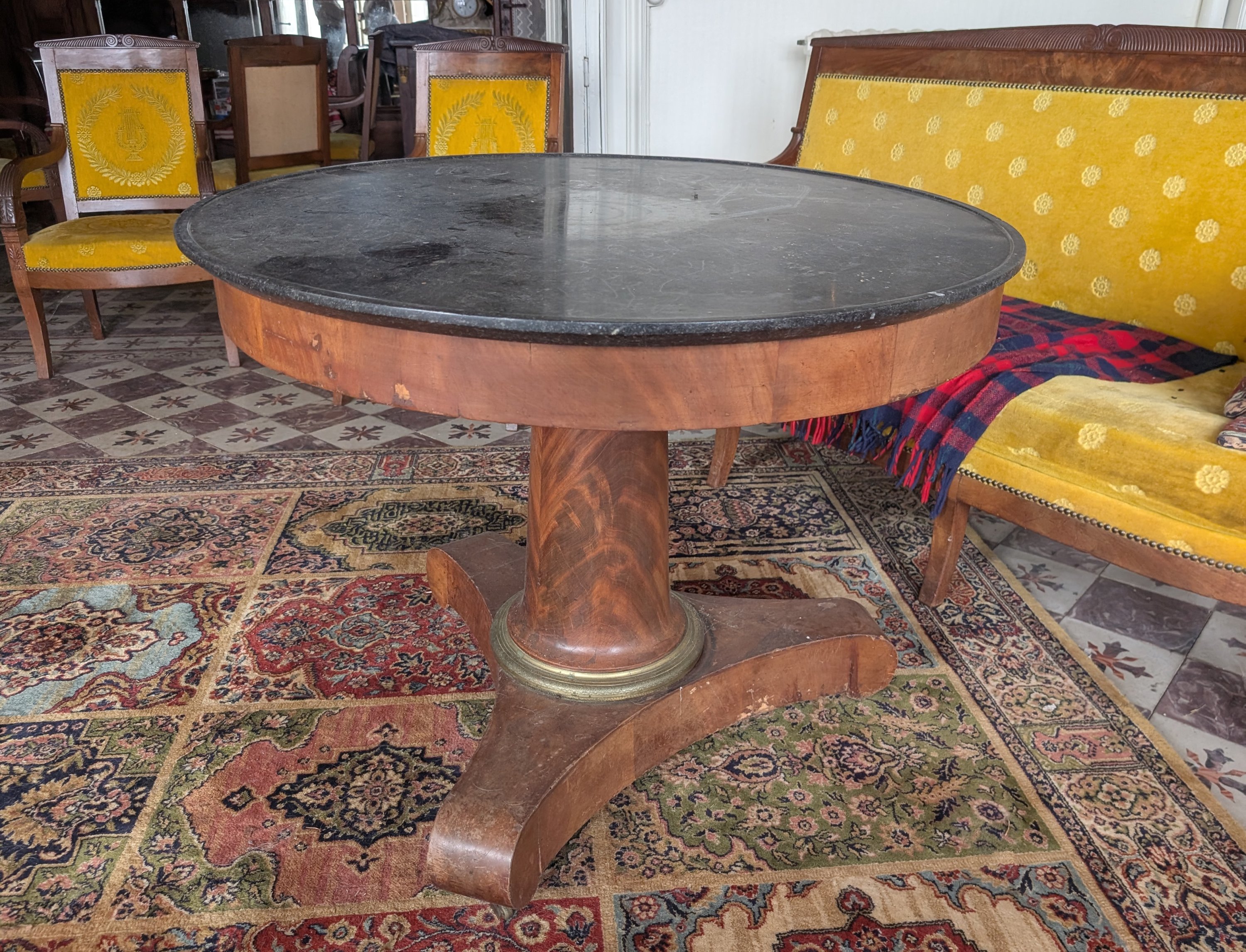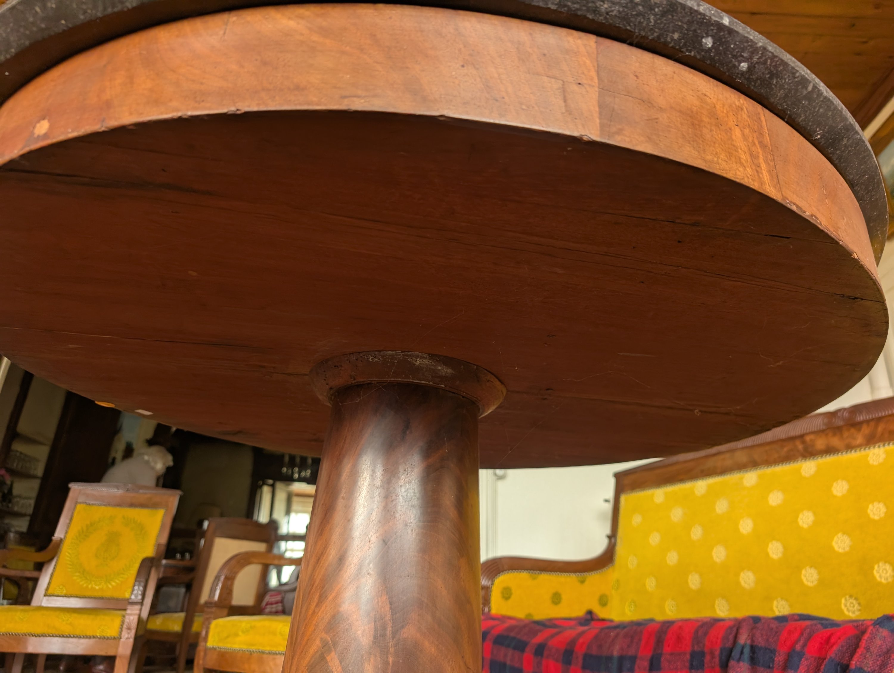 en acajou et placage d’acajou, ceinture à bandeau soutenue par une colonne à bague de bronze et reposant sur une base triangulaire aux côtés incurvés.