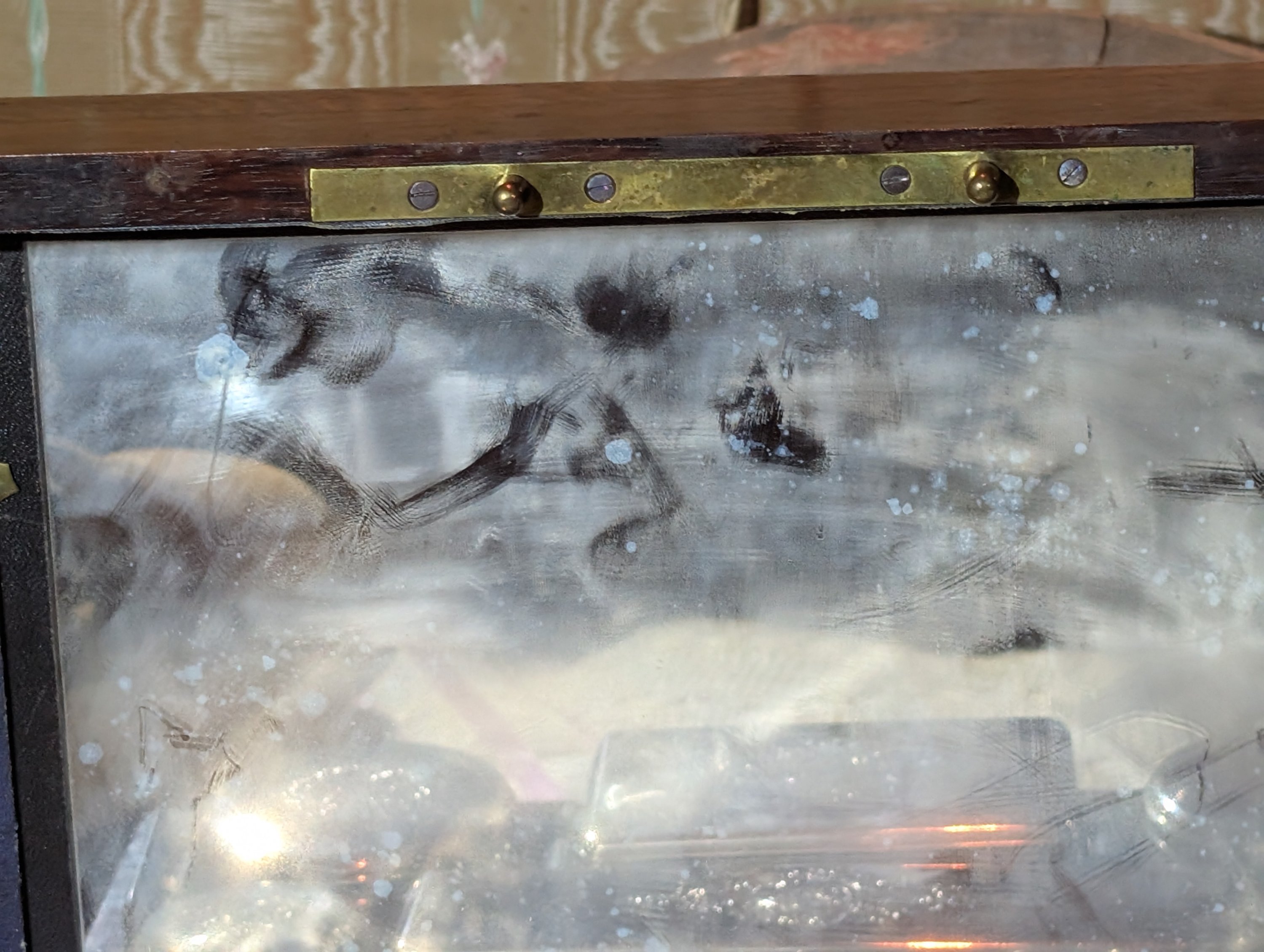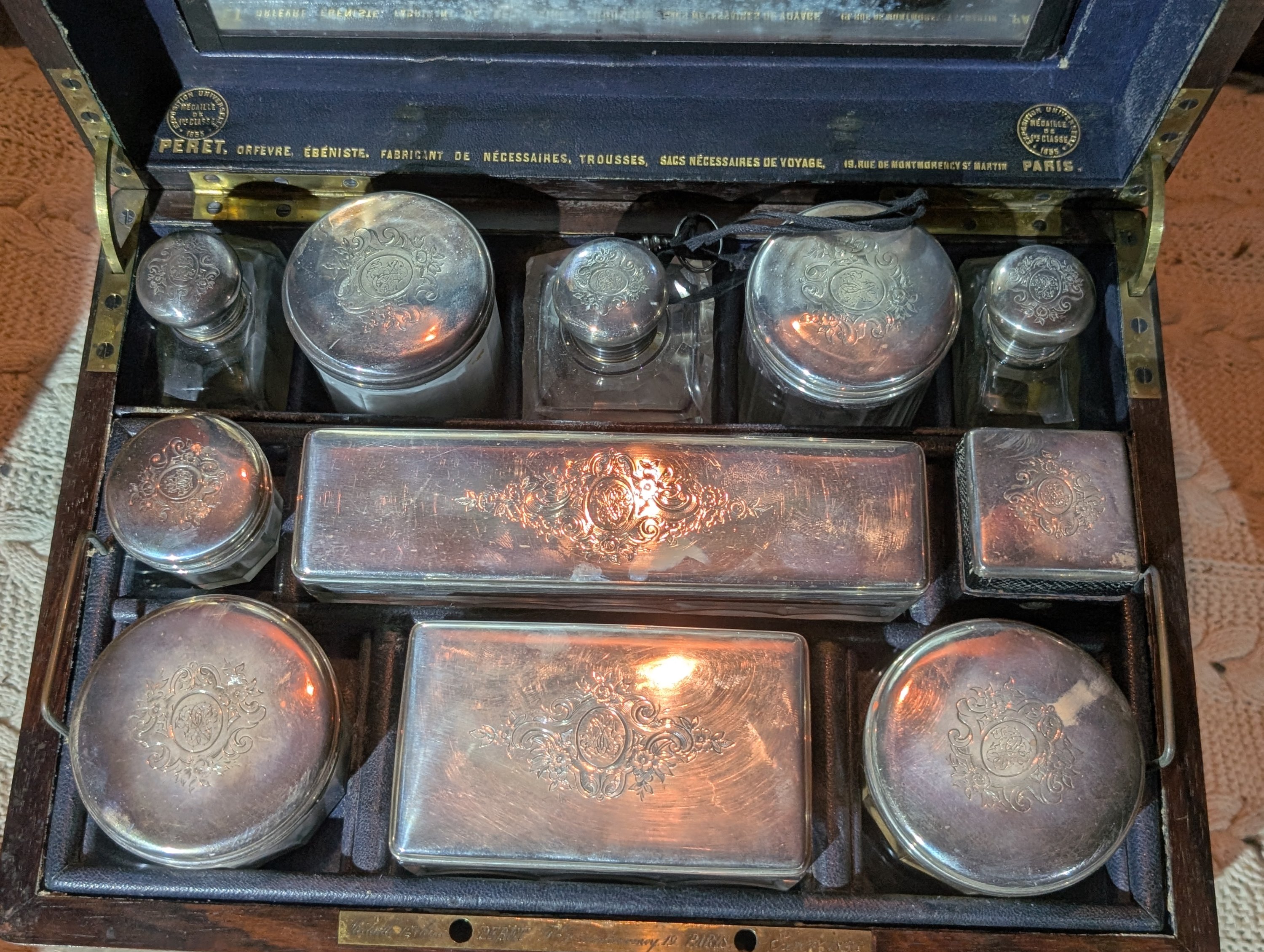 Coffret en palissandre chiffré sur le dessus en laiton incrusté. Il est garni de 11 pots à fards aux couvercles monogrammés en argent et sur les plateaux inférieurs d'ustensiles de toilette et autre brosses. Signé sur la platine de serrure " Médaille 1ère classe PERET Montmorency 19, Paris Exp. 1855". Dans sa housse en tissu.