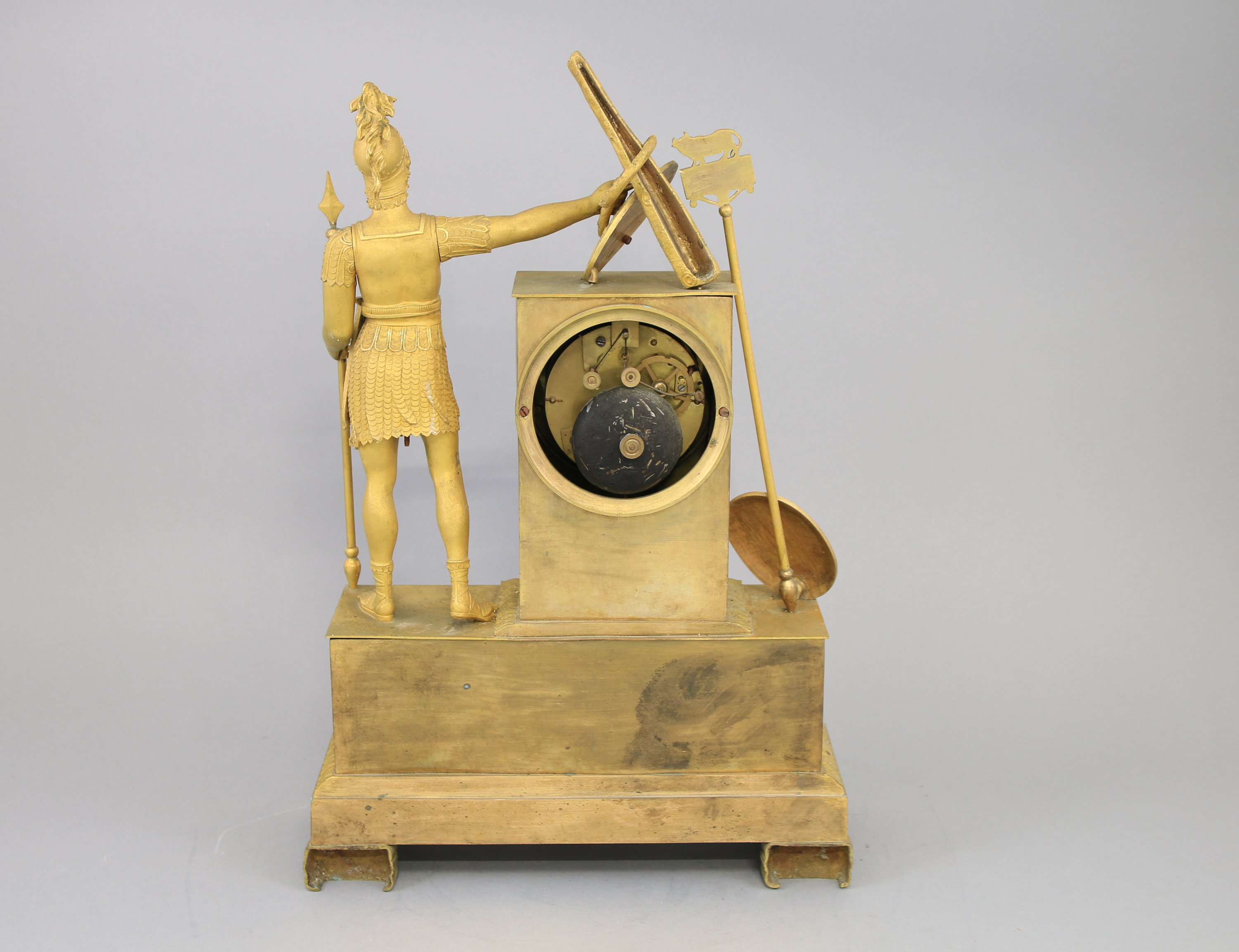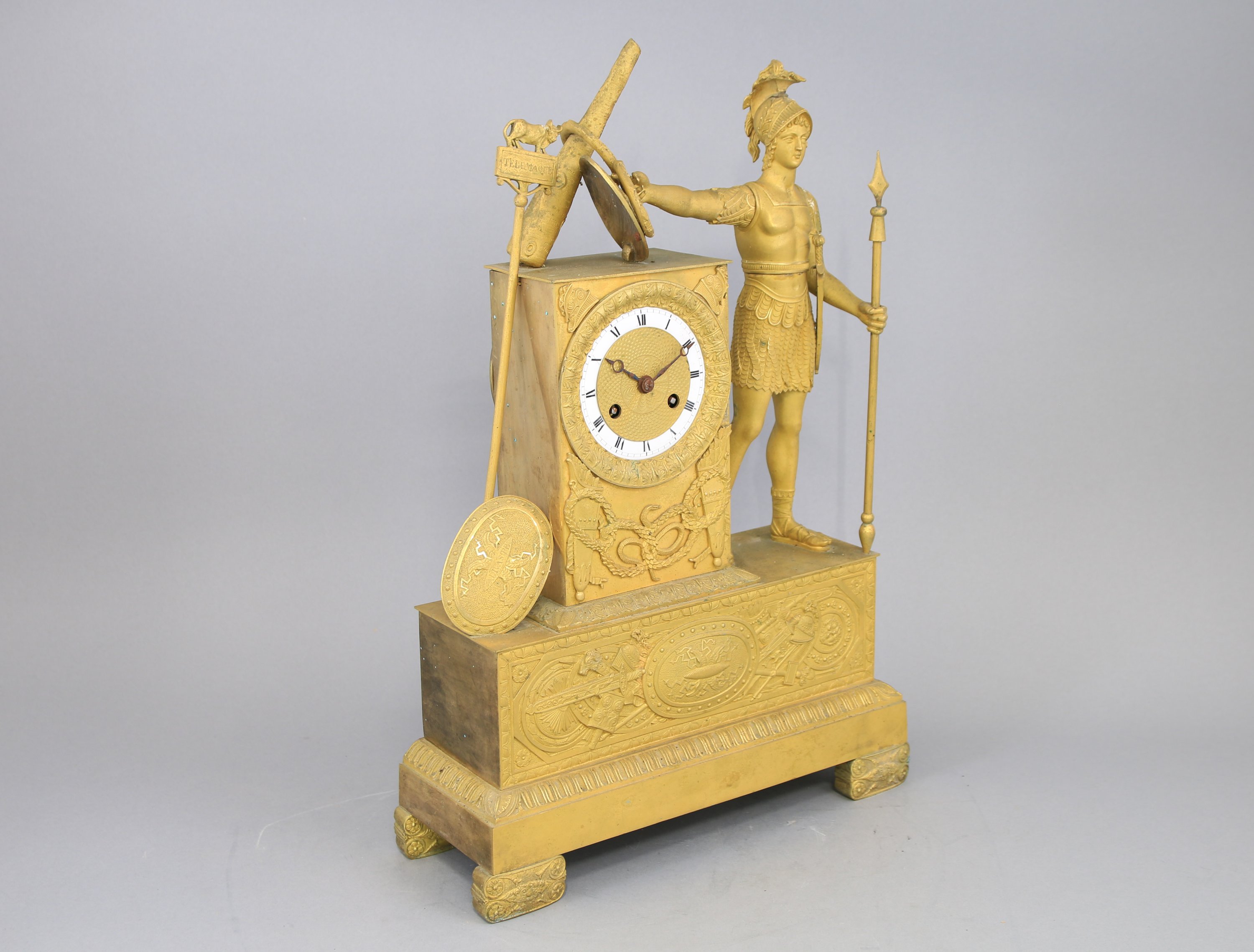 en bronze doré. Le cadran inscrit dans une borne indique les heures en chiffres romains, les minutes par un chemin de fer. Il est surmonté d'un trophée d'armes soutenu par Télémaque. La partie inférieure de la borne est décorée de deux carquois entrelacés par un serpent. La base rectangulaire est ornée d'un bouclier et de trophées d'armes. Elle repose sur quatre pieds à double volutes.