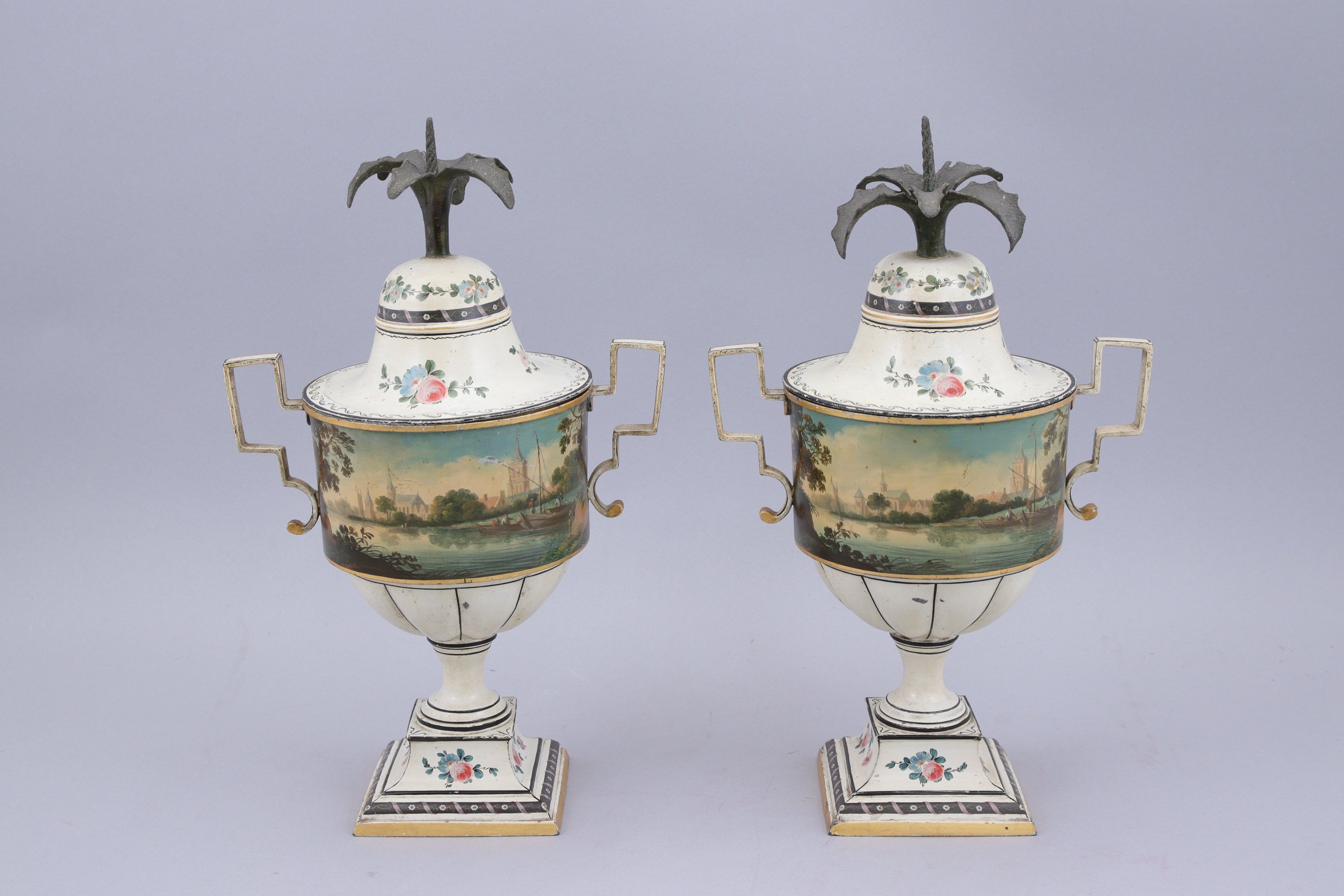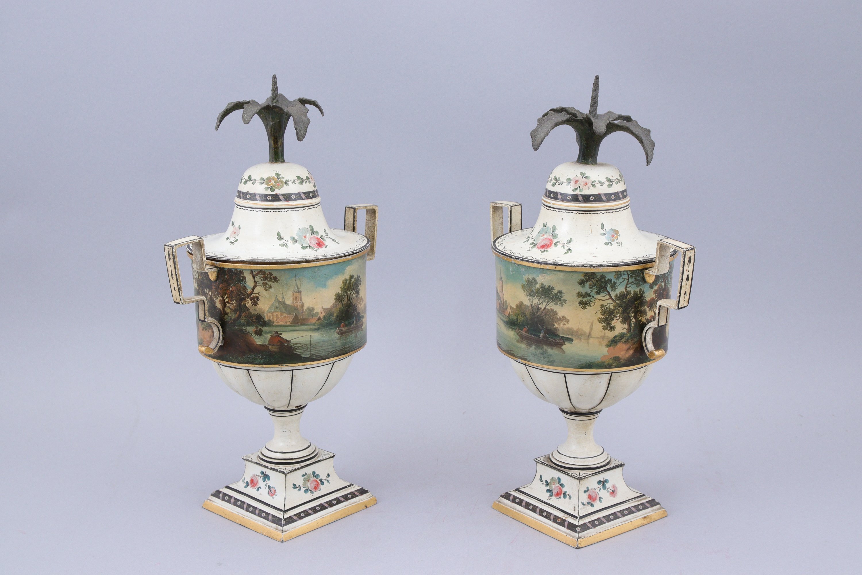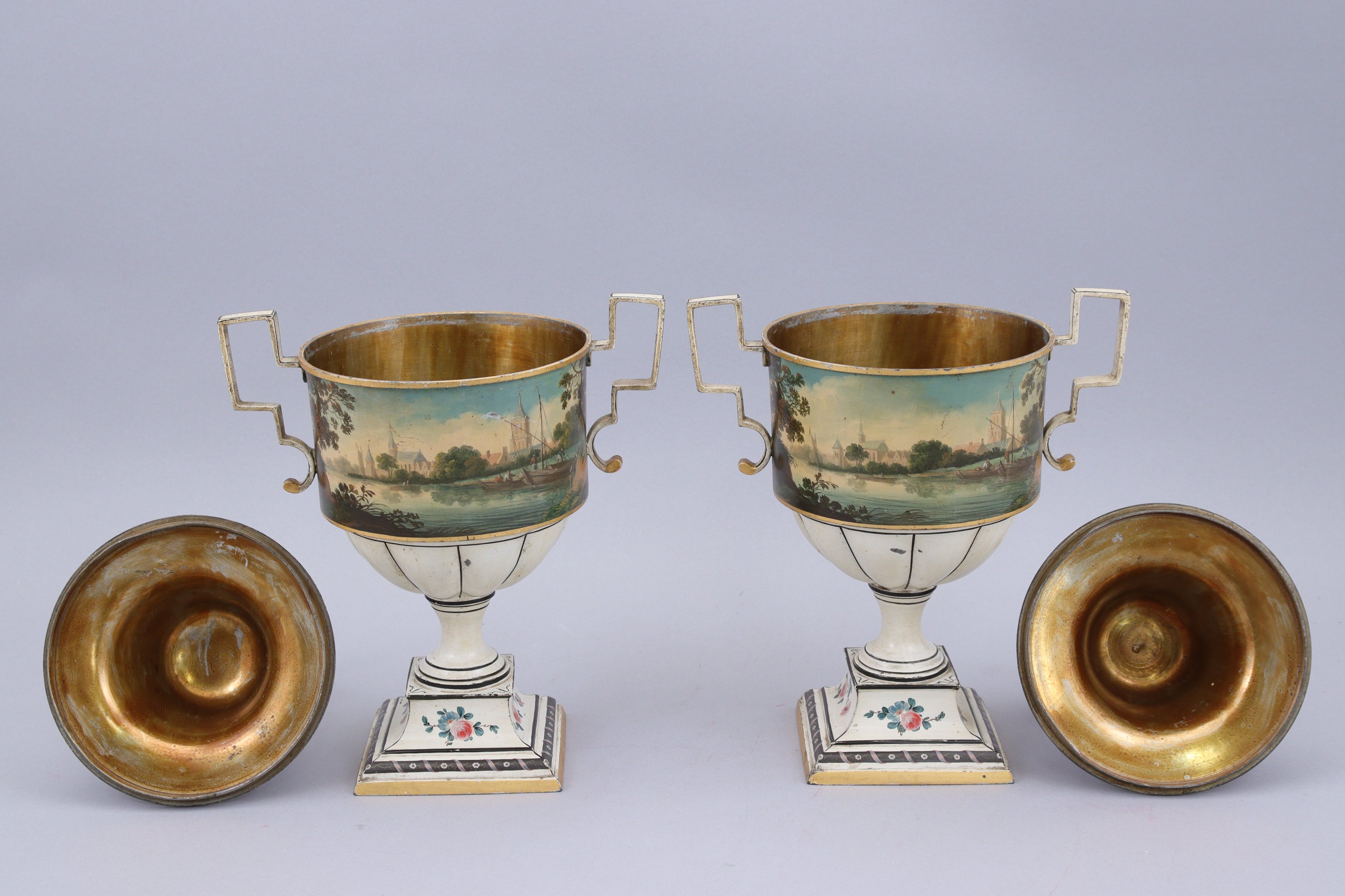 en tôle émaillée, aux anses géométriques, à décor peint de pêcheurs devant un village, sur un piédouche orné de roses.