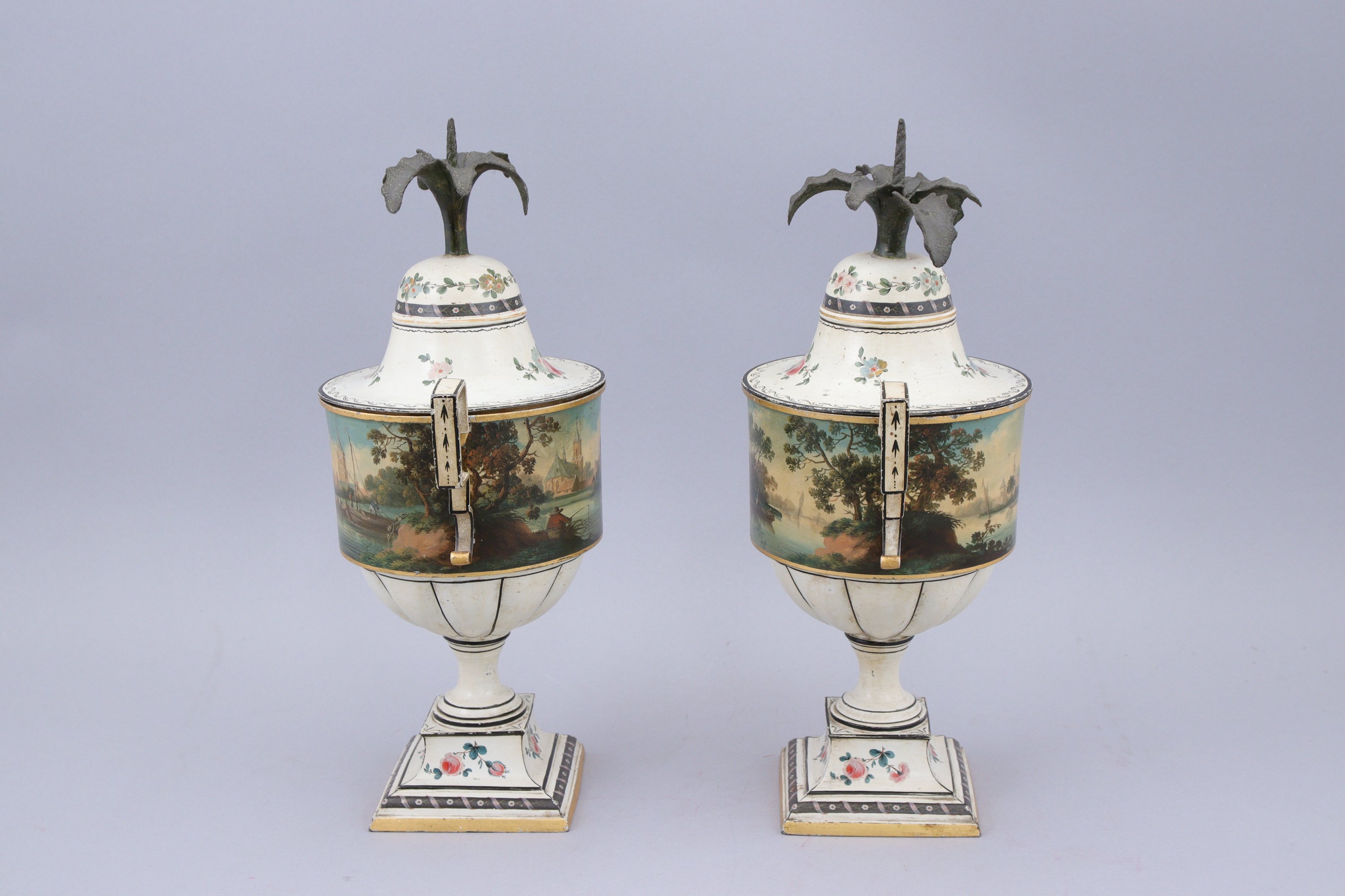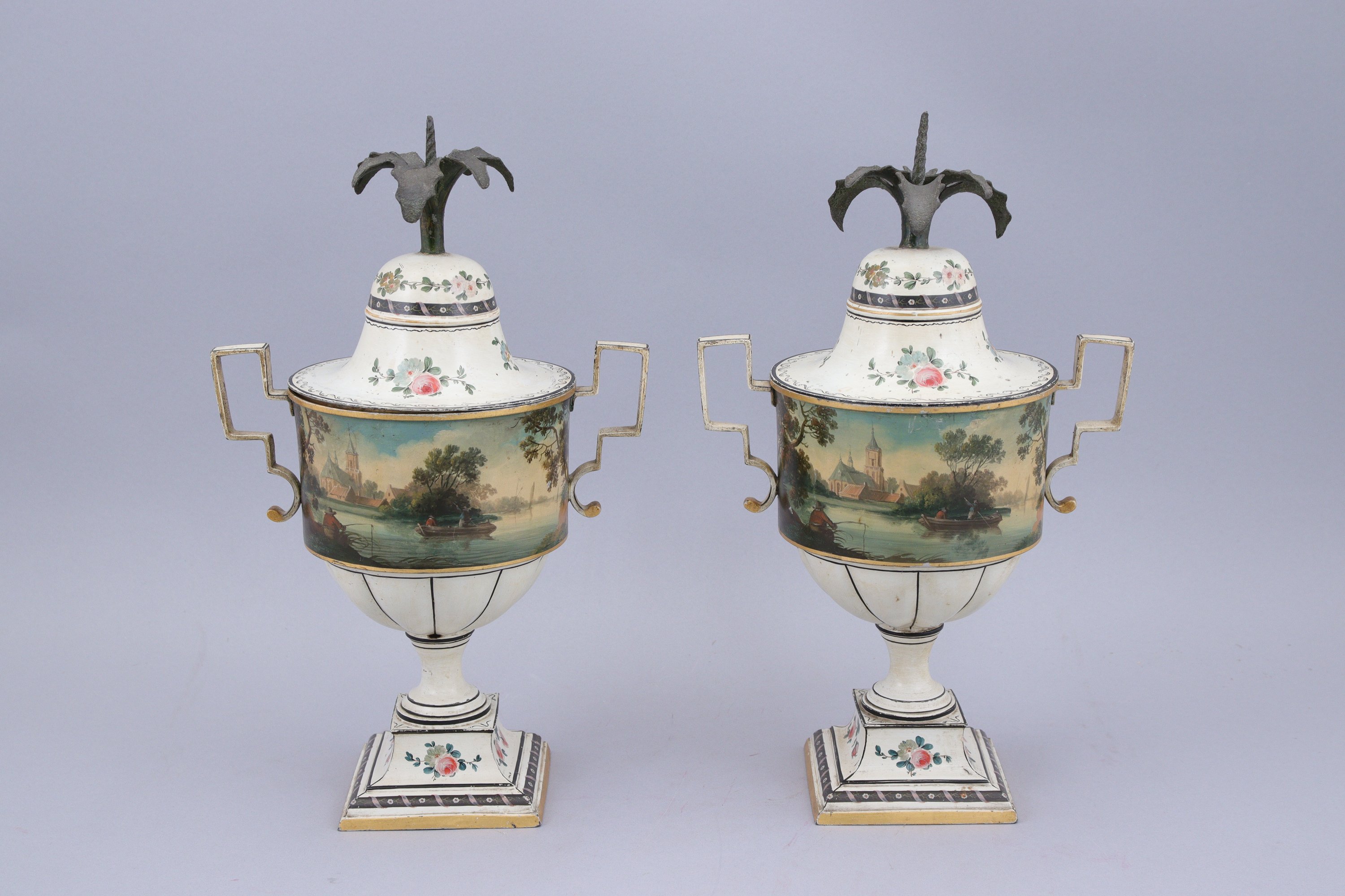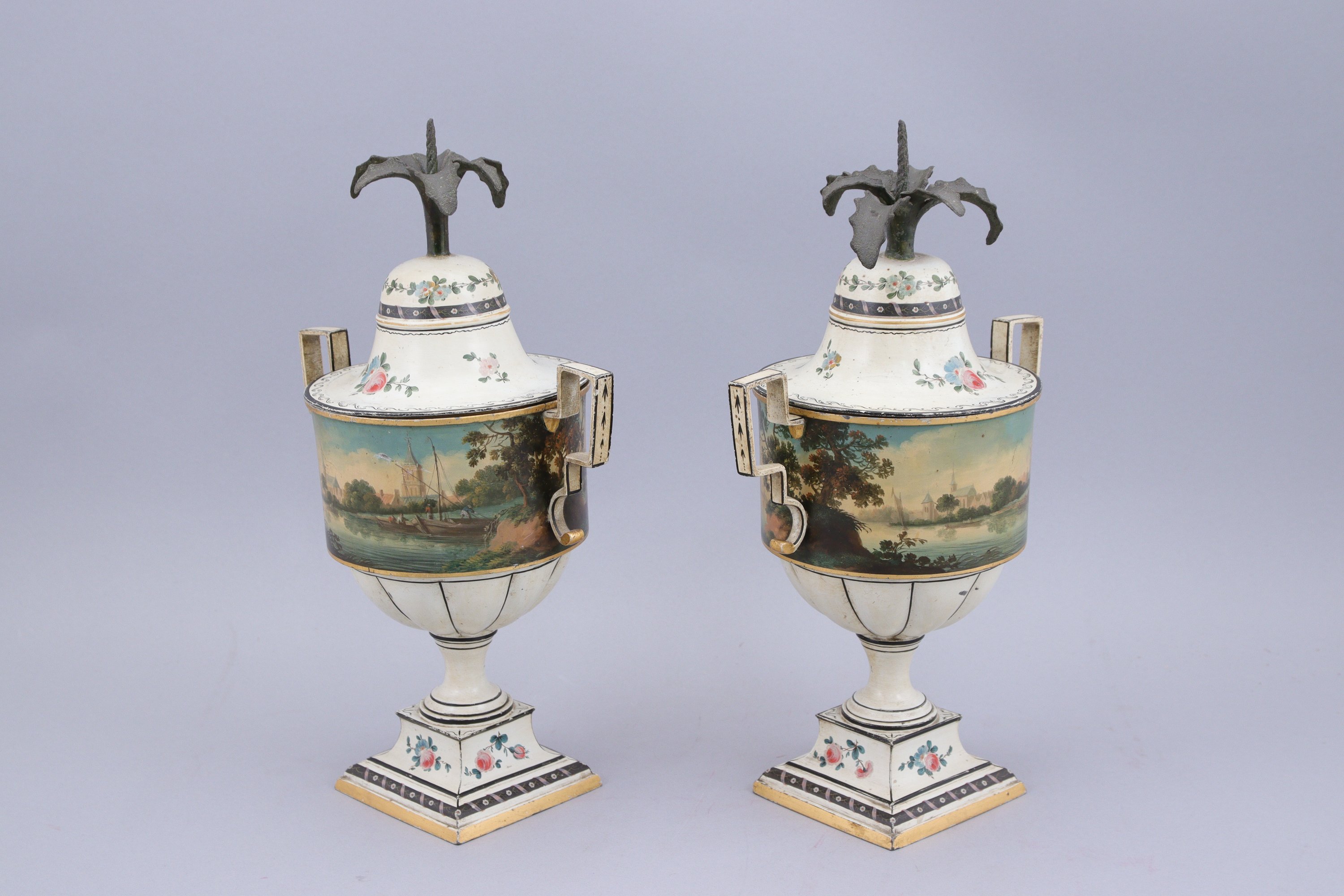 en tôle émaillée, aux anses géométriques, à décor peint de pêcheurs devant un village, sur un piédouche orné de roses.
