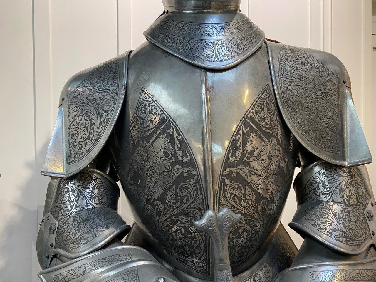 Blindage en acier poli, incisions de motifs floraux sur une grande partie de la surface.