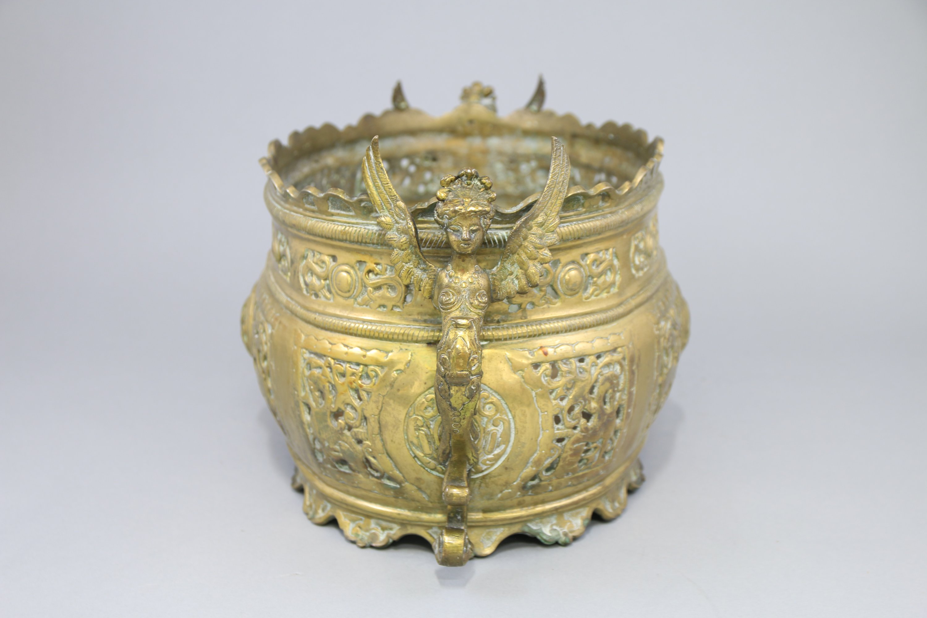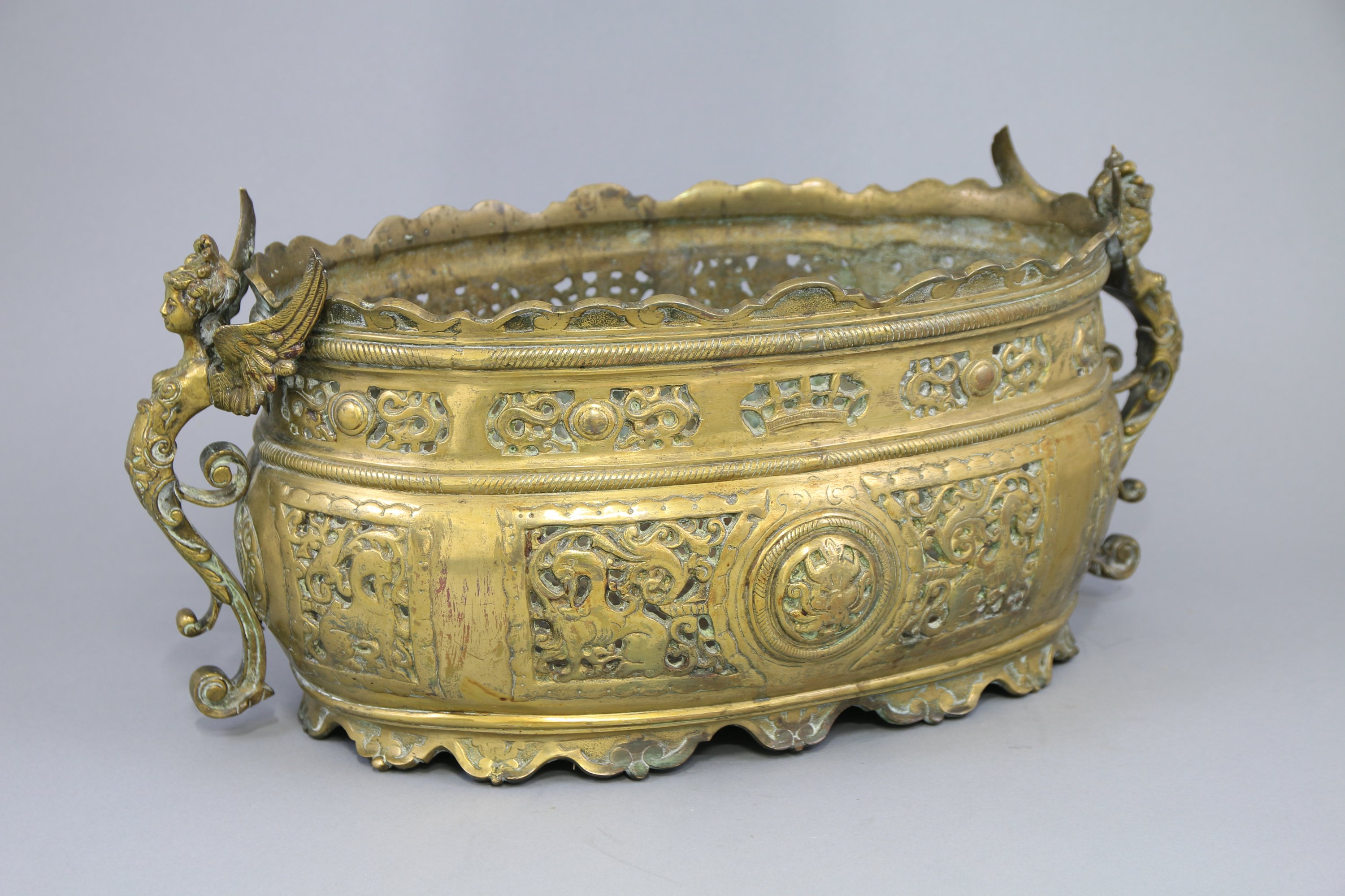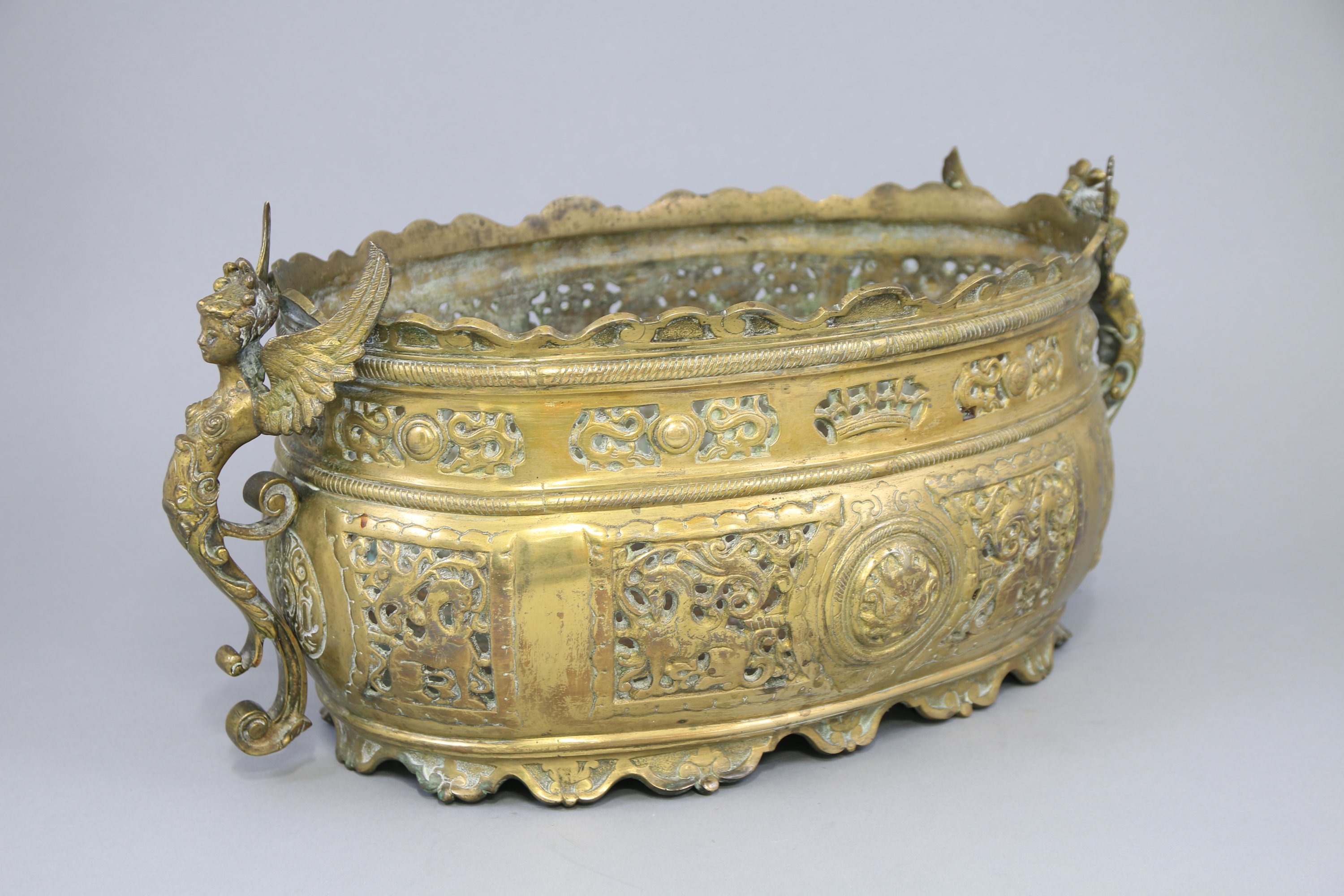 en bronze doré de forme ovale à deux anses retenues par un col à décor de vaguelettes surmontant des cartouches de rinceaux ajourés. Au centre, une couronne coiffe un médaillon entouré de deux dragons sur fond de rinceaux. Elle repose sur une base contournée.