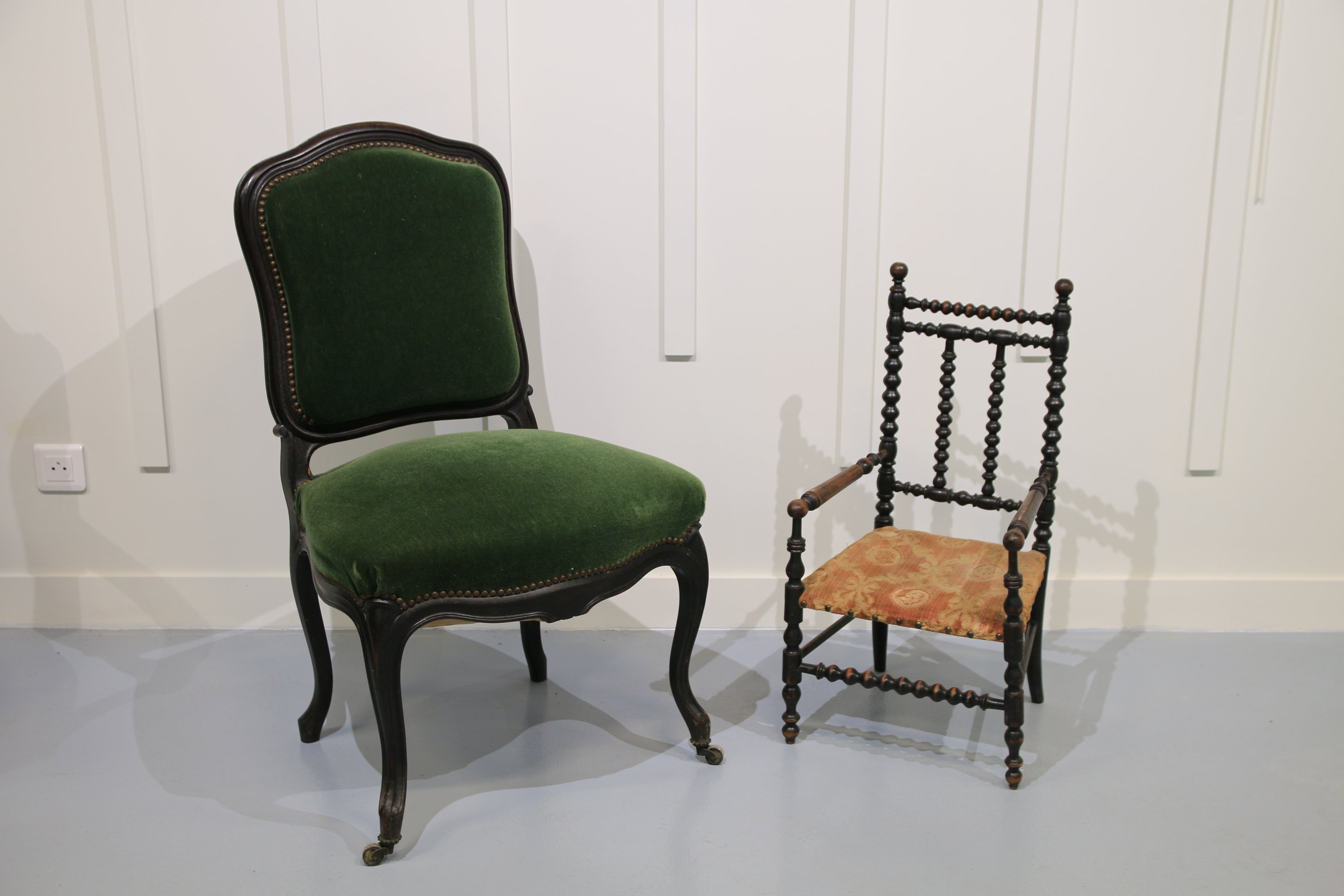 - Une chaise en bois noirci à dossier à la Reine reposant sur quatre pieds cambrés, les antérieurs terminés par des roulettes. Epoque Napoléon III. Recouverte d'un velours vert. Haut. 92 Larg. 55 Prof. 49 cm. (attaques d'insectes xylophages) ;