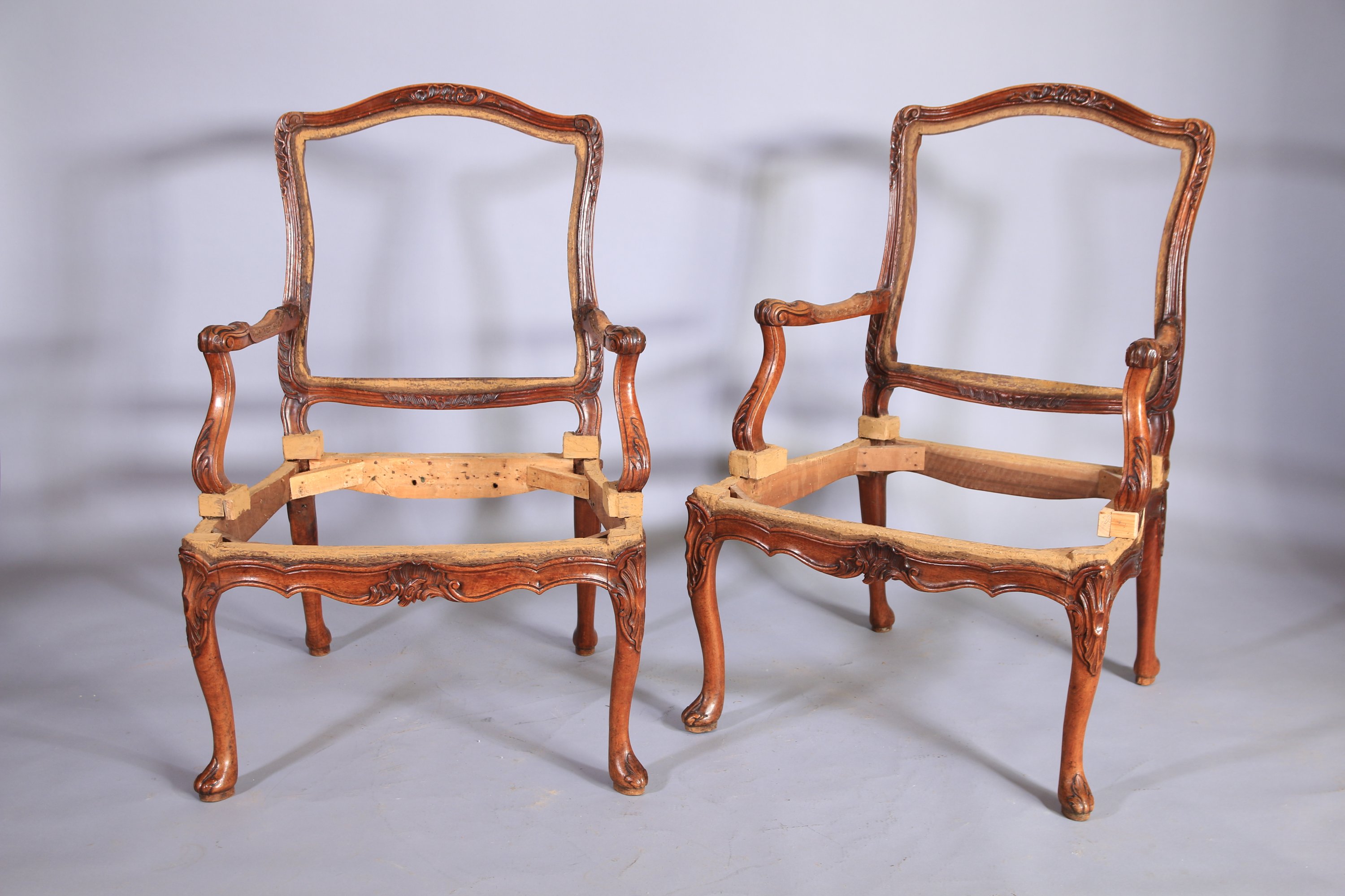 en bois naturel mouluré et sculpté, le dossier droit décoré de feuillage, les accotoirs dits à manchette reposant sur des supports mouvementés. Quatre pieds cambrés.
