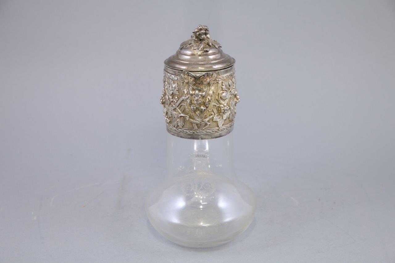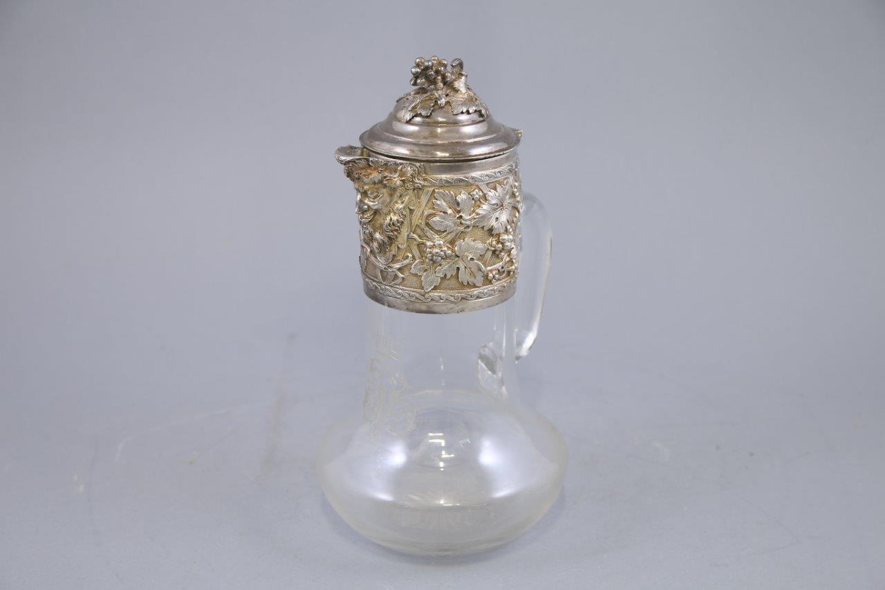en cristal et argent ciselé d'une tête de Bacchus sur le bec verseur dans des pampres et feuillage. Le fretel en grappe de raisin, le corps du broc monogrammé LV sous une couronne comtale.