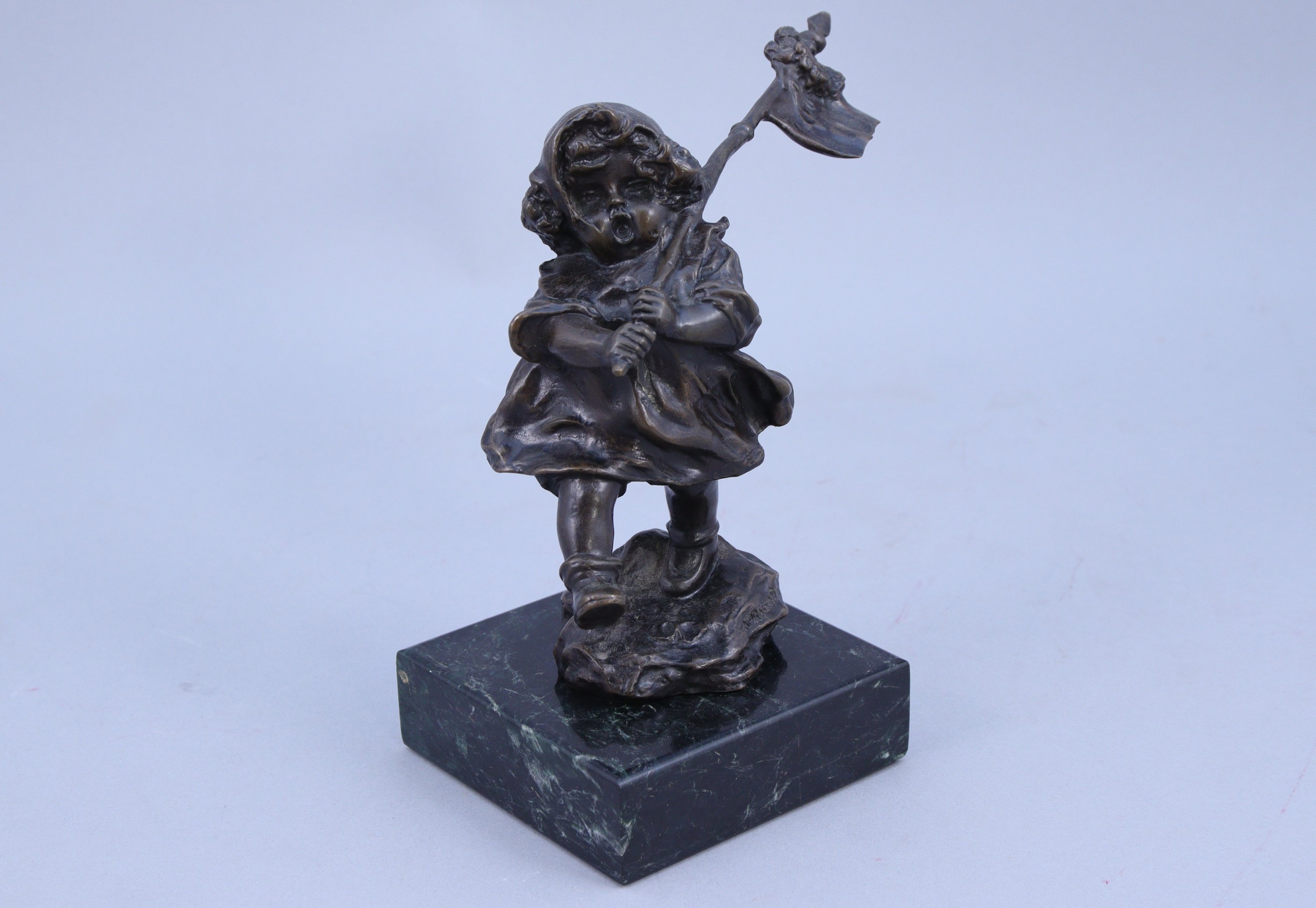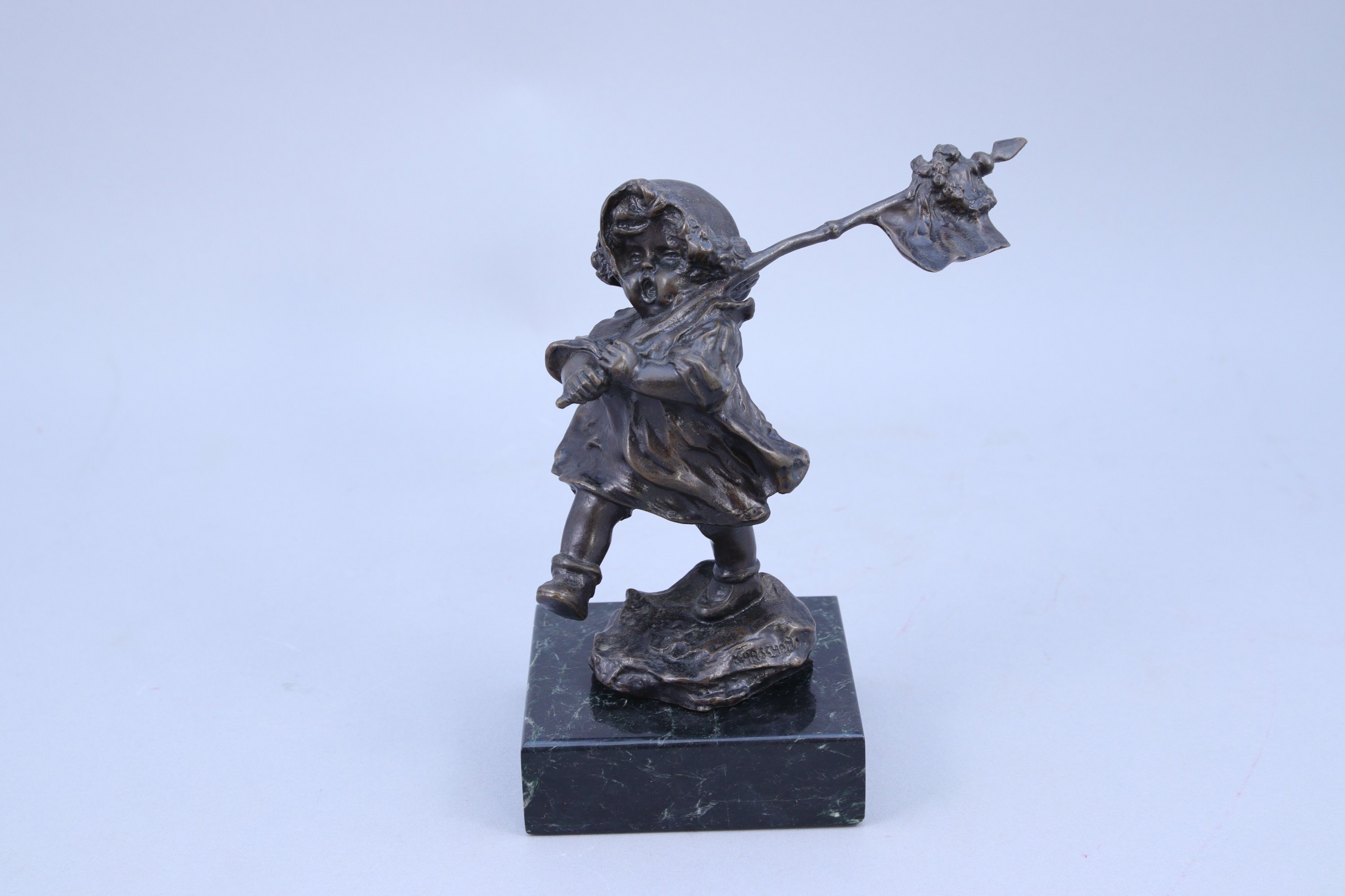 - Fillette au drapeau par Charles Korschann (1872-1943). Bronze, Signé. Haut. 16 cm. Sur un socle en marbre. Haut. 19 cm.