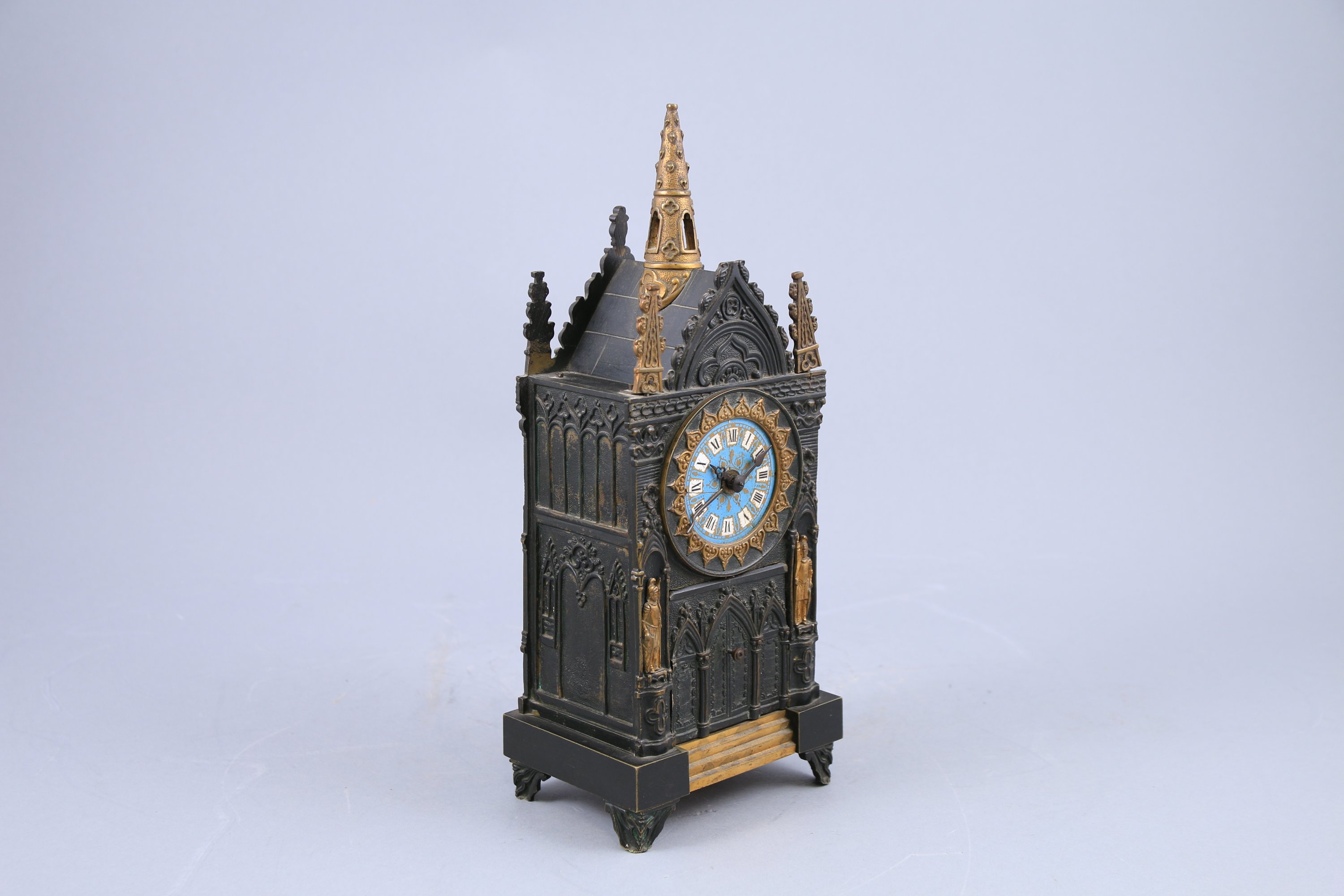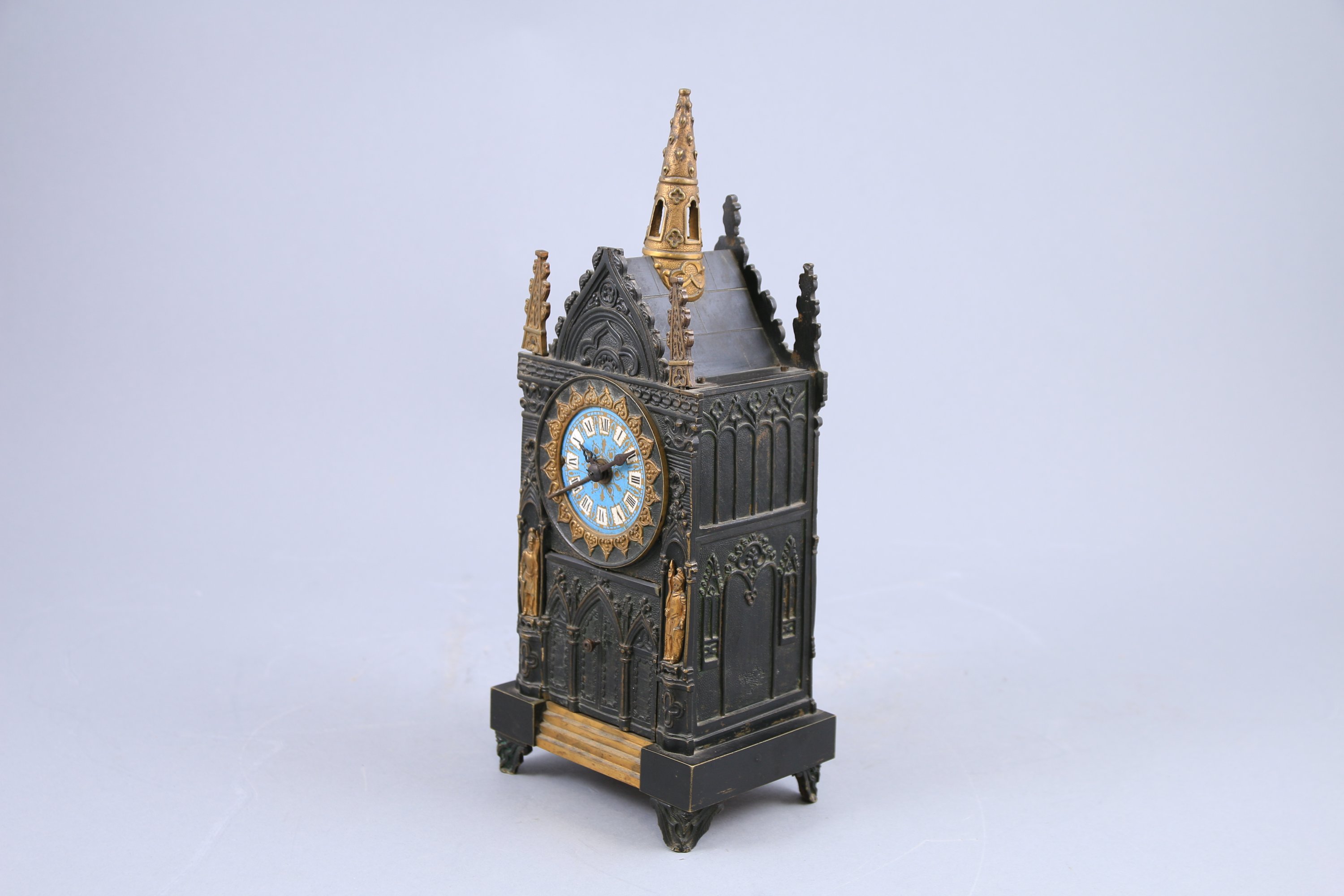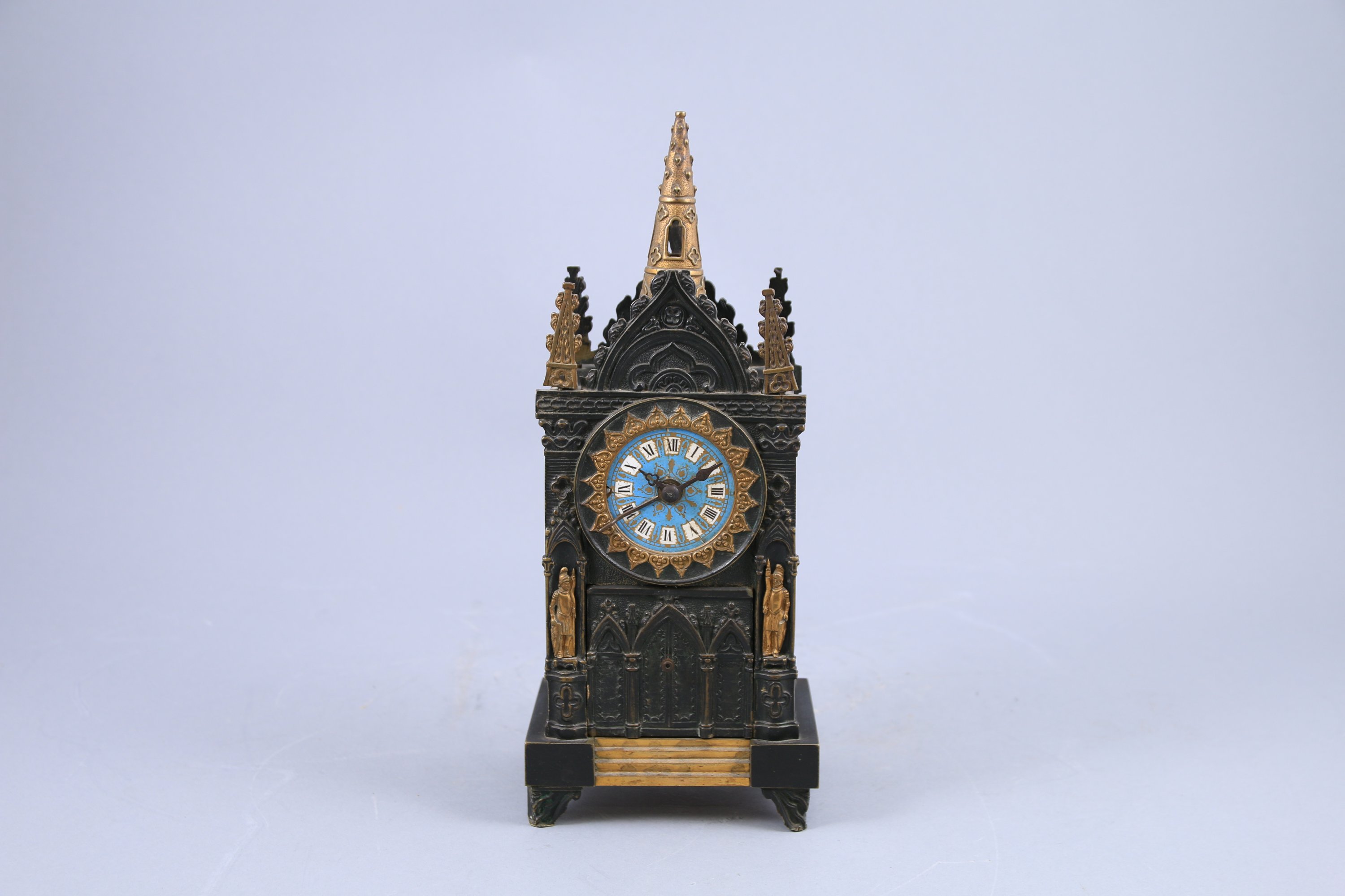 en bronze patiné et doré. De forme rectangulaire un portail à la cathédrale est orné d'une pendule-réveil au cadran émaillé turquoise avec les heures en chiffres romains. Flanqué de deux figures de chevalier armés le cadran surmonte un tiroir dans lequel figure l'emplacement de deux godets formant écritoire.
