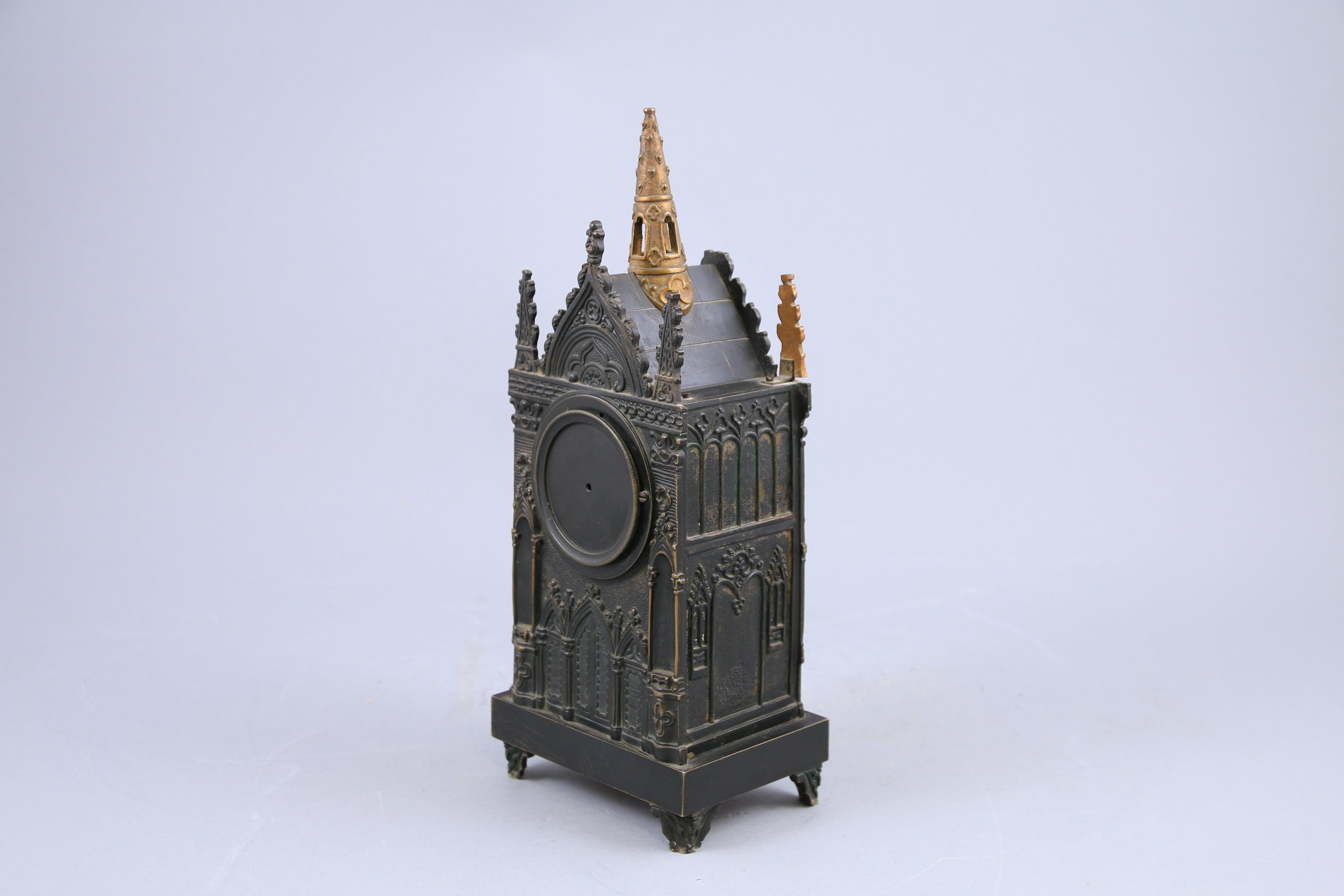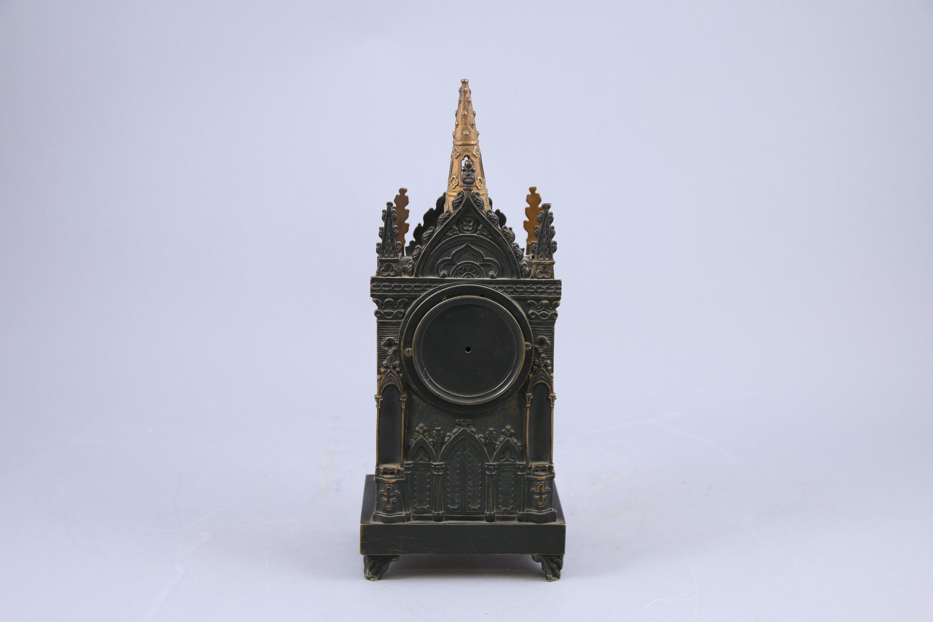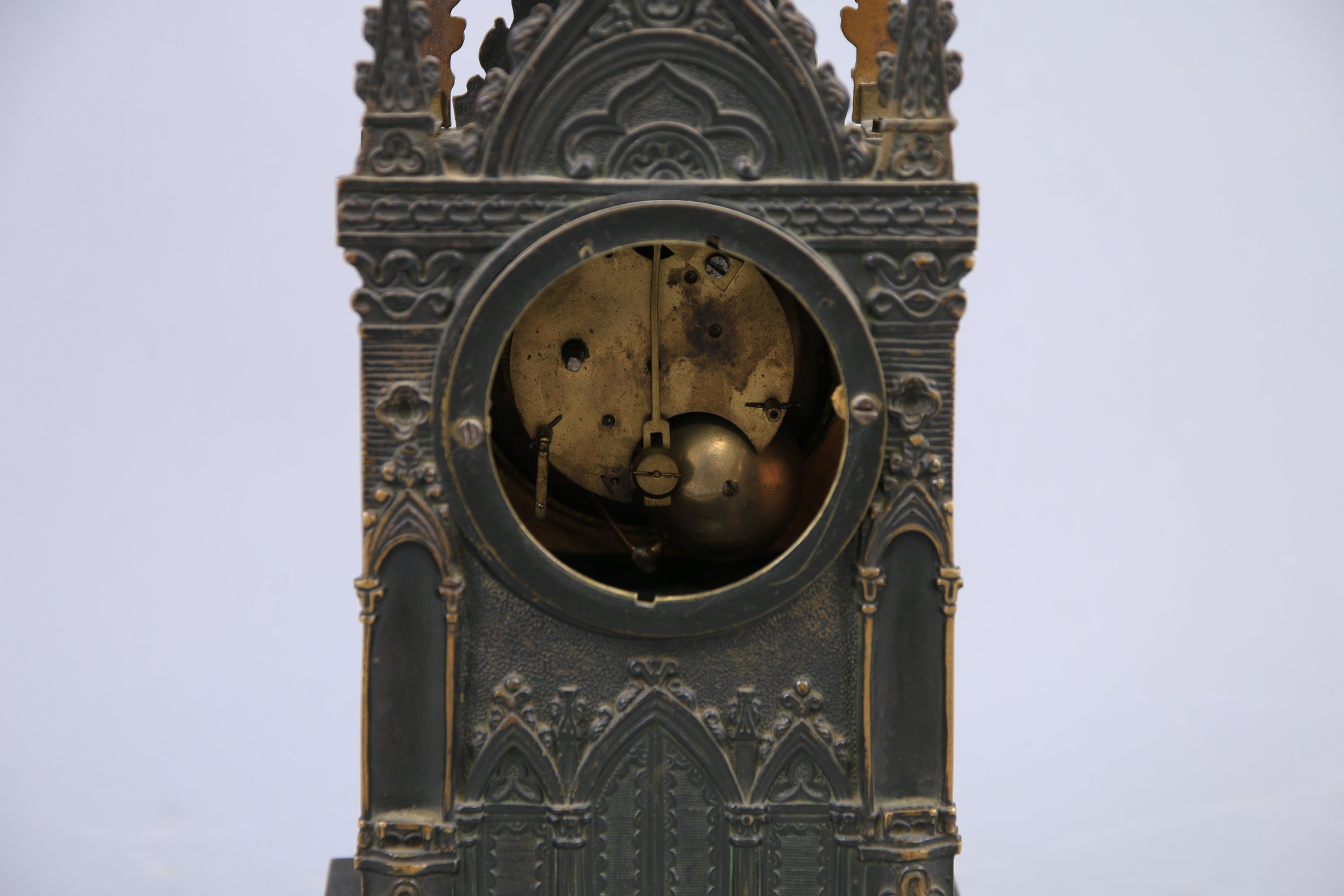 en bronze patiné et doré. De forme rectangulaire un portail à la cathédrale est orné d'une pendule-réveil au cadran émaillé turquoise avec les heures en chiffres romains. Flanqué de deux figures de chevalier armés le cadran surmonte un tiroir dans lequel figure l'emplacement de deux godets formant écritoire.