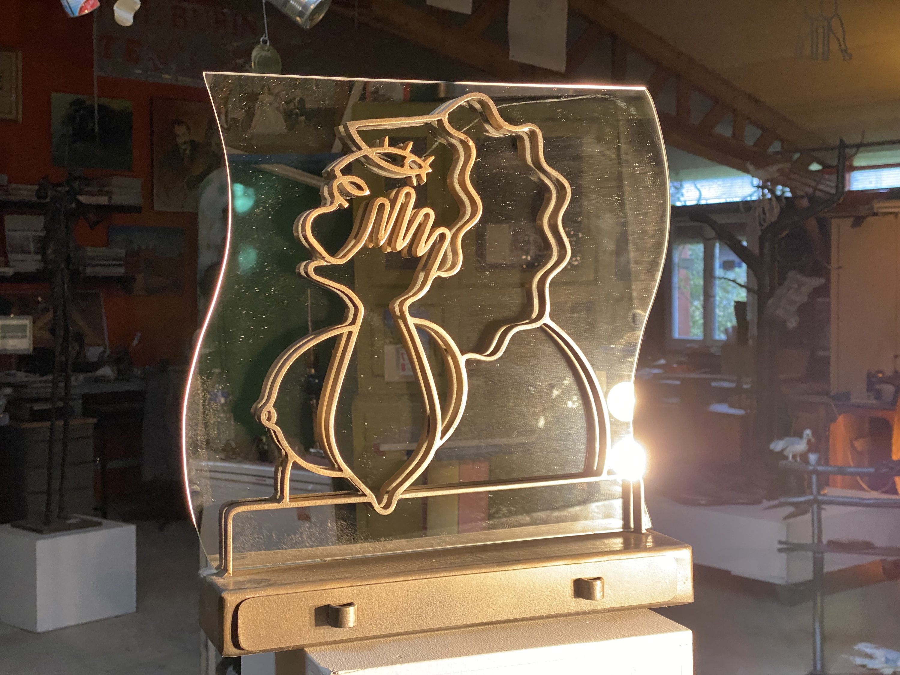 Acier et miroir. La partie inférieure ouvrant par un tiroir.