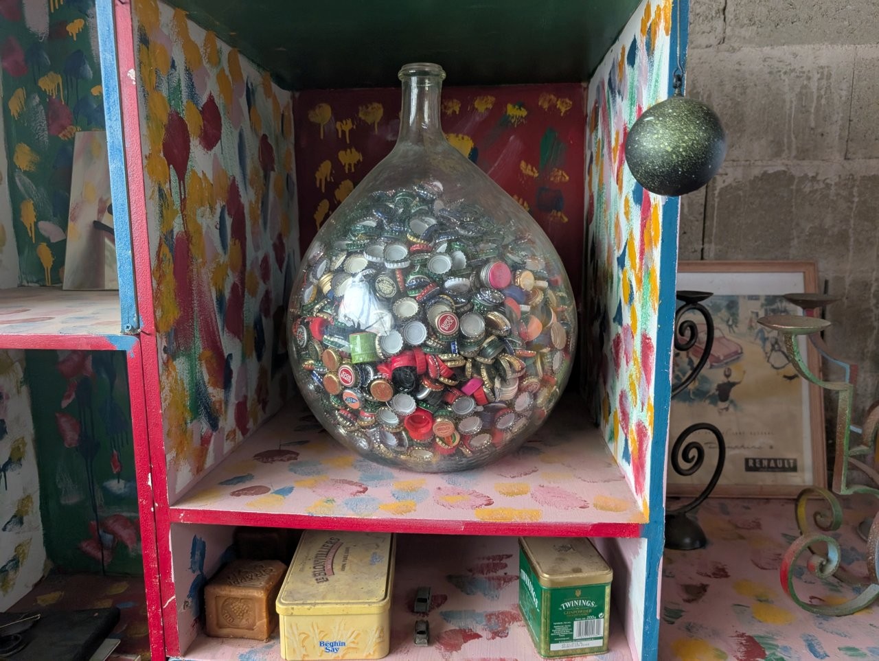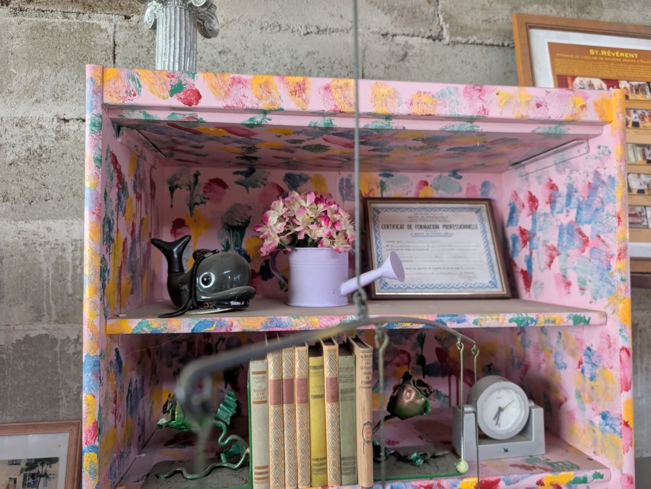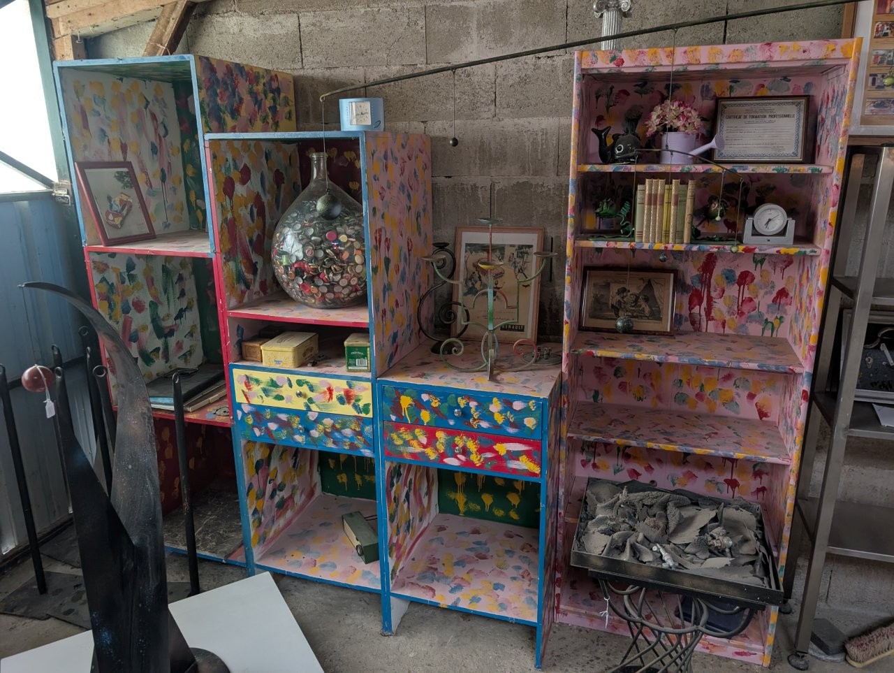 en bois peint à casiers et tiroirs avec les sculptures et bibelots posés dessus.
